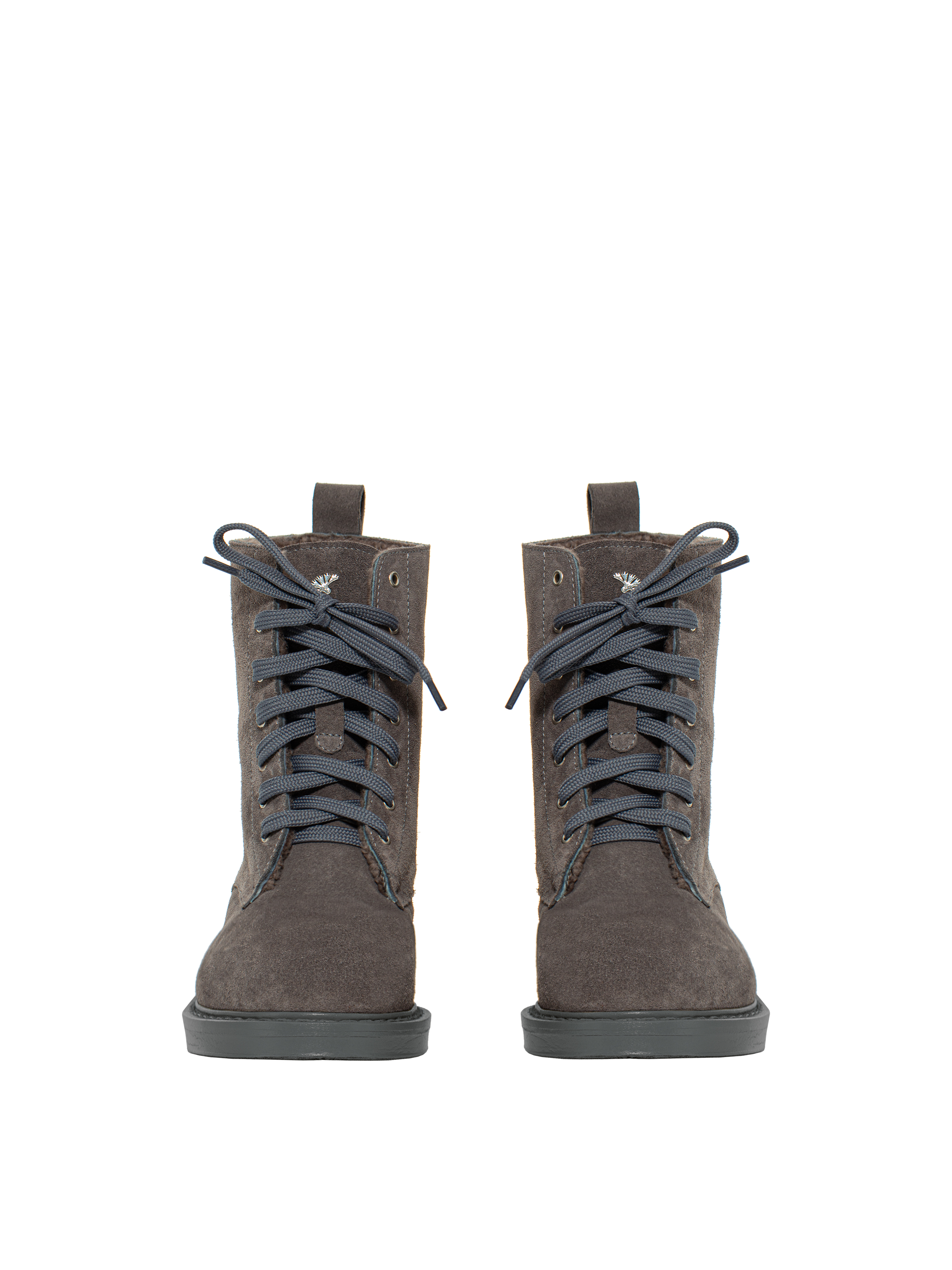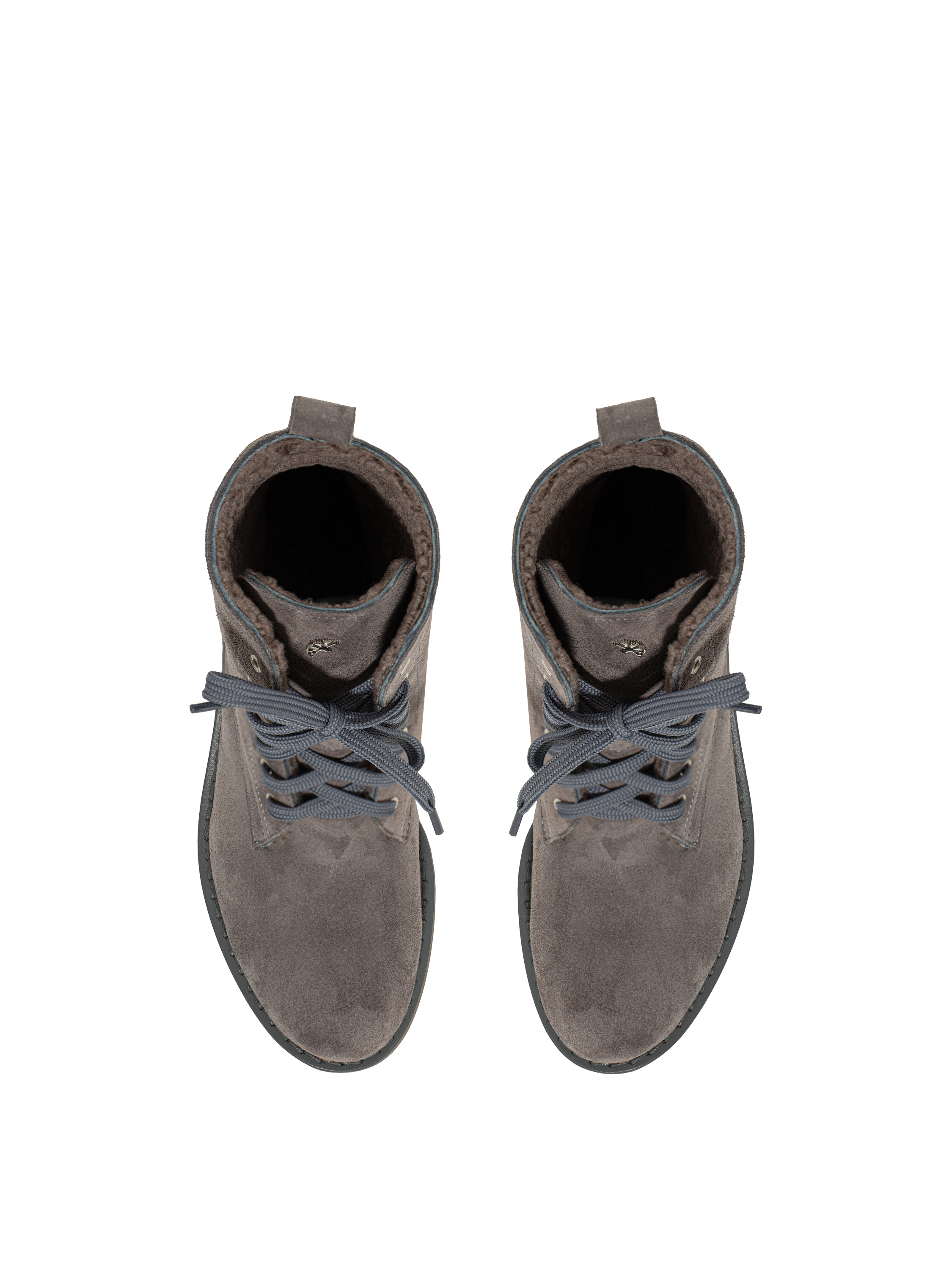 High monochrome grey boots with a round toe are crafted from soft velour. The model is insulated with matching fur that maintains an optimal body temperature. The thick sole is made of pressed leather and protected by a rubber tread.