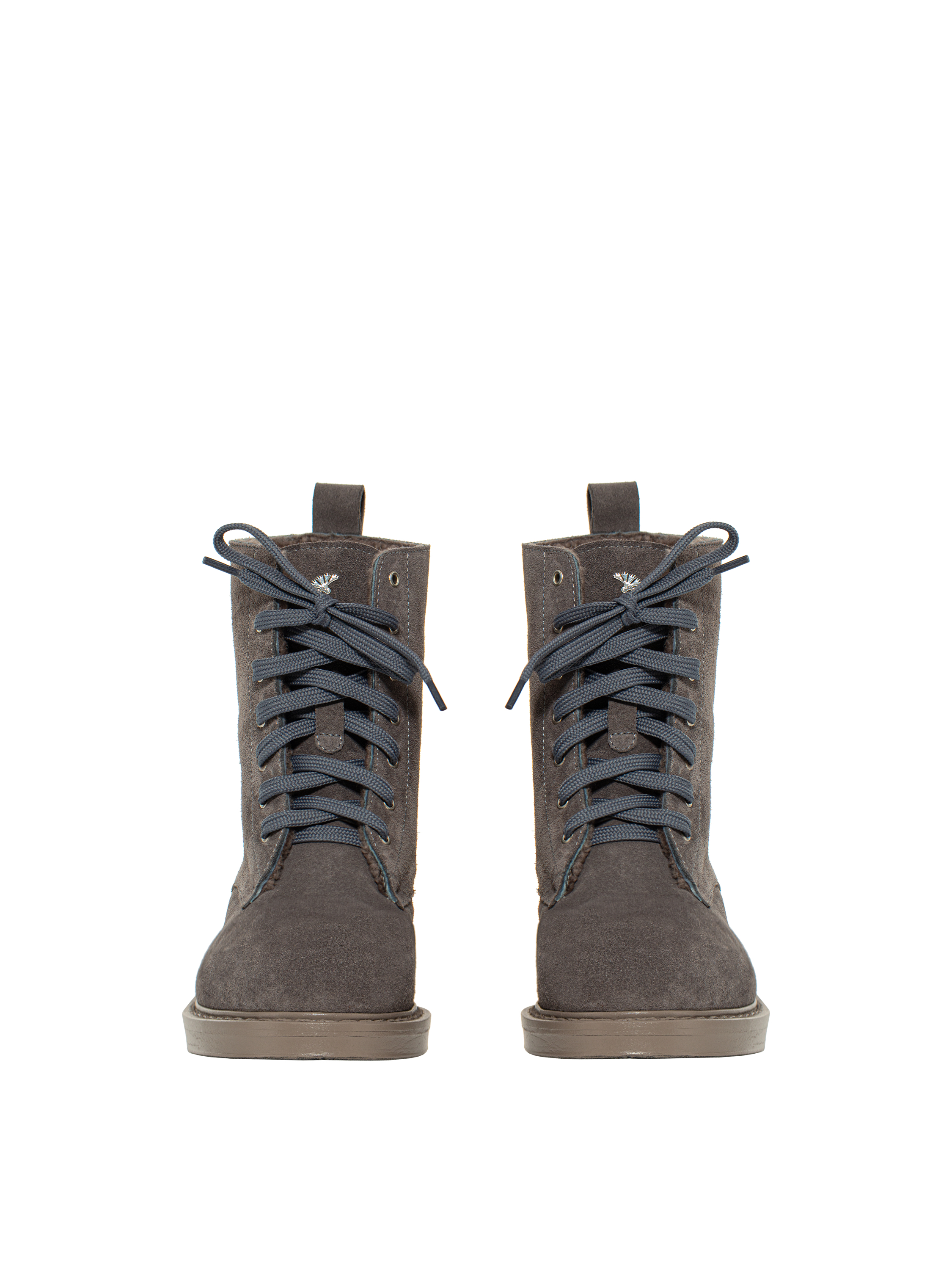 High grey boots with a round toe are crafted from soft velour. The model is insulated with matching fur that maintains an optimal body temperature. The thick sole is made of pressed leather and protected with a rubber tread.