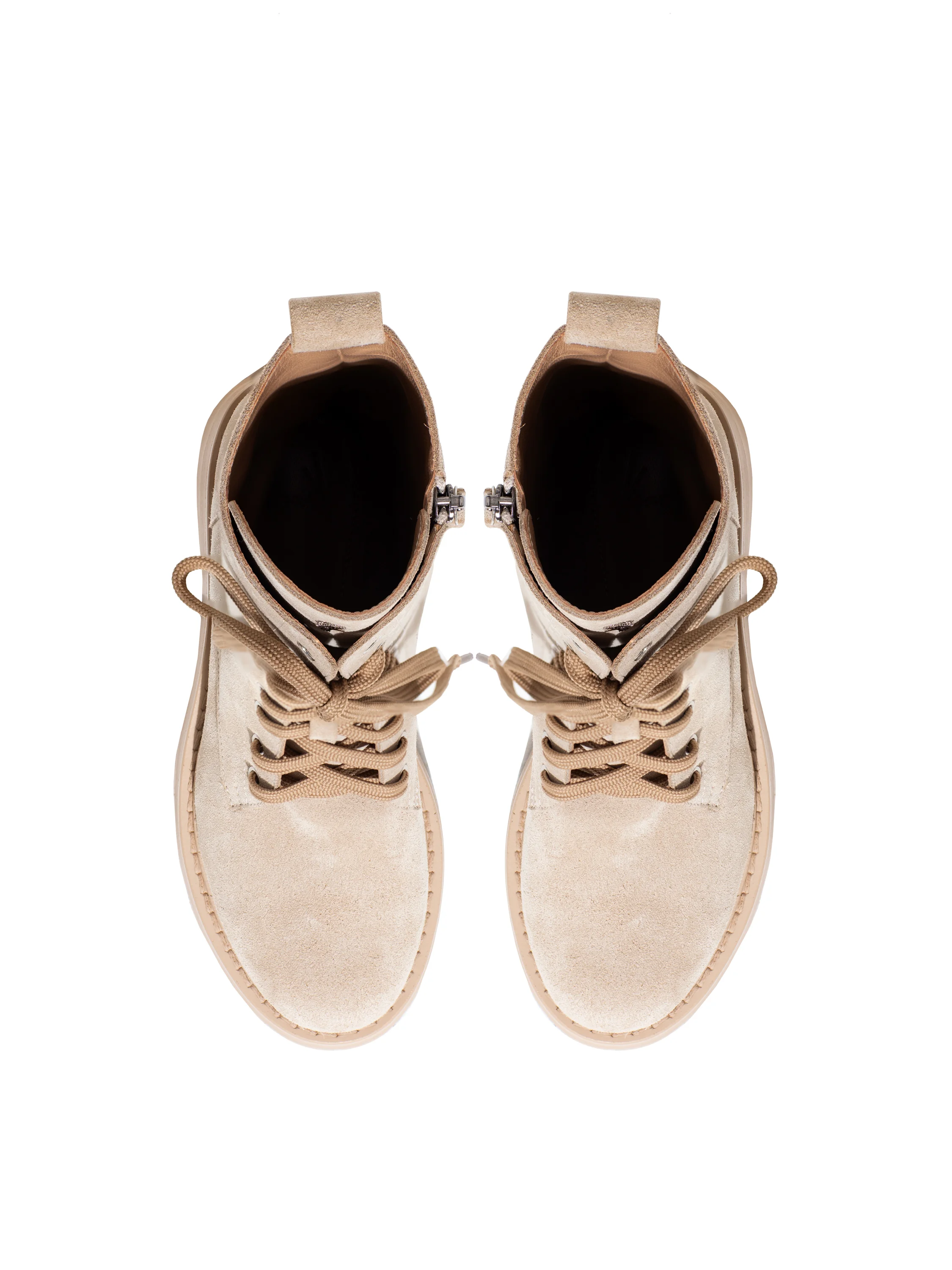 High beige lace-up boots made of genuine suede will go with everything in your wardrobe and elevate your everyday outfit to a new level. The model is complemented by a pull loop on the shaft to make the boots comfortable to take off.