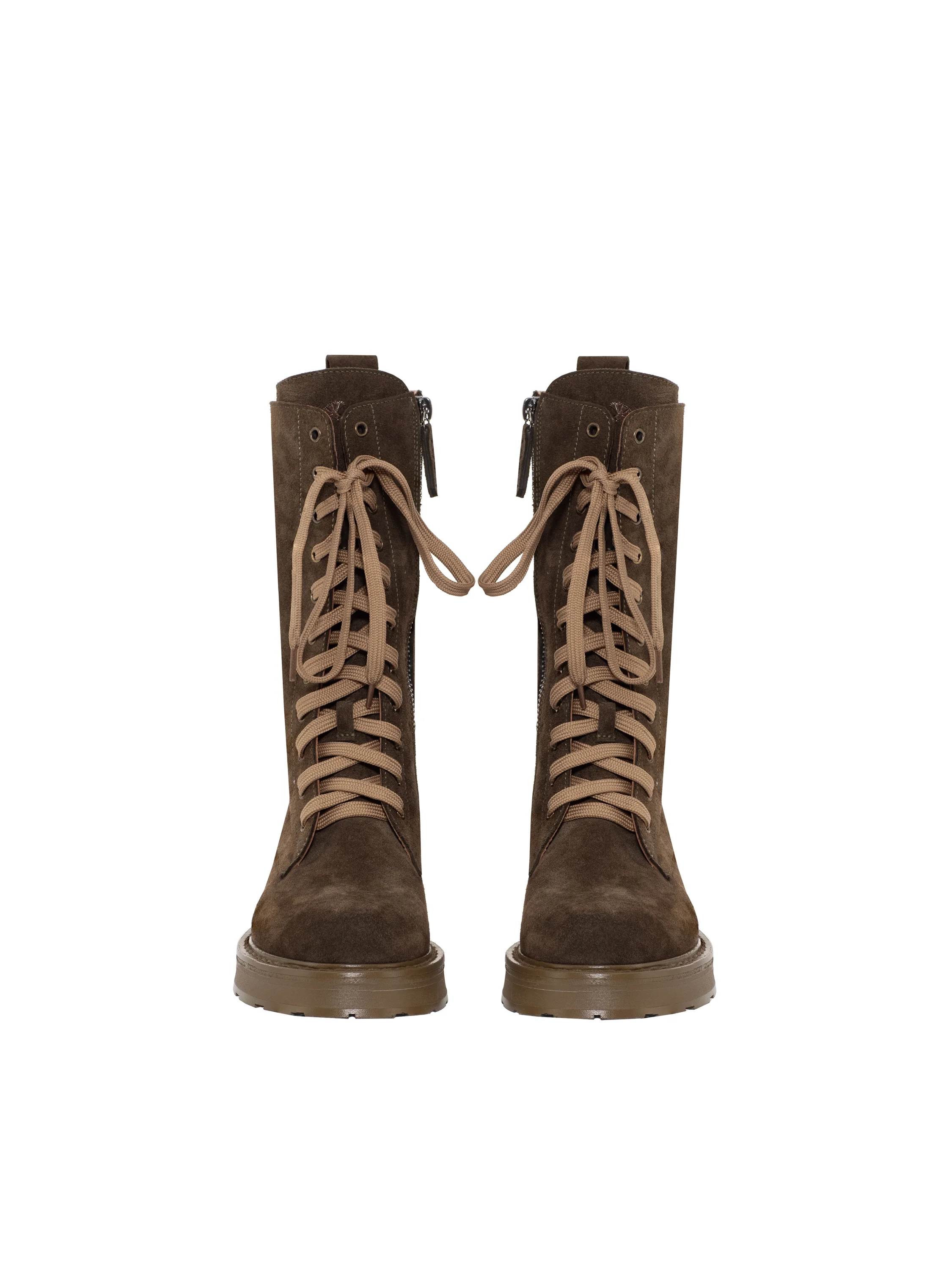 High brown boots with beige laces, made of genuine suede, will go with everything in your wardrobe and elevate your everyday outfit to a new level. The model is complemented by a pull loop on the shaft to make the boots comfortable to take off.