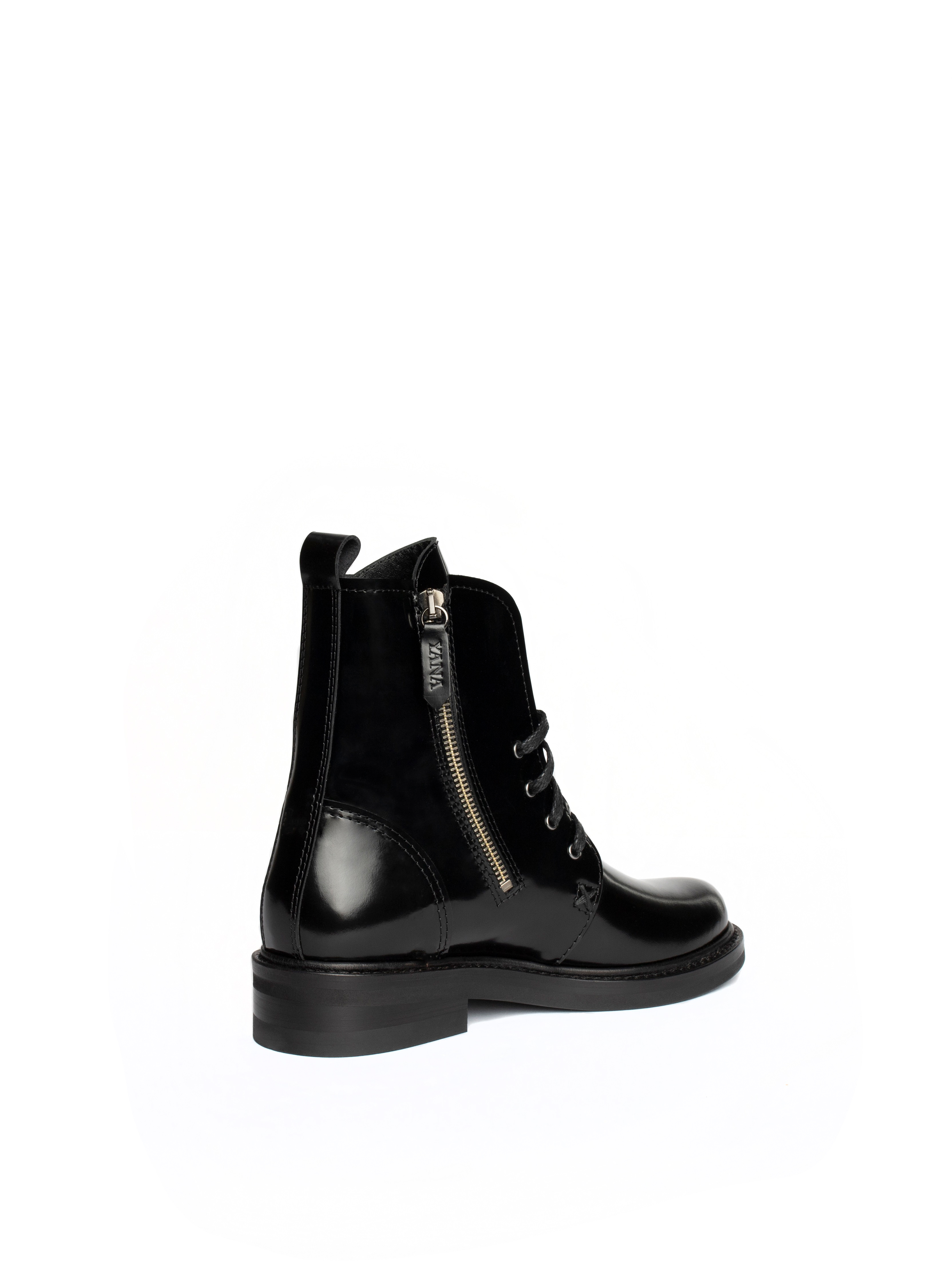 Short lace-up boots in black patent leather, made from natural materials. They pair perfectly with your wardrobe and are suitable for autumn. The model is complemented by a pull loop on the shaft for comfortable removal.