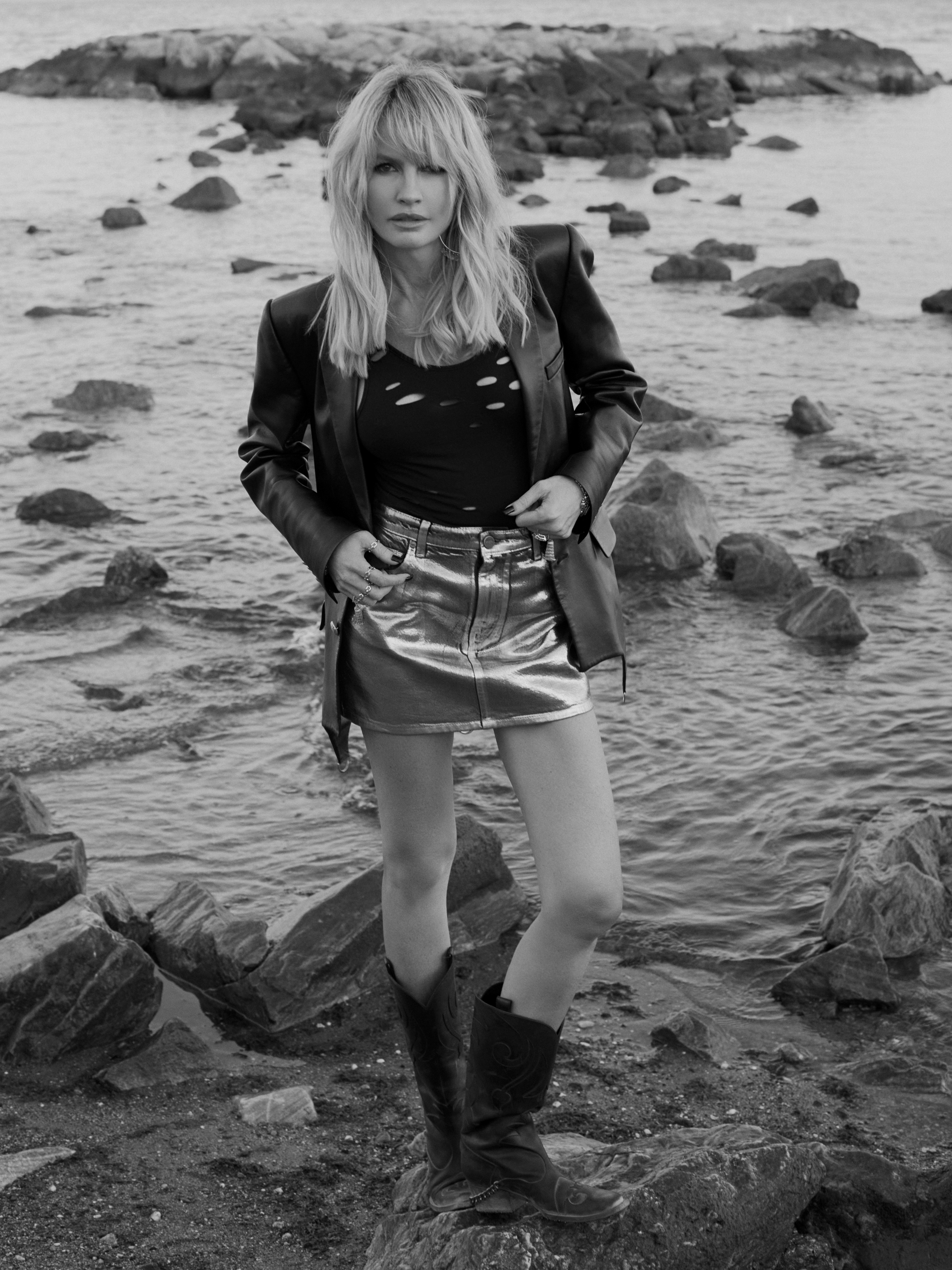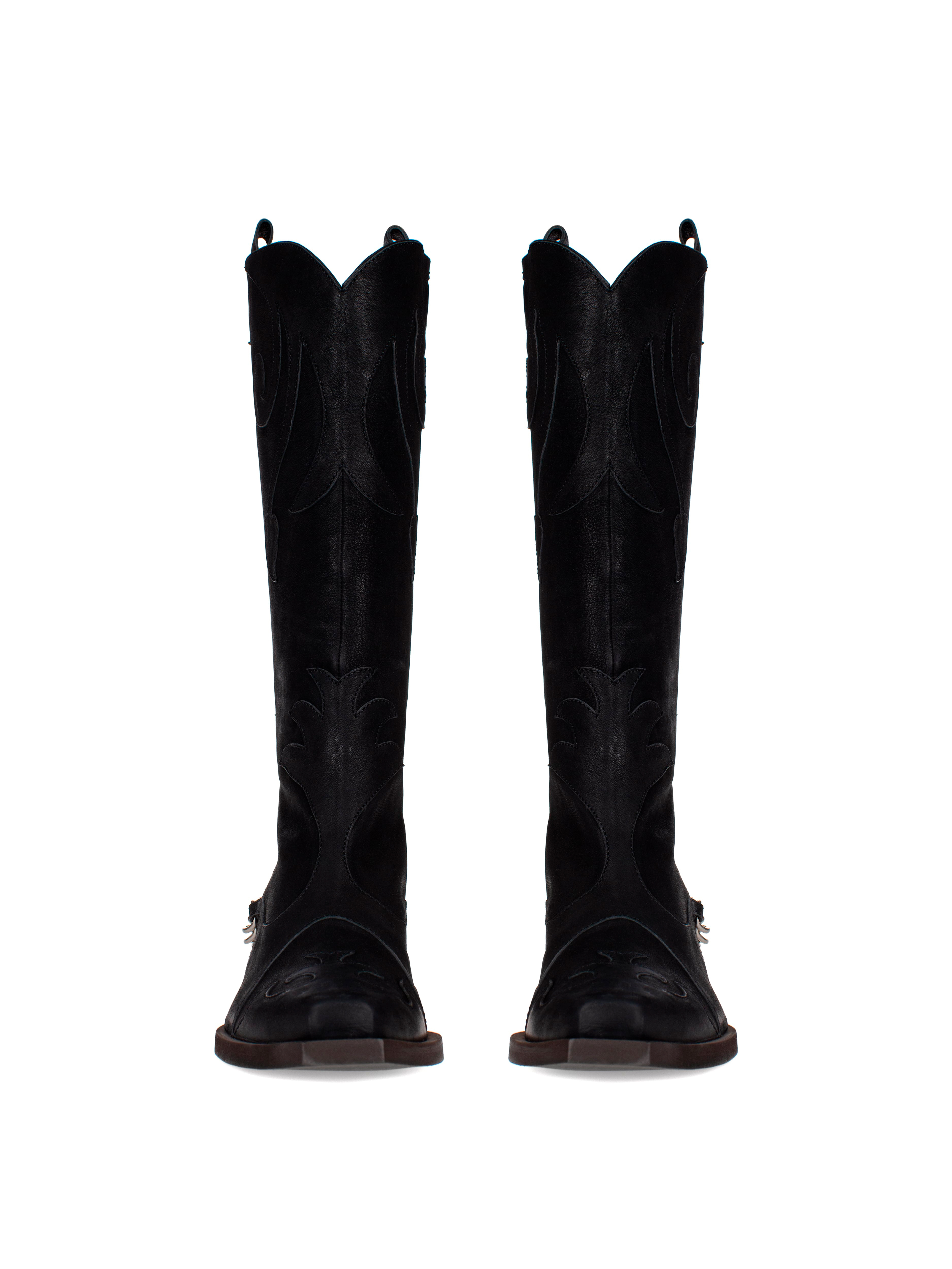Black cowboy boots are a striking example of versatile footwear that pairs equally harmoniously with both jeans and a dress. The brand’s craftsmen made the model from matte leather with a slightly slanted heel. The boots are complemented with shaped details and a black shiny chain.