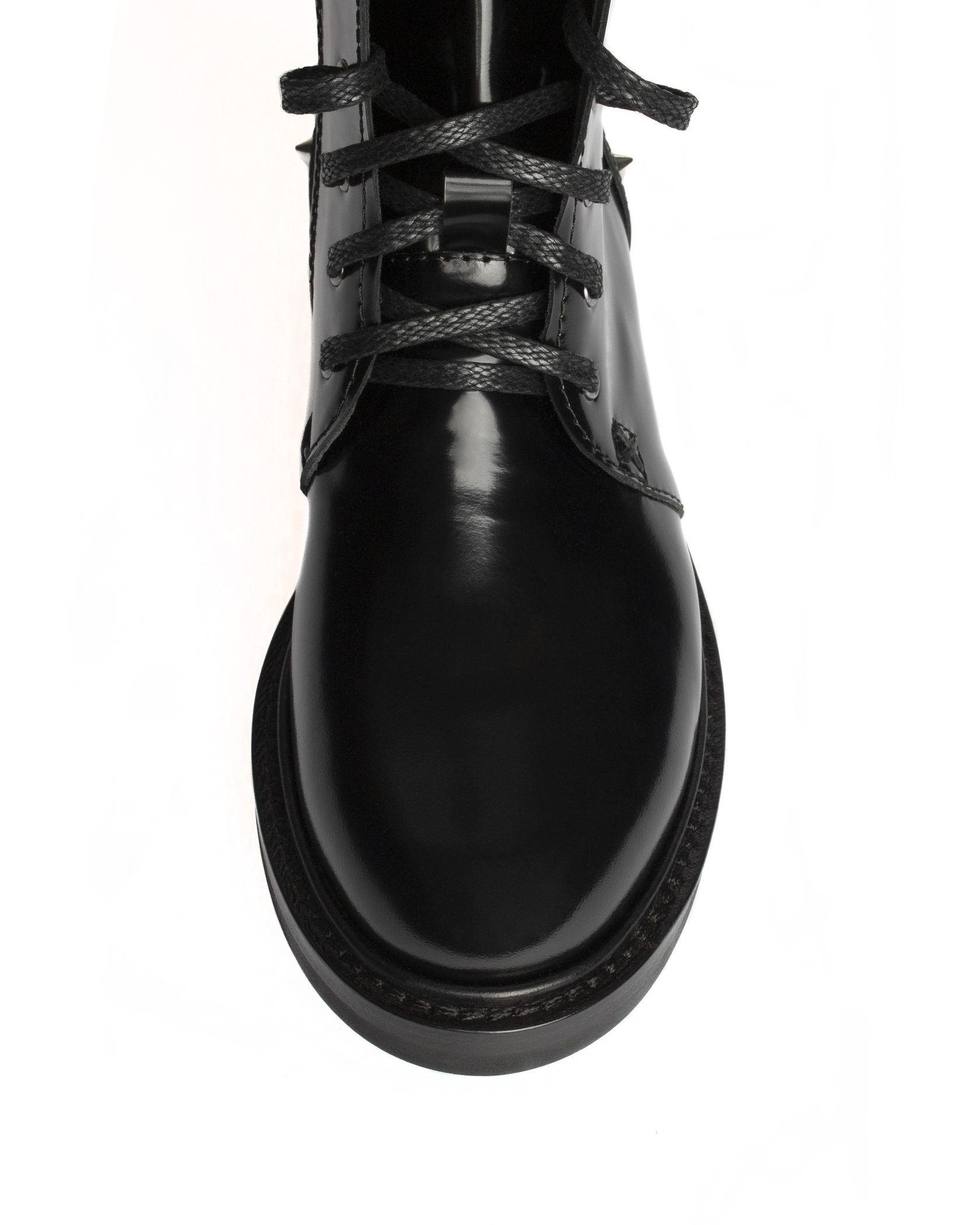 High black lace-up boots with a side zipper. Made of patent leather and decorated with studs on the heel counter.