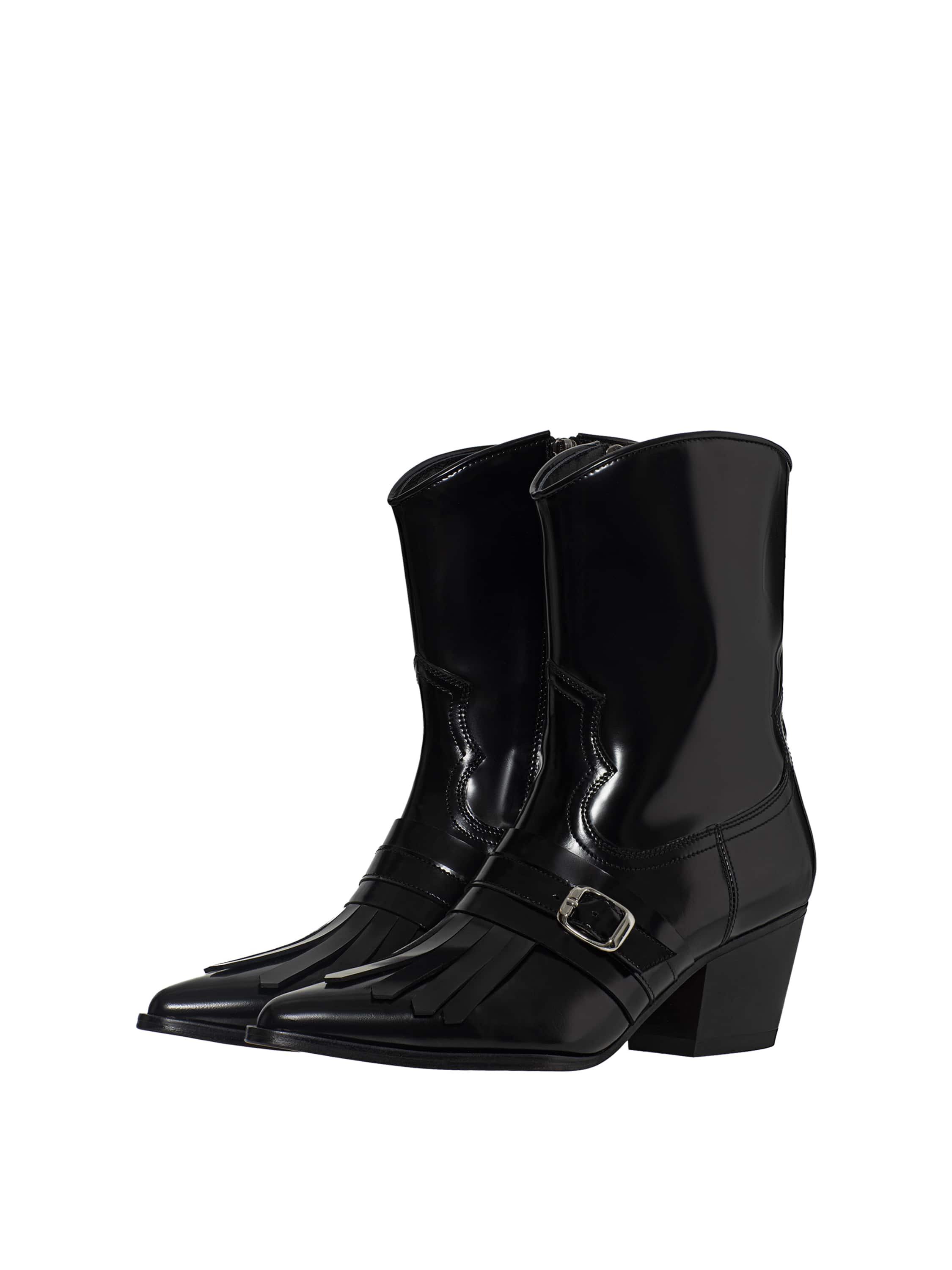 Iconic black cowboy boots from YANA in a new interpretation. The new design refers to the aesthetics of the conquistadors: pointed toe, fringe, and shaped elements. The piece is crafted from patent leather.