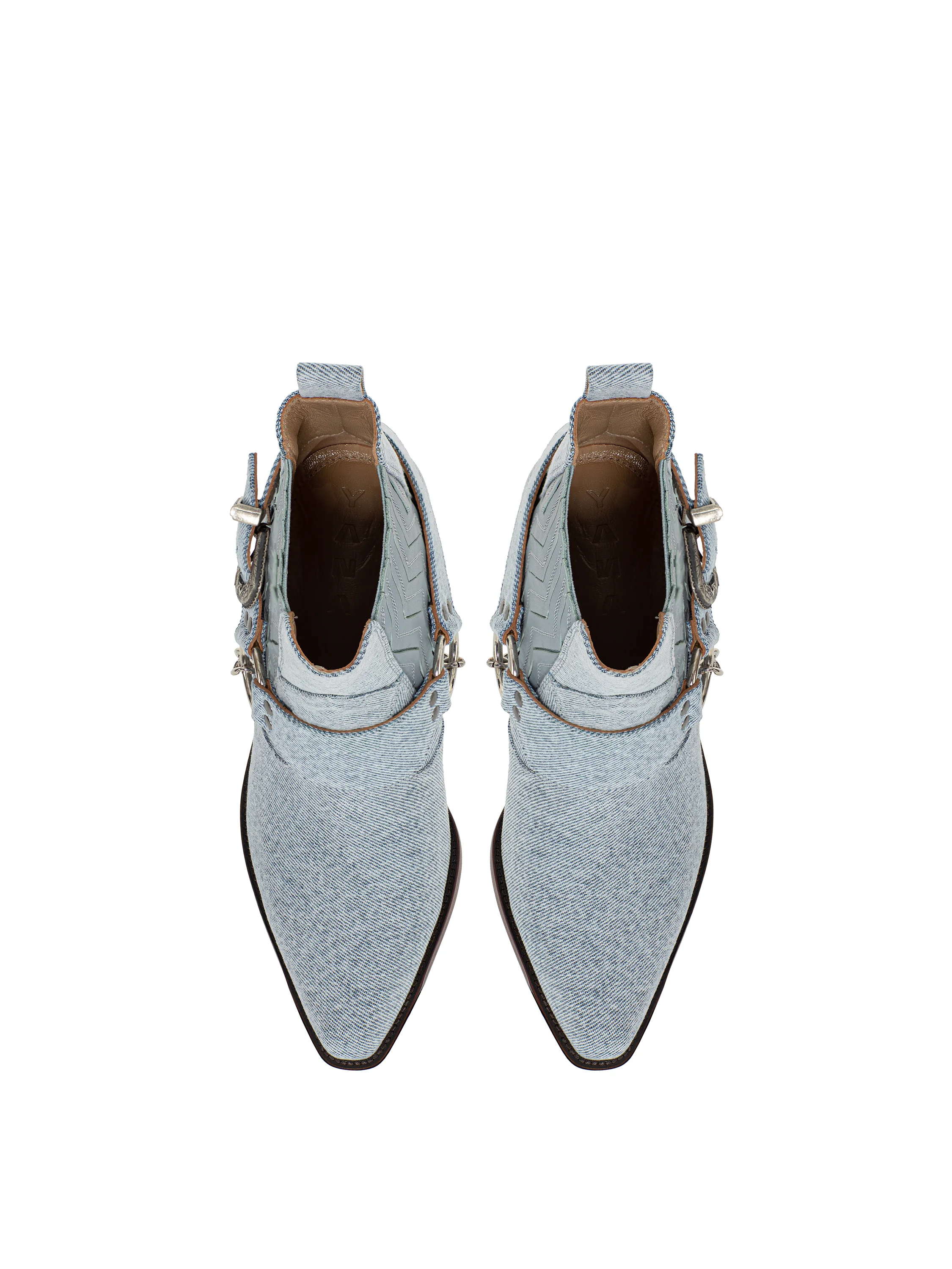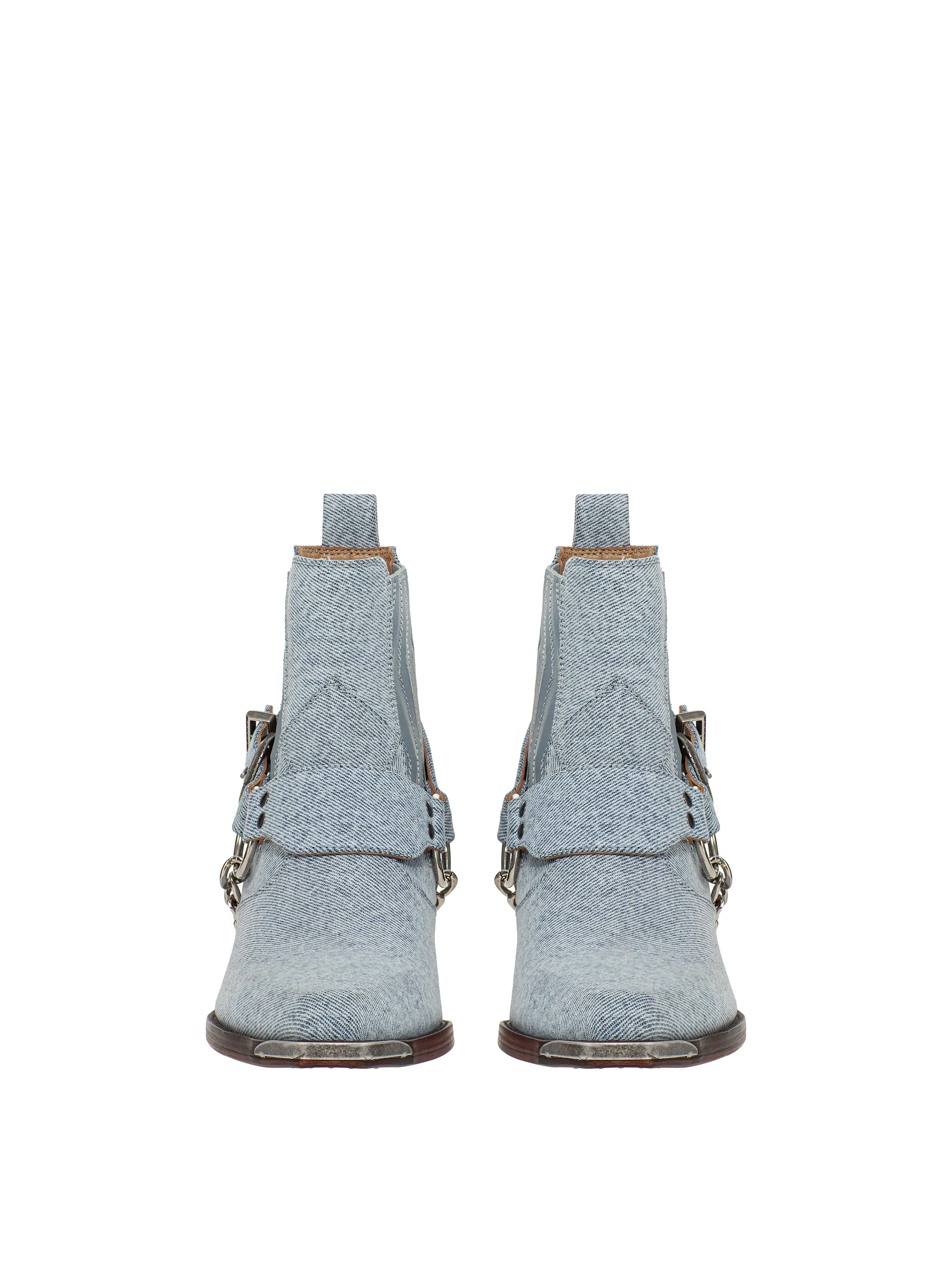 Light blue cowboy ankle boots in washed denim with an elastic insert at the ankle and chain and buckle strap detailing.