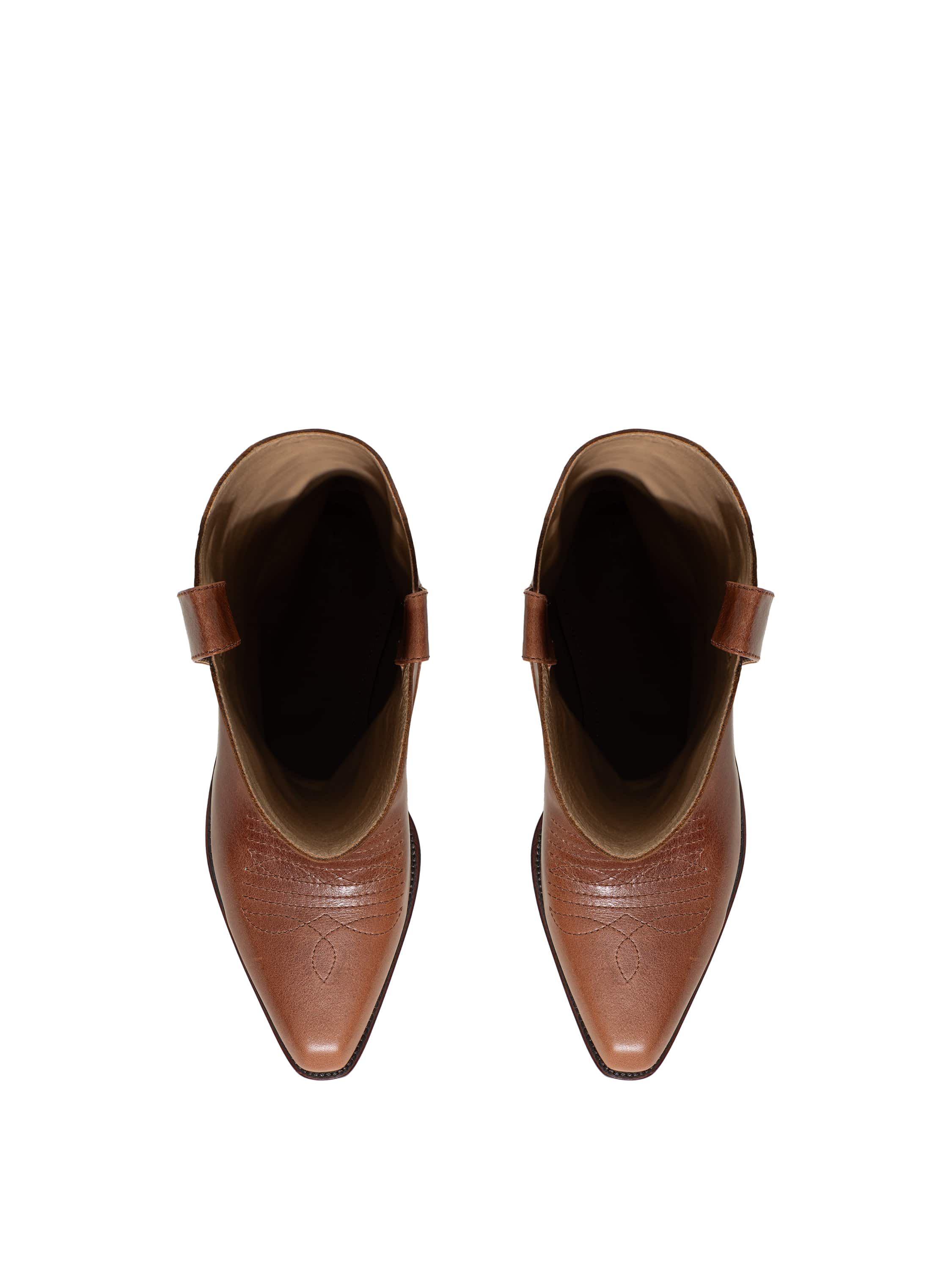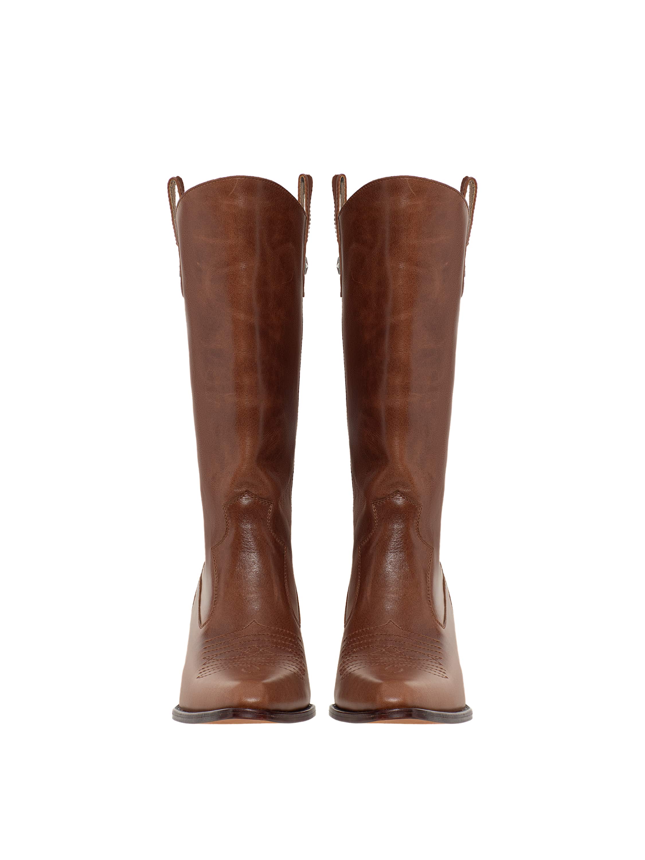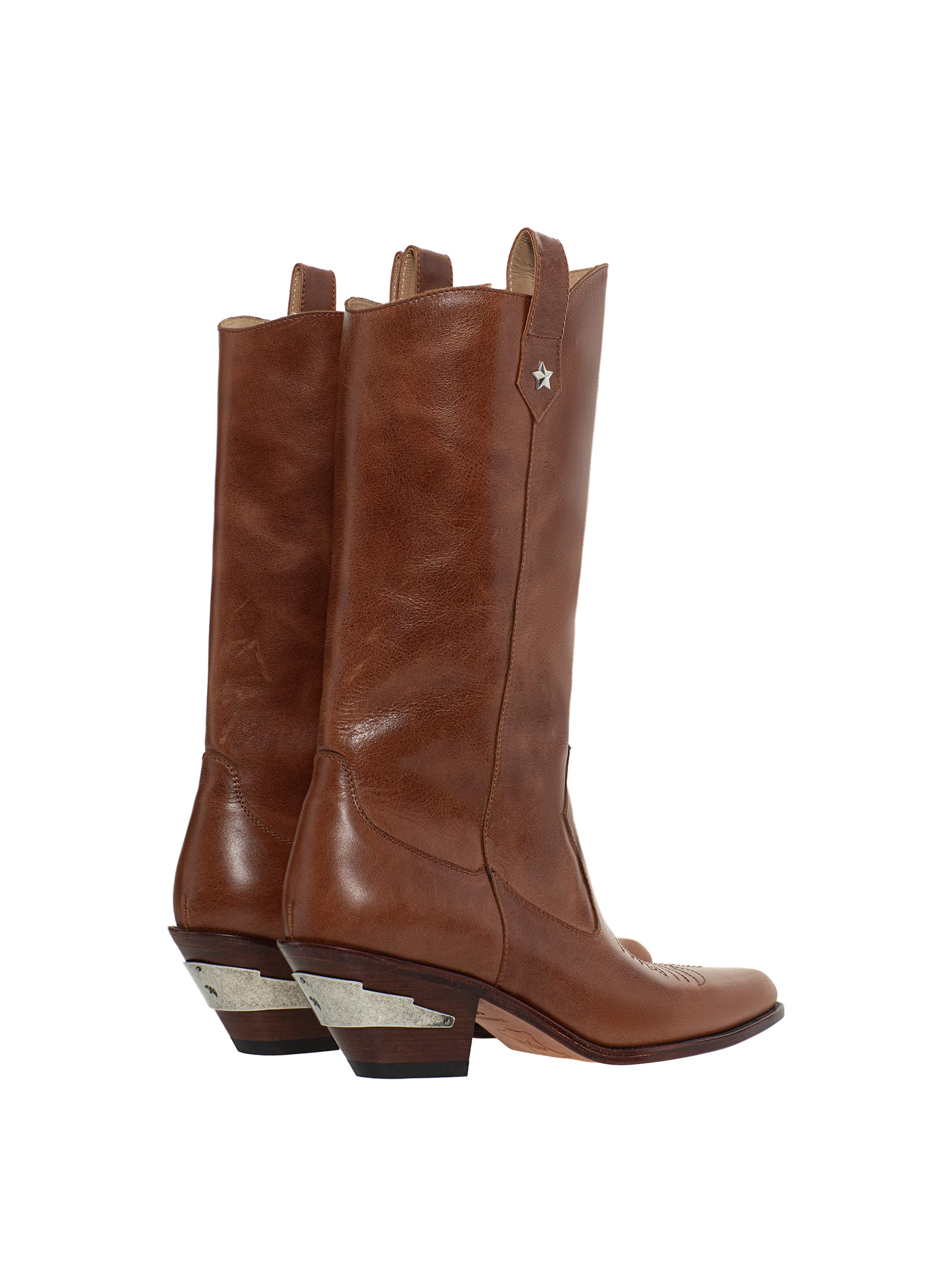 Brown cowboy boots made of genuine leather are comfortable and versatile footwear for an everyday look. The sleek model with minimalist star-shaped decor will pair well both with jeans and with feminine dresses.