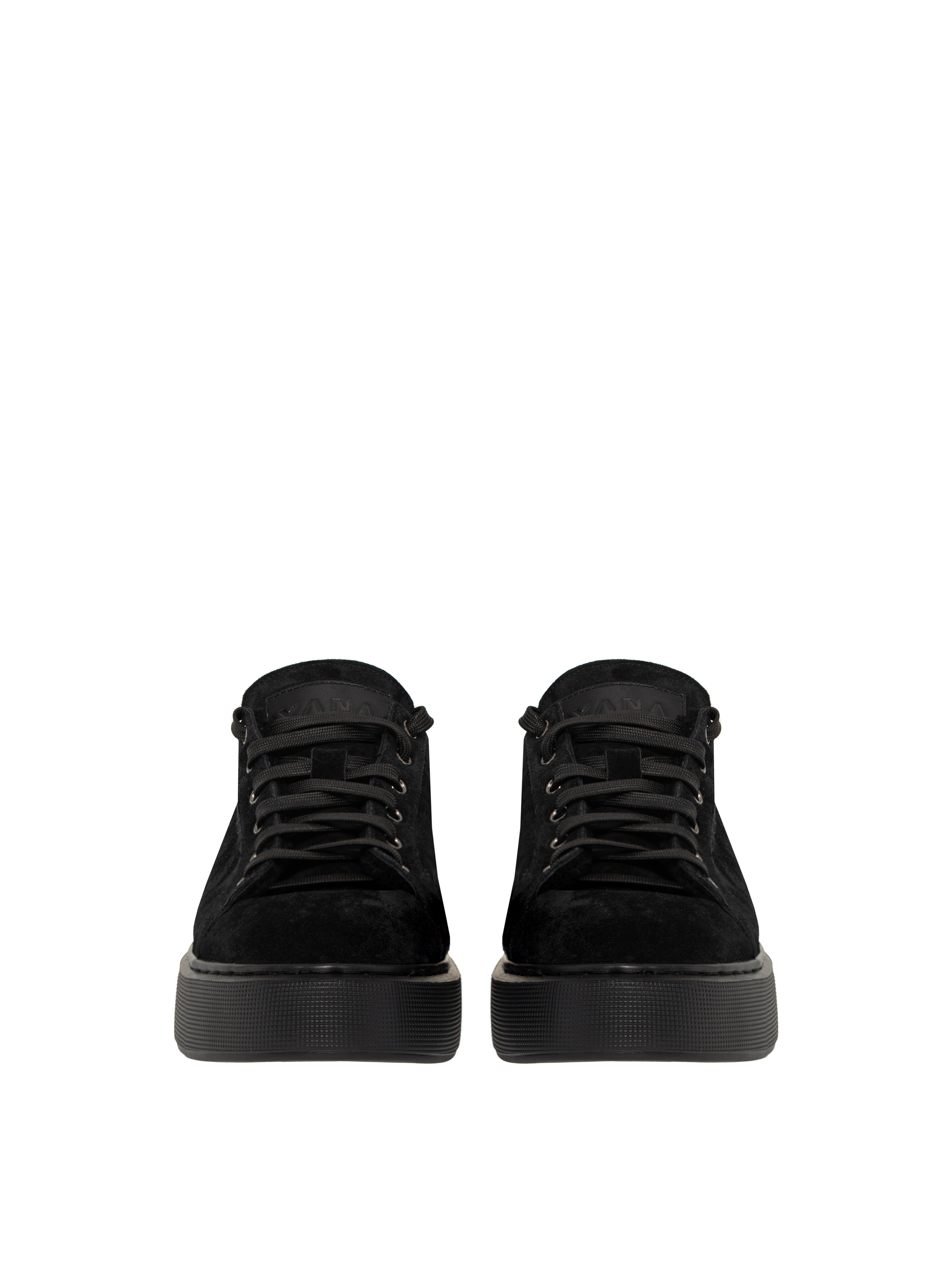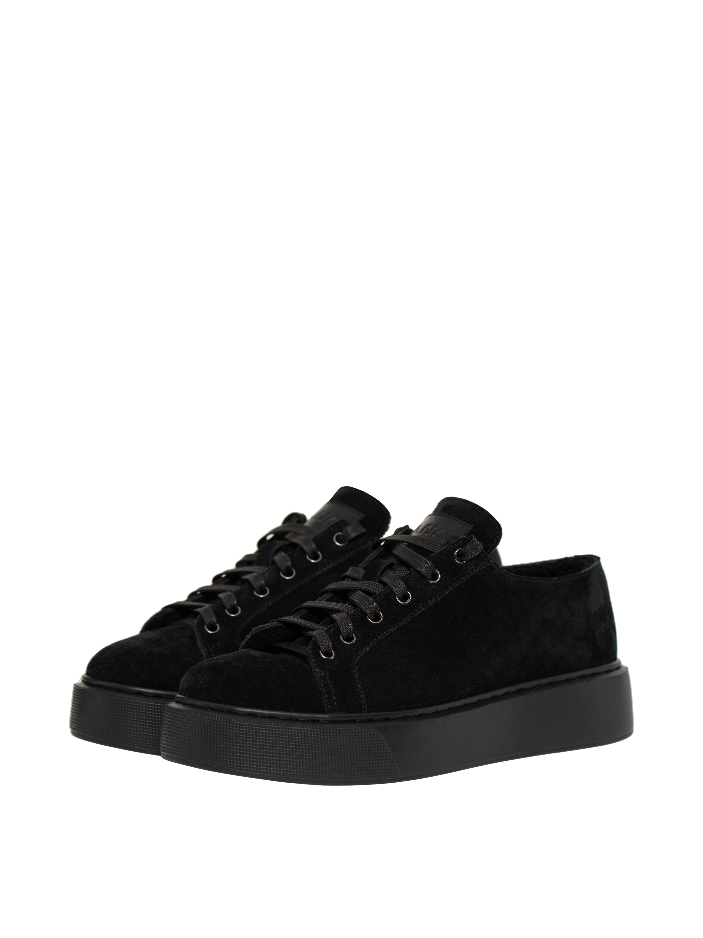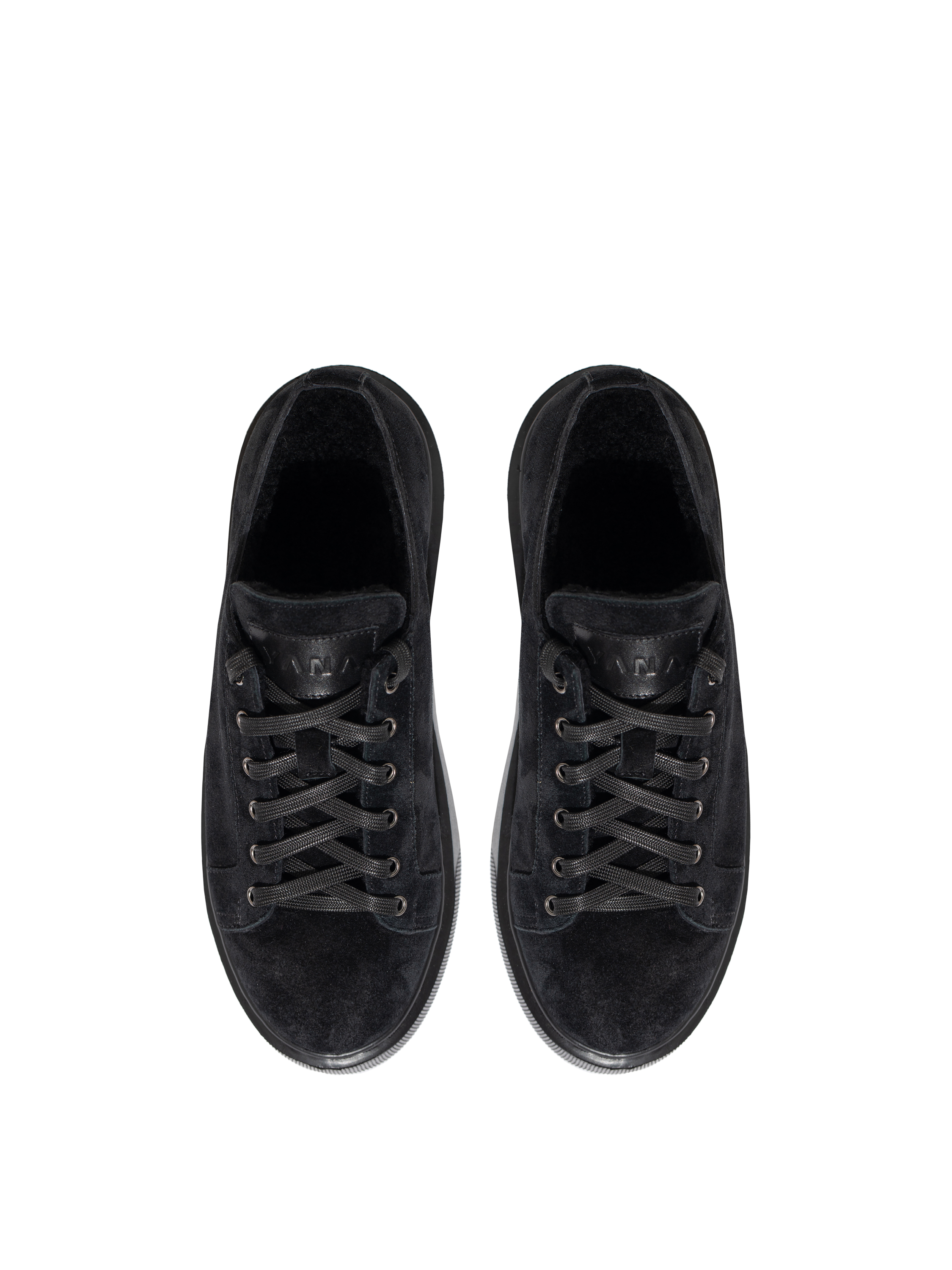 Black suede sneakers with a wide matching sole. The inside is insulated with natural black fur. Decorated with a leather patch with the inscription "YANA" on the tongue.