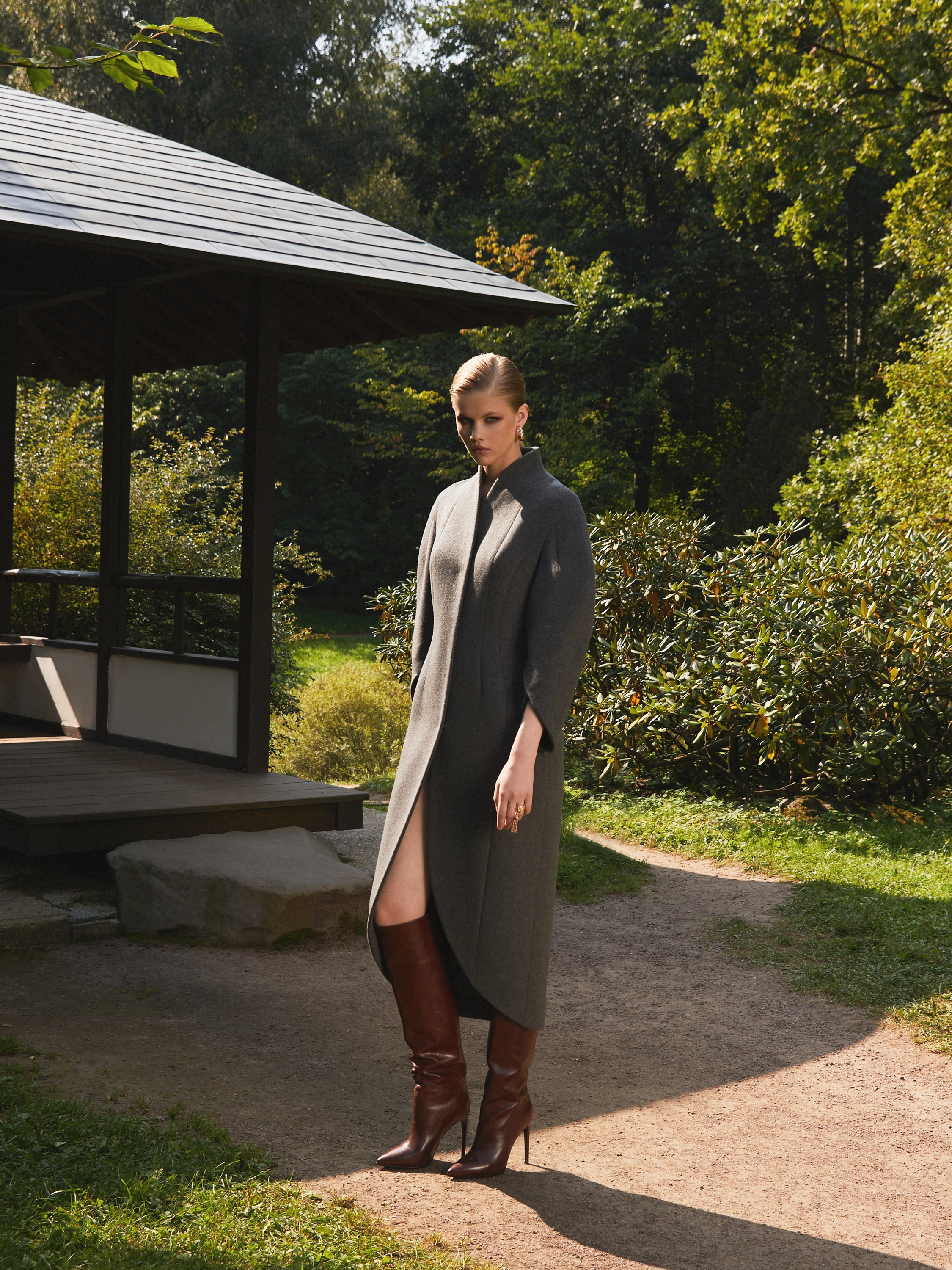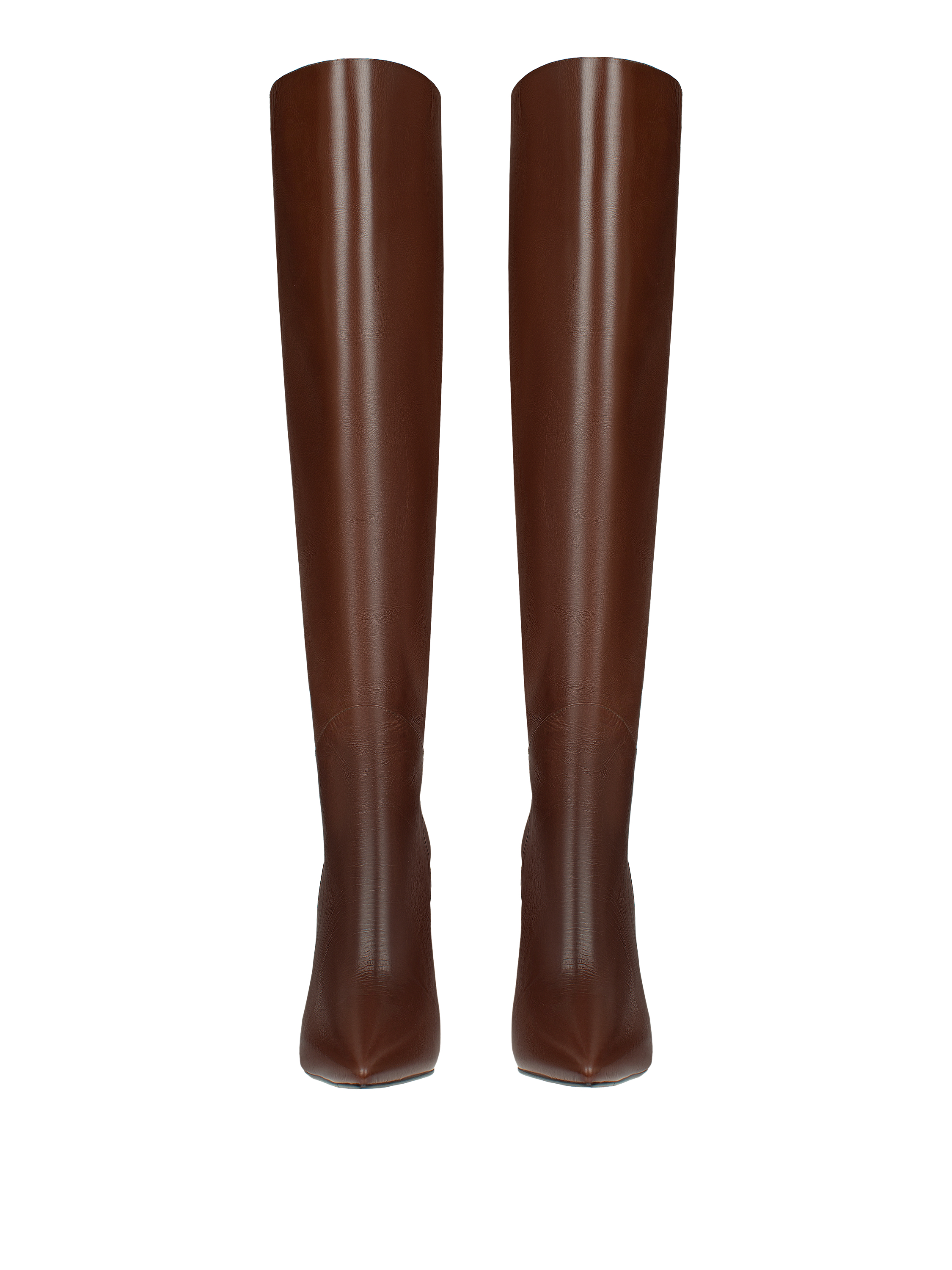 Brown high stiletto-heel boots with a pointed toe will help create a memorable look. Thanks to the wide shaft, the boots without zippers are easy to put on and take off. The model is made of soft, grained leather with a matte sheen.