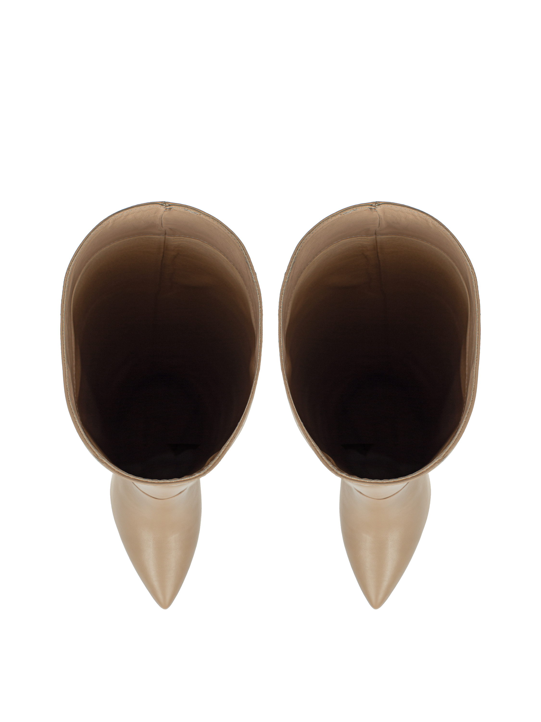 Cream high stiletto-heel boots with a pointed toe will help create a memorable look. Thanks to the wide shaft, the boots without zippers are easy to put on and take off. The model is made of soft, grained leather with a matte sheen.