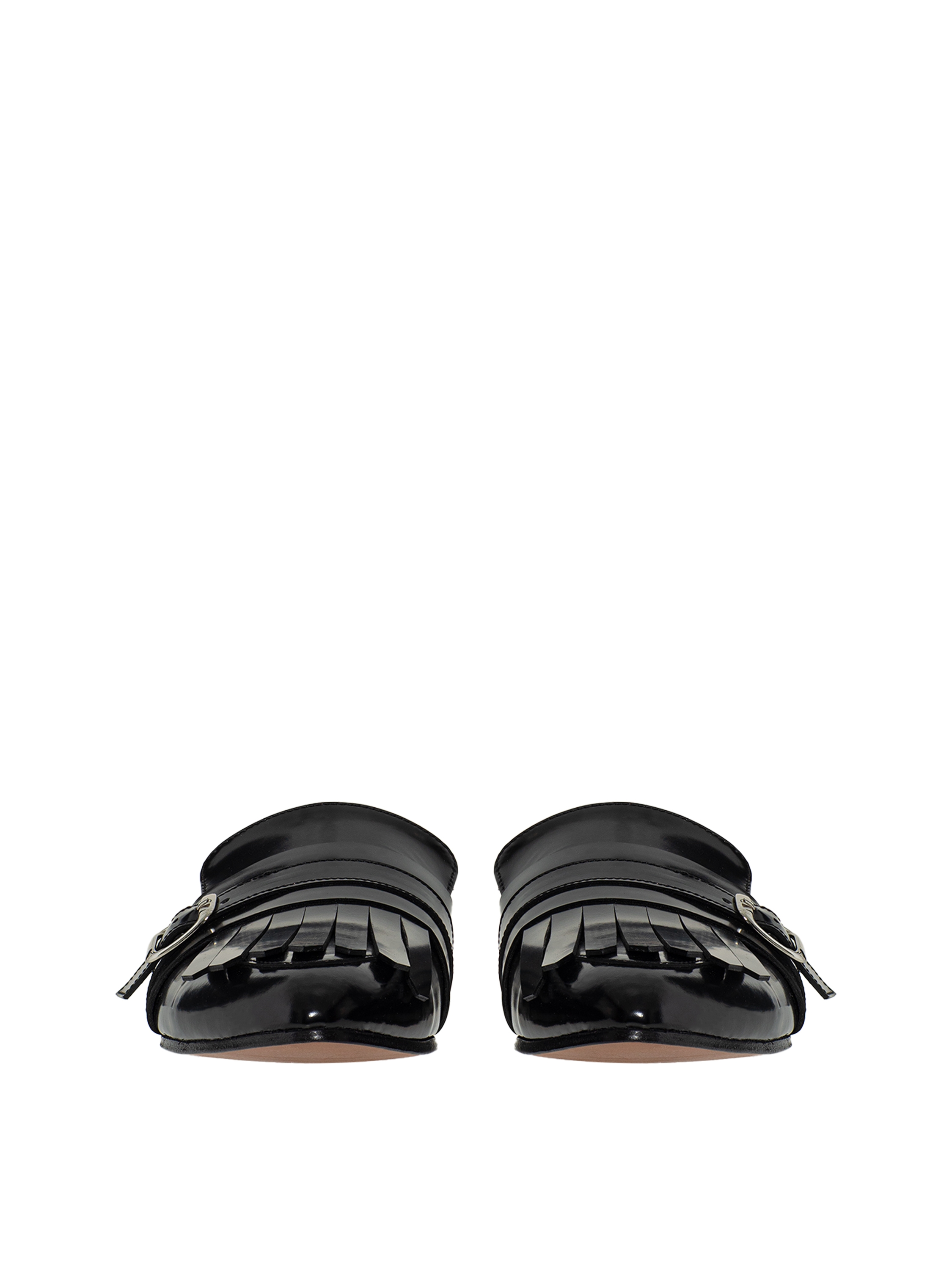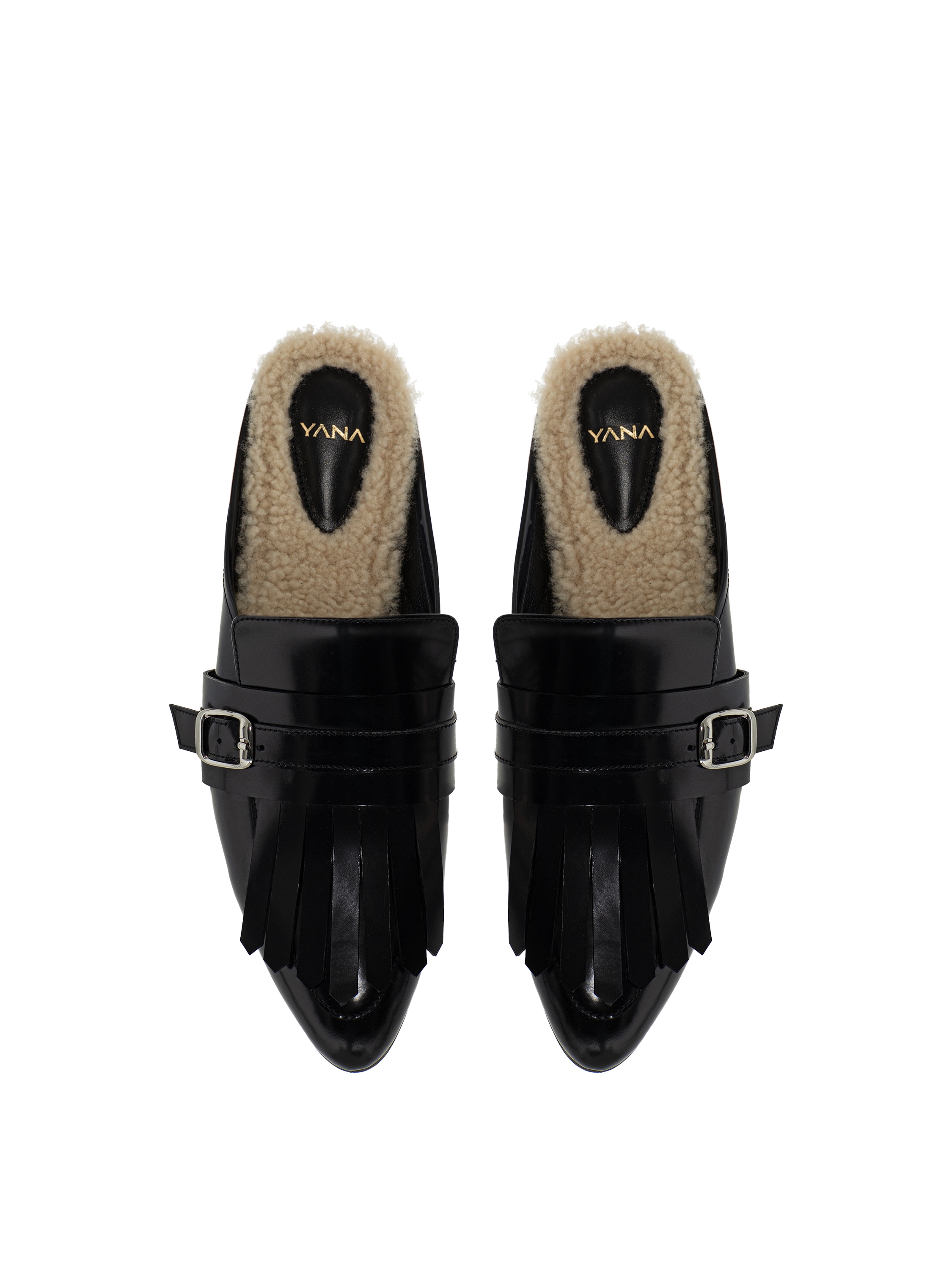 Black leather mules are insulated with an insole made of natural sheepskin fur. The design is complemented by fringe and buckles. This footwear is ideal both for a strict suit and for an everyday look.
