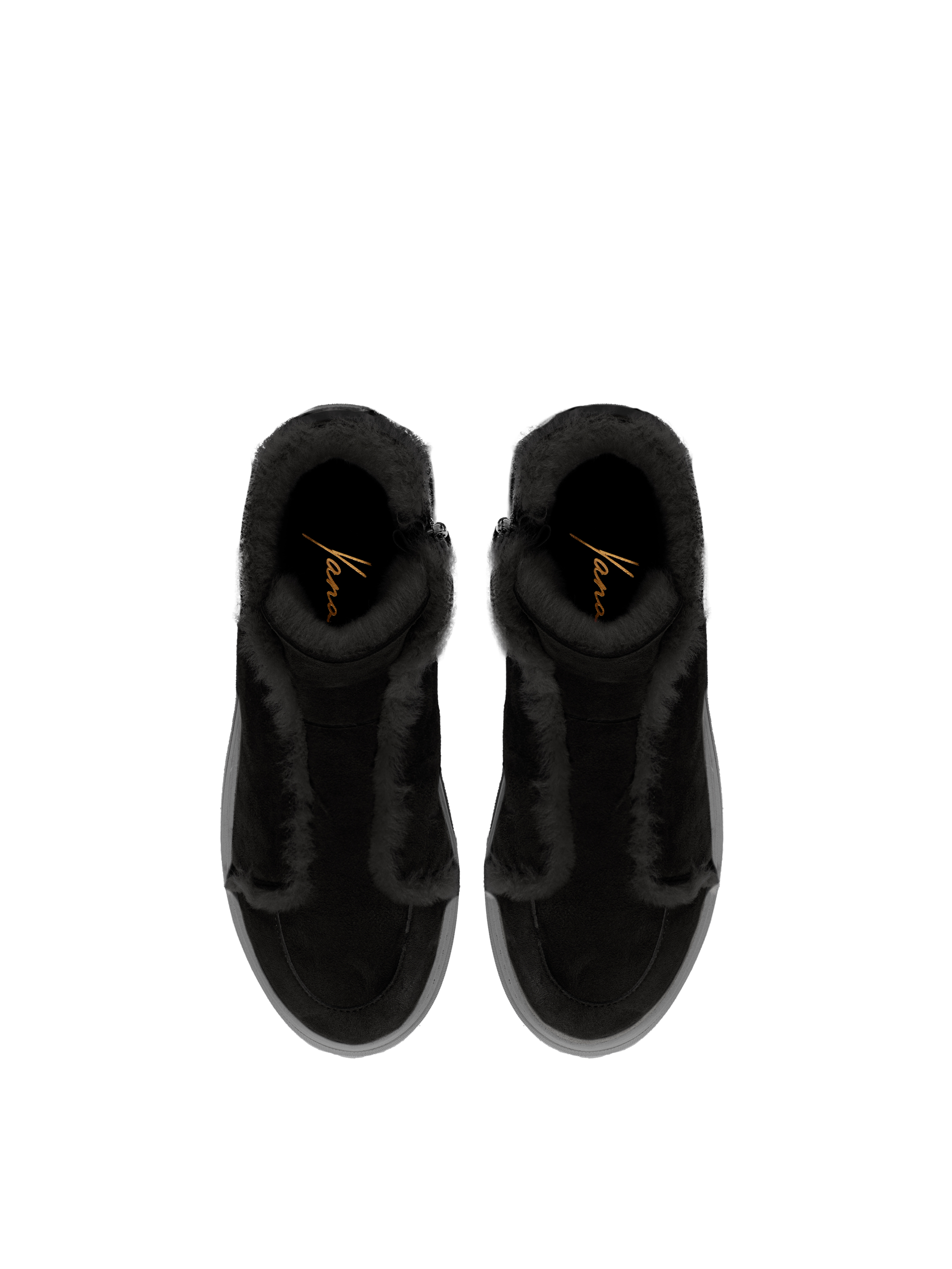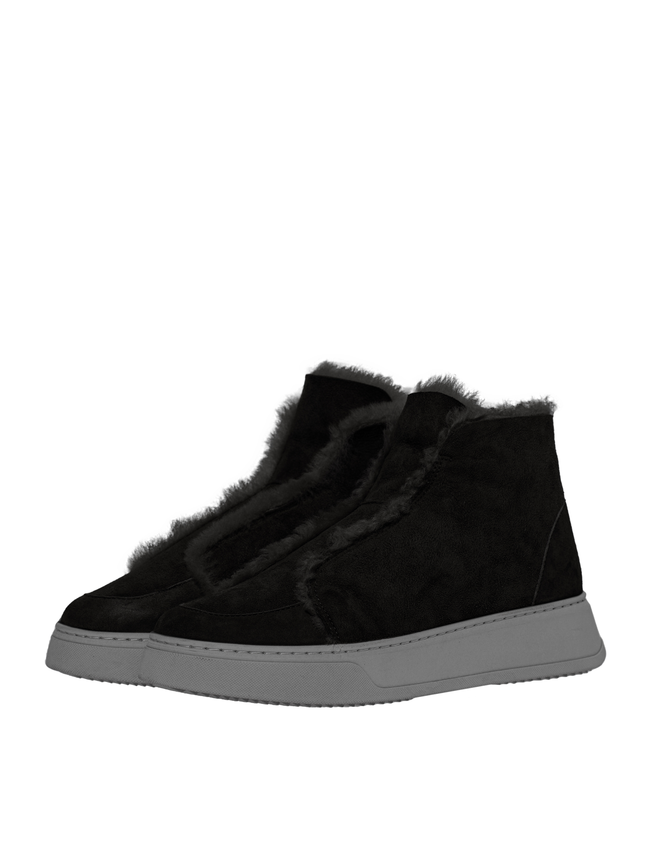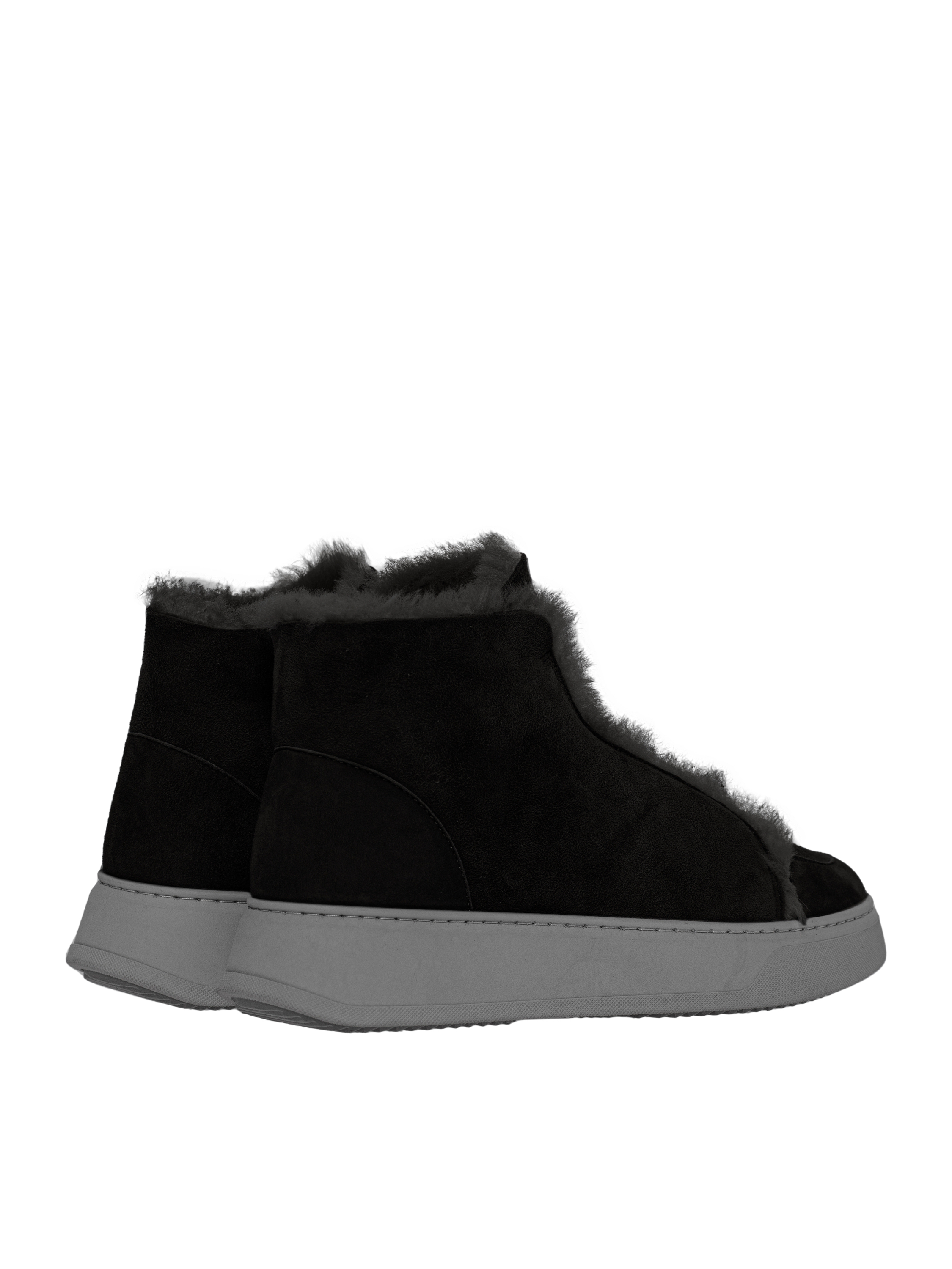 Versatile black suede ankle boots on a rubber sole are lined with natural fur for warmth. The model has no lacing and fastens with a side zipper.