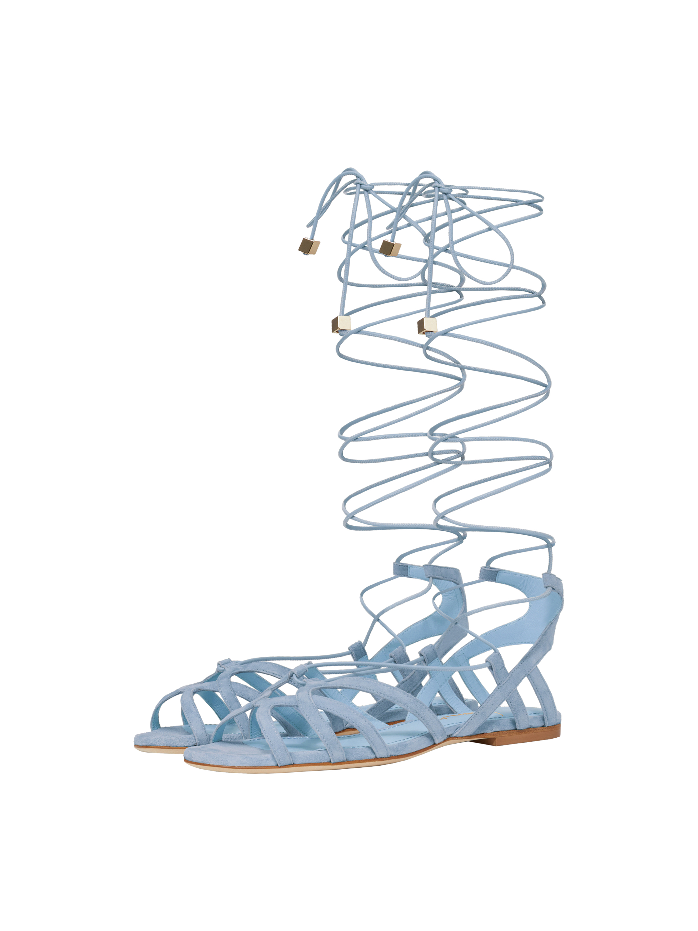 The high gladiator sandals are made of soft genuine suede in blue. The long criss-cross lacing will accentuate the slimness of your legs, while the small stacked heel will prevent fatigue after long walks.