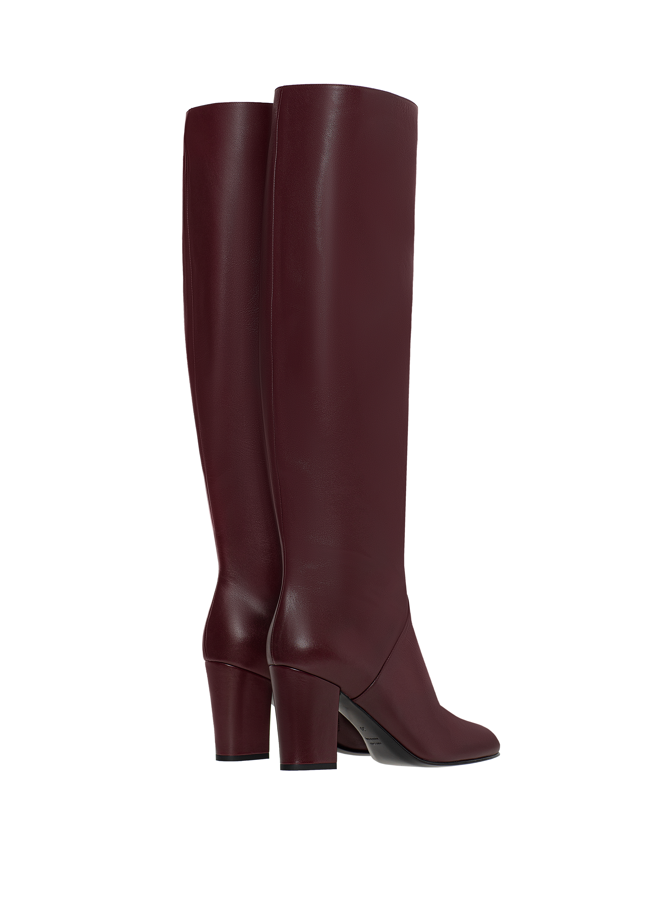 High leather boots on a stable heel are suitable both for an everyday wardrobe and for a special occasion. The laconic model with a round toe without decorative elements allows you to experiment with various looks and combine it with skirts of any style. The boots are made of natural smooth burgundy goat leather. Heel height: 8 cm.
