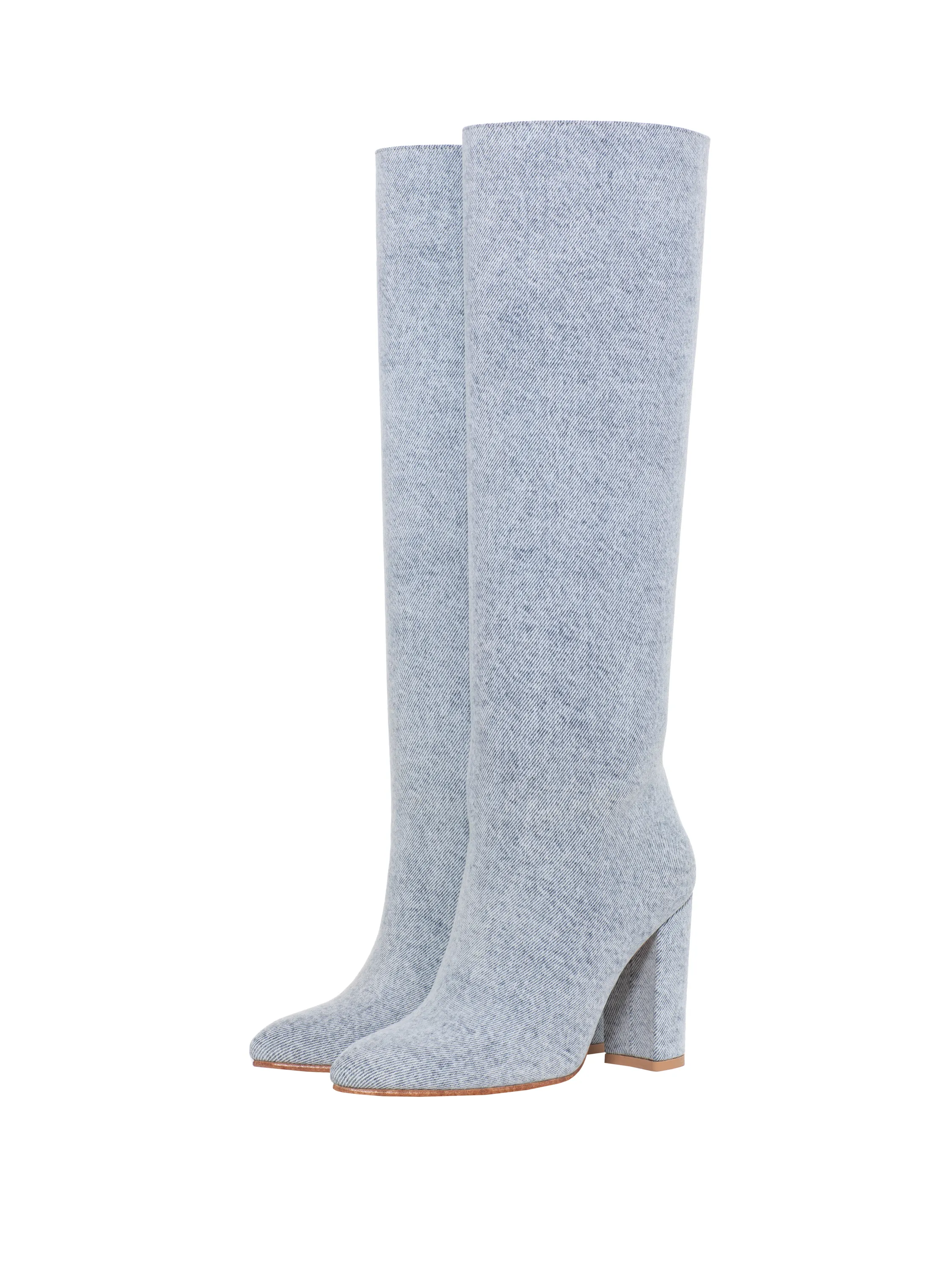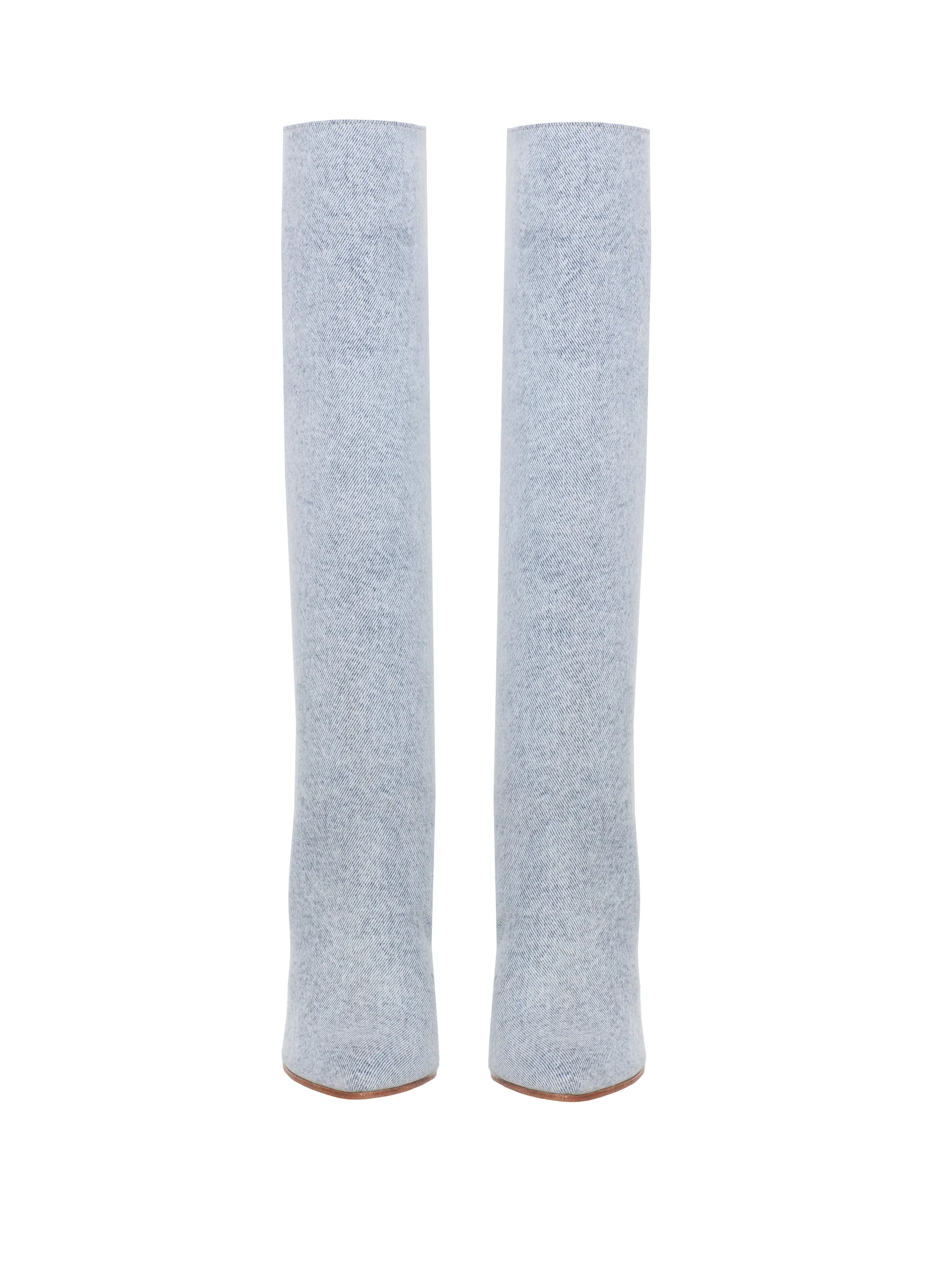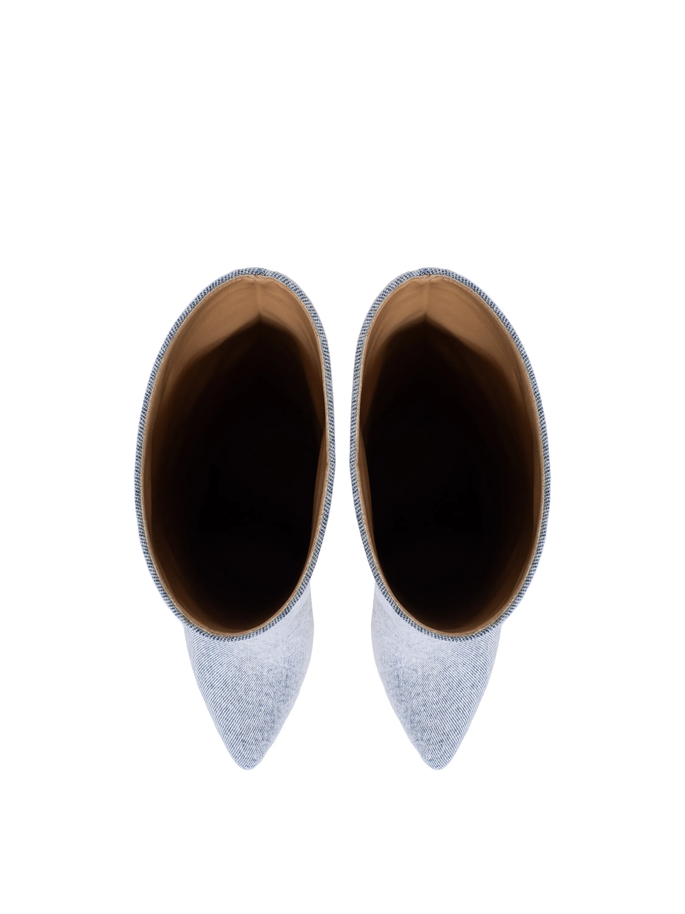 High boots made of light blue denim and premium beige leather will be the perfect addition to a basic look. The model with a pointed toe on a high stable heel fits snugly around the leg up to the knee, which allows you to combine the boots with skirts and dresses of any length. Heel height: 11 cm.