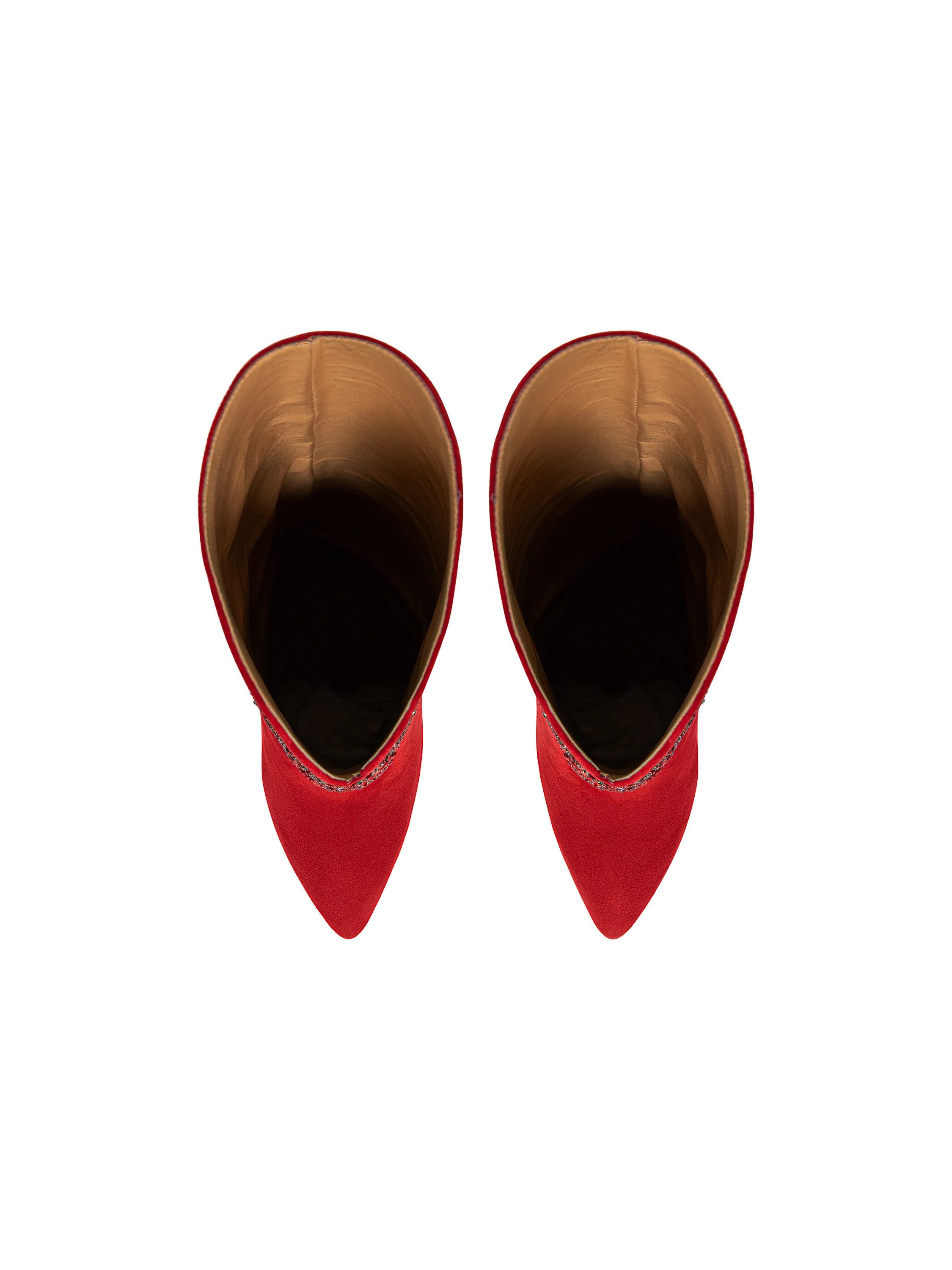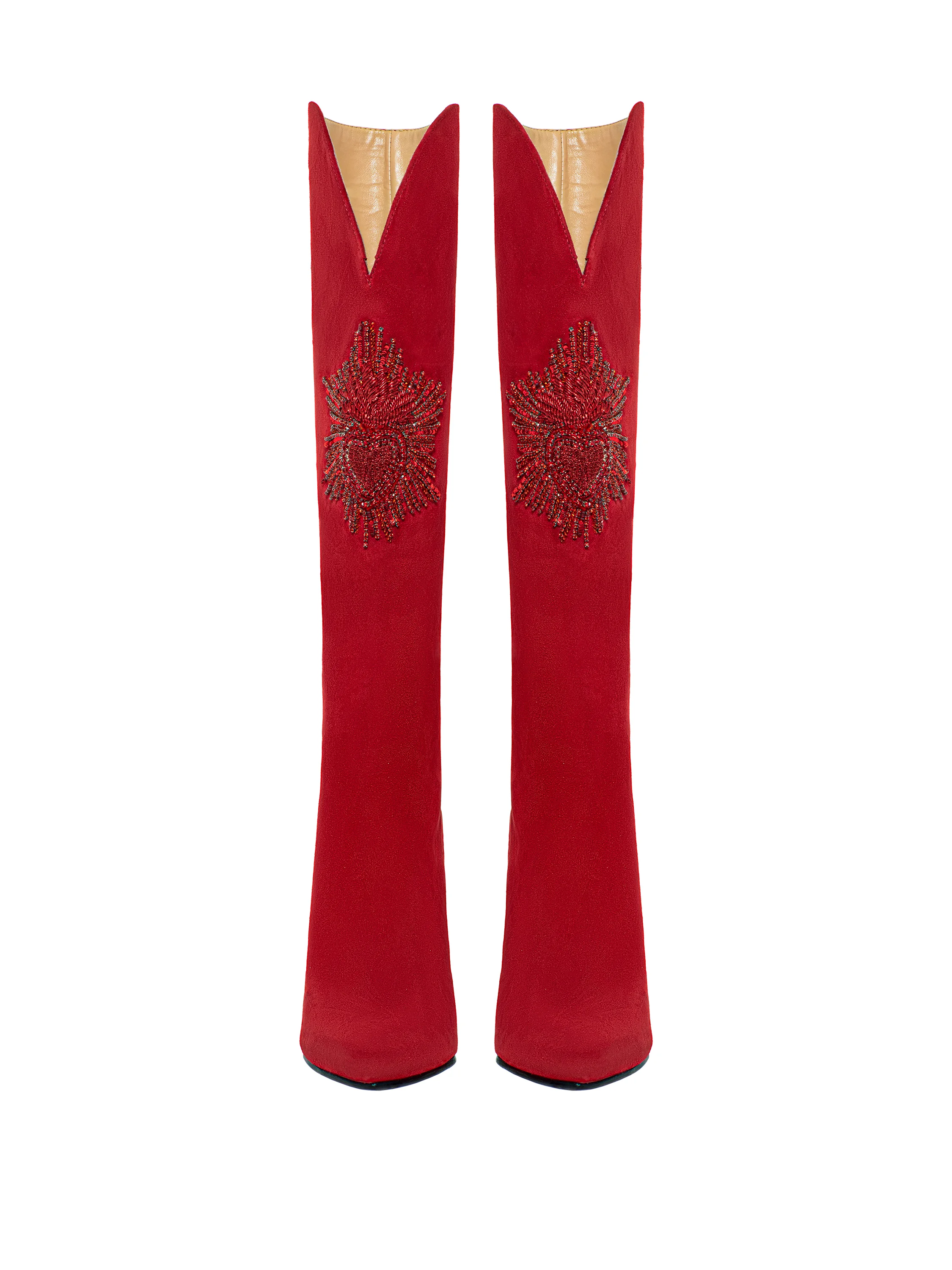 High-heeled boots with a pointed toe will help you create a memorable look. Thanks to the wide shaft with a shaped top edge, the pull-on design without zippers is easy to put on and take off. The boots are made of soft bright scarlet suede. The pair is embellished with embroidery in the shape of a heart with rays made of rhinestones and sequins.
