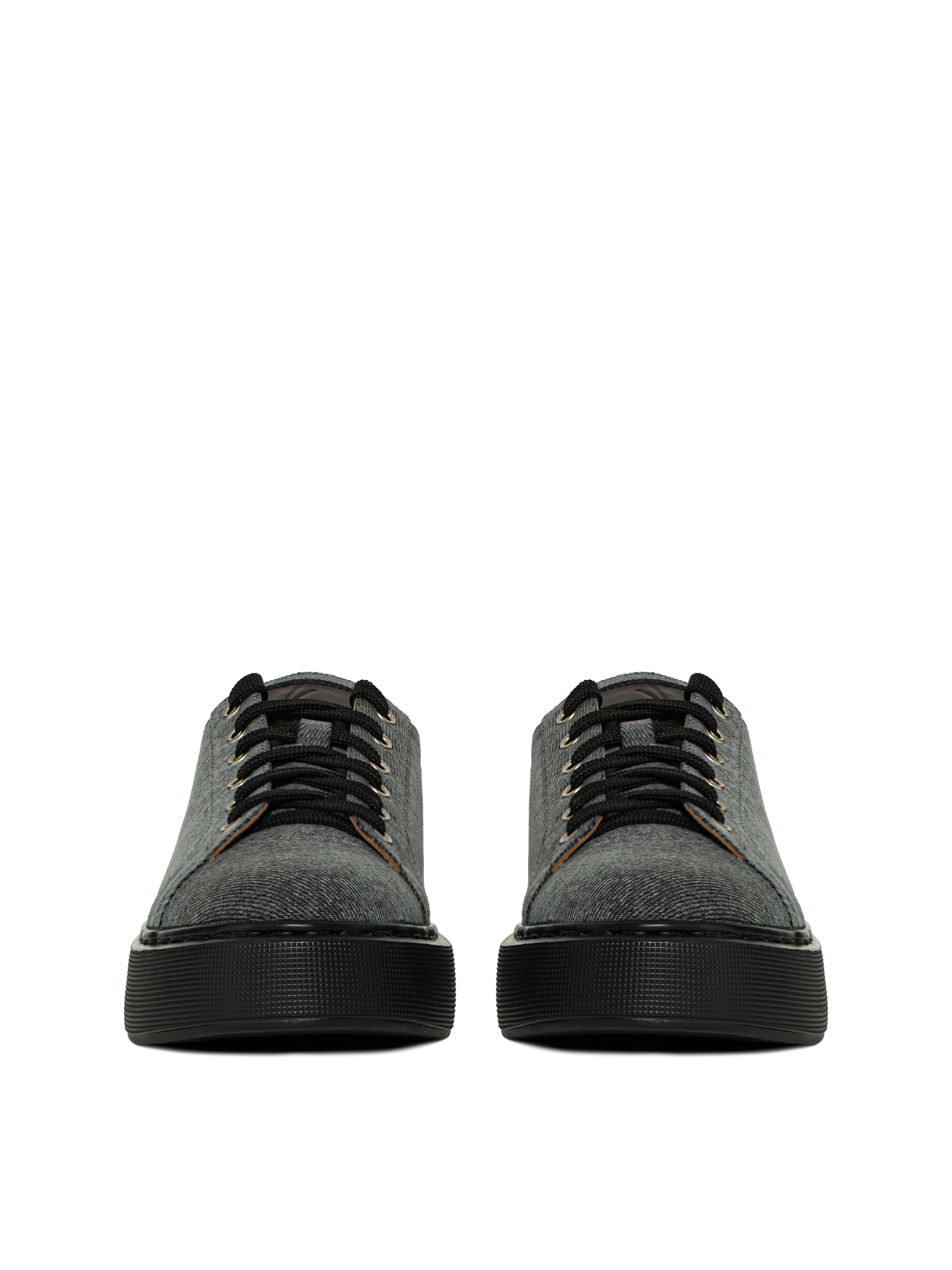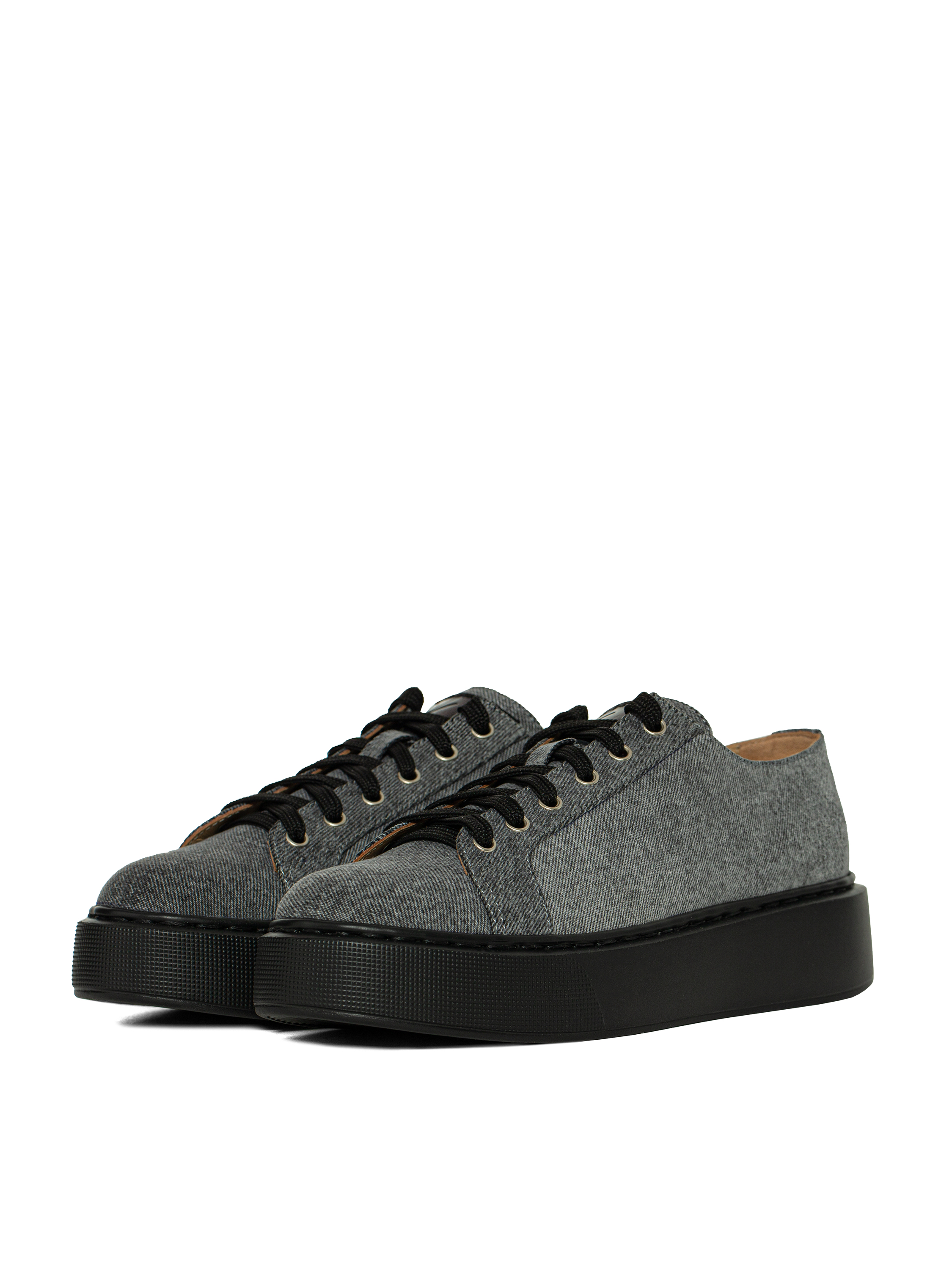 Grey denim sneakers with a wide black sole. The interior is made of natural beige leather. Decorated with a black leather patch with the brand’s logo on the front.