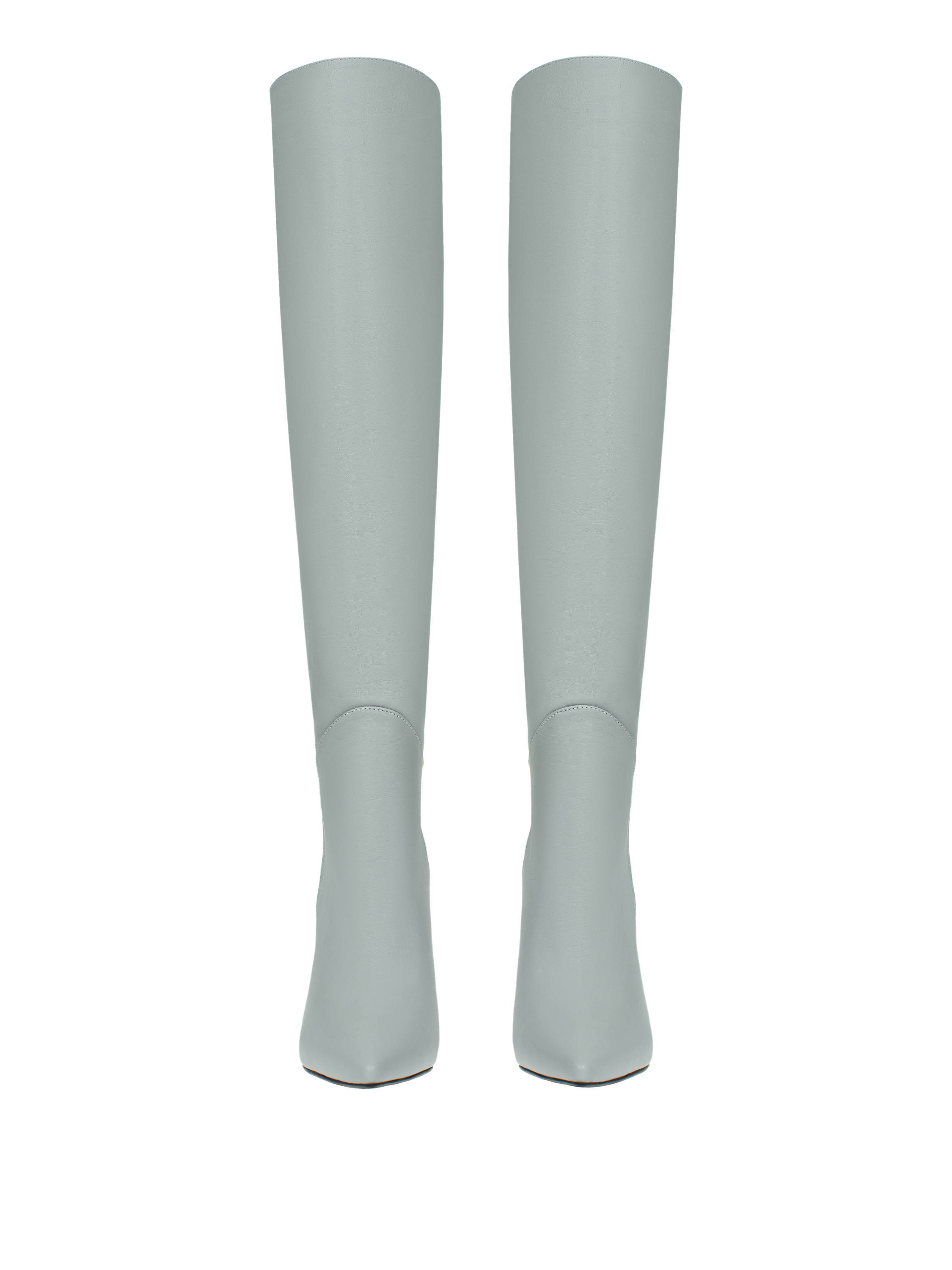 Gray high stiletto-heel boots with a pointed toe will help create a memorable look. Thanks to the wide shaft, the boots without zippers are easy to put on and take off. The model is made of soft, grained leather with a matte sheen.