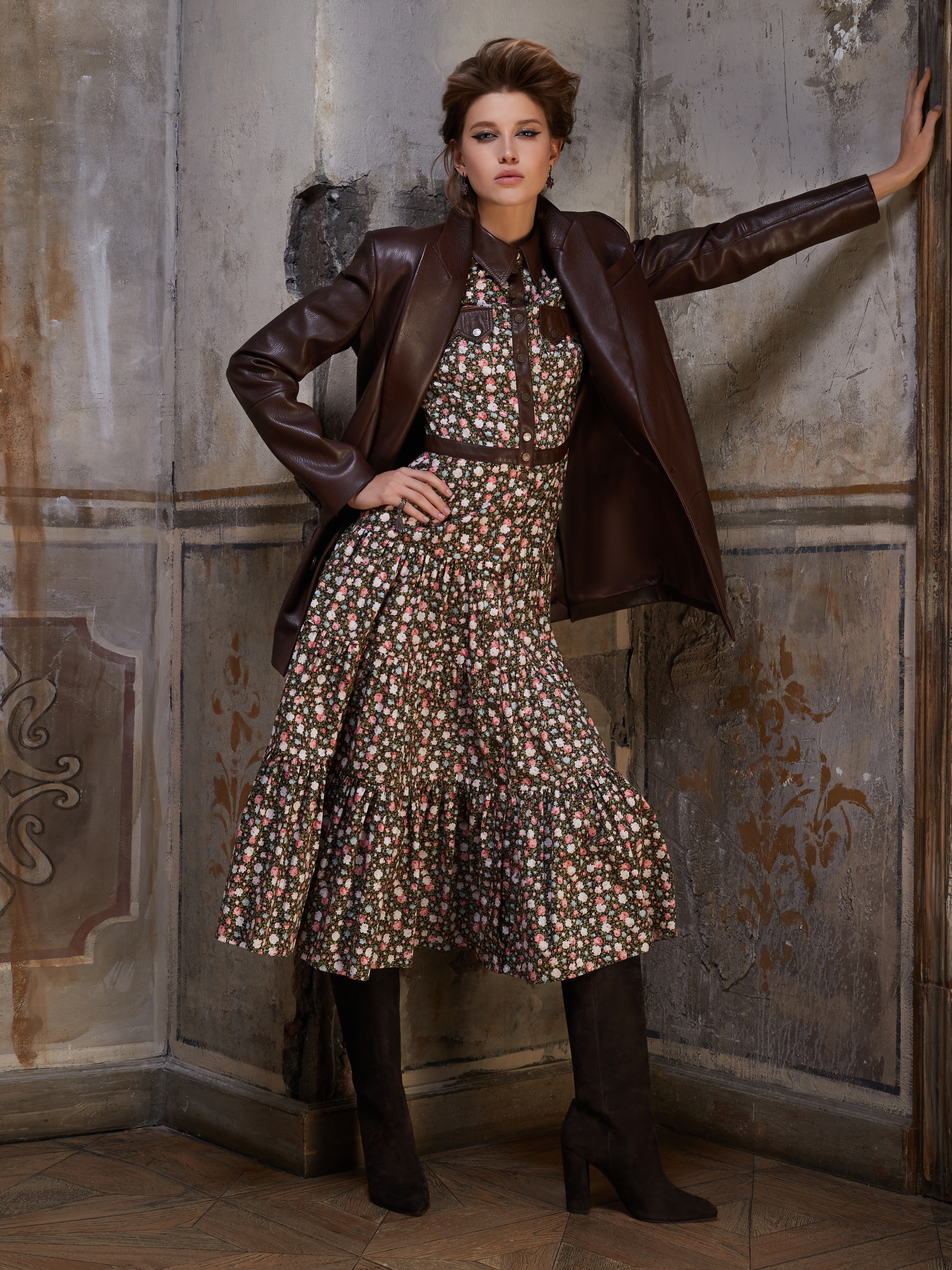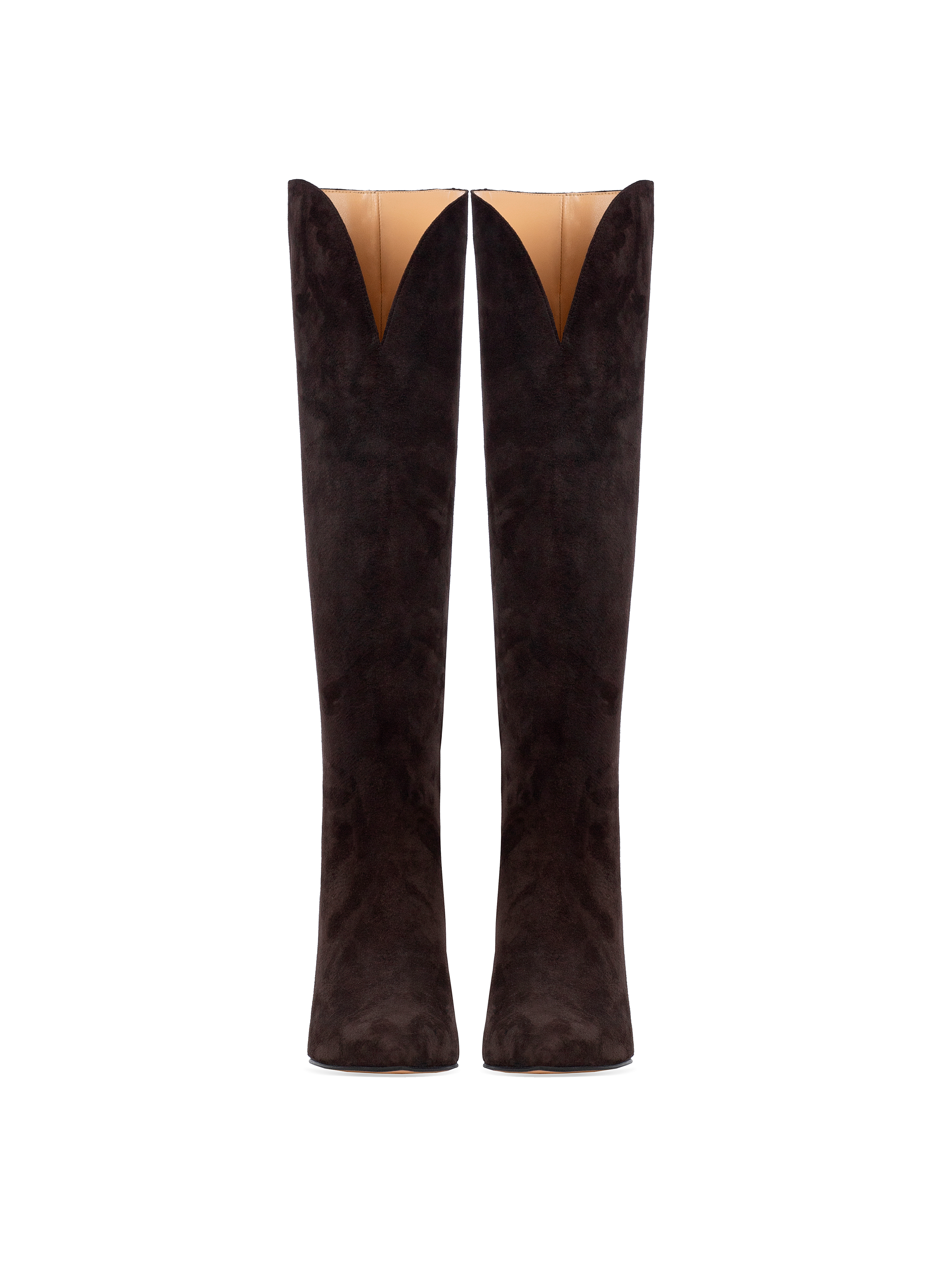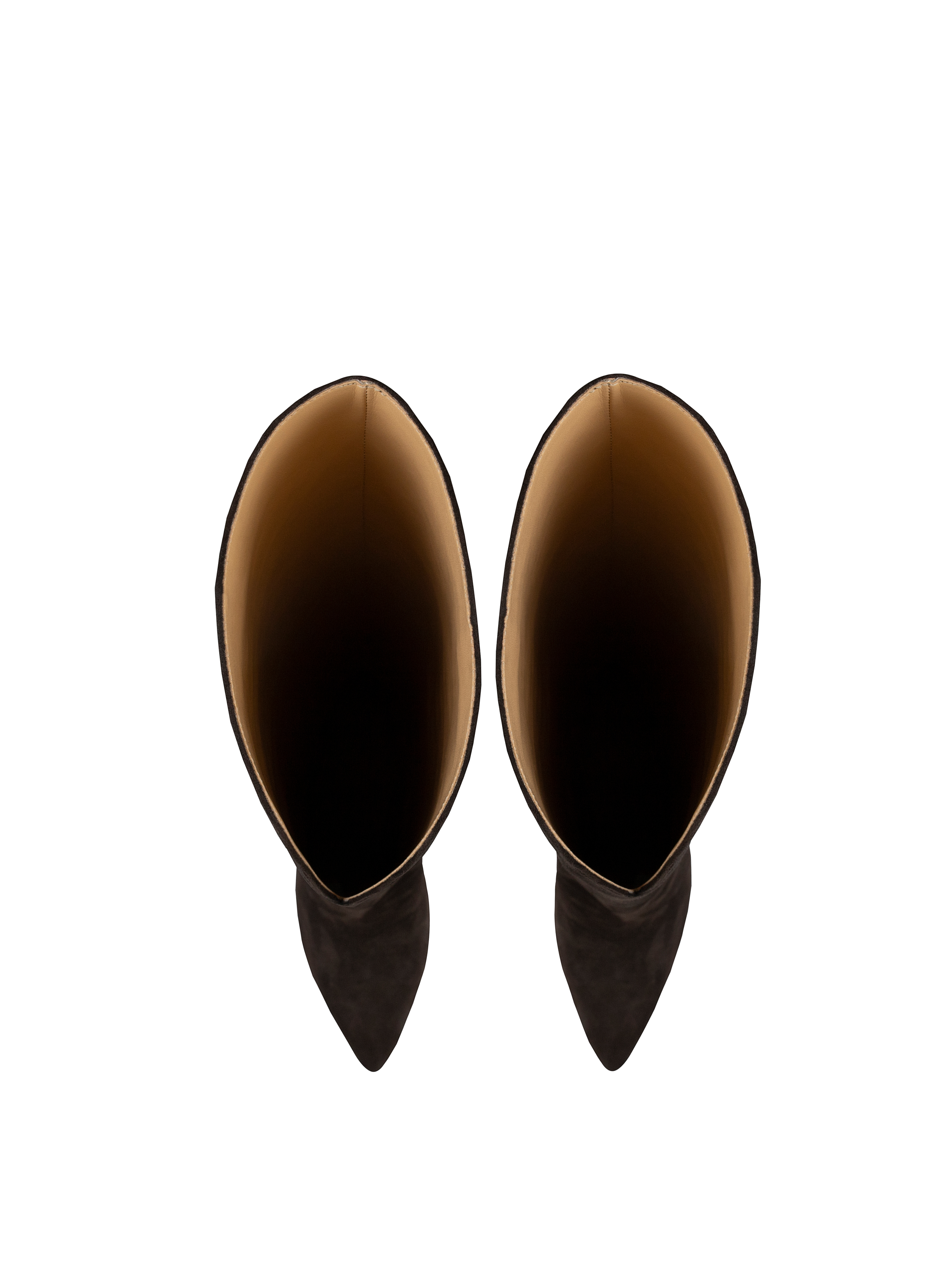 Dark brown high-heeled boots with a tapered toe will help create a memorable look. Thanks to the wide shaft with a shaped top edge, the zipless shoes are easy to put on and take off. The model is made of genuine suede.