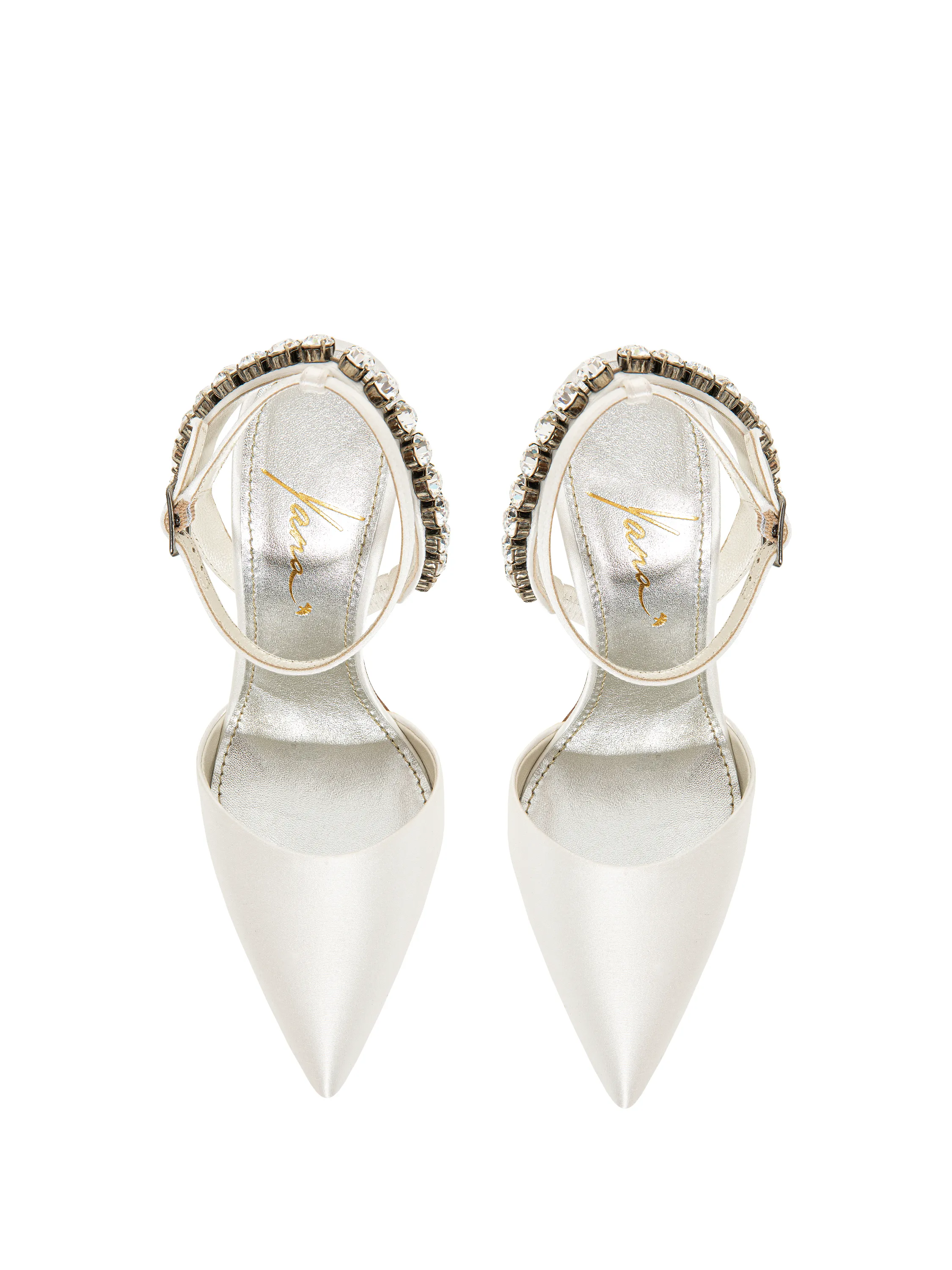 White satin pumps with pointed toe and rhinestones