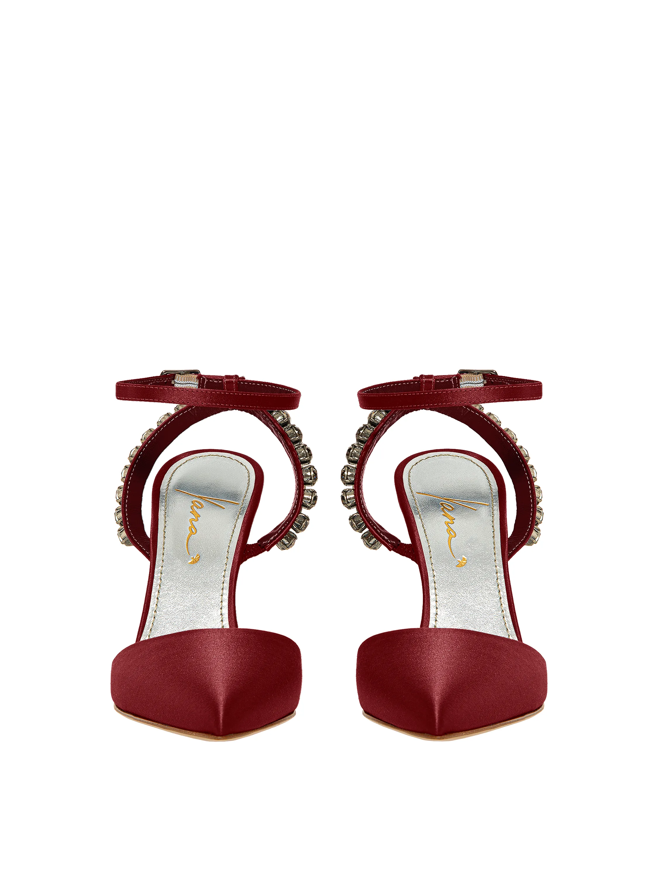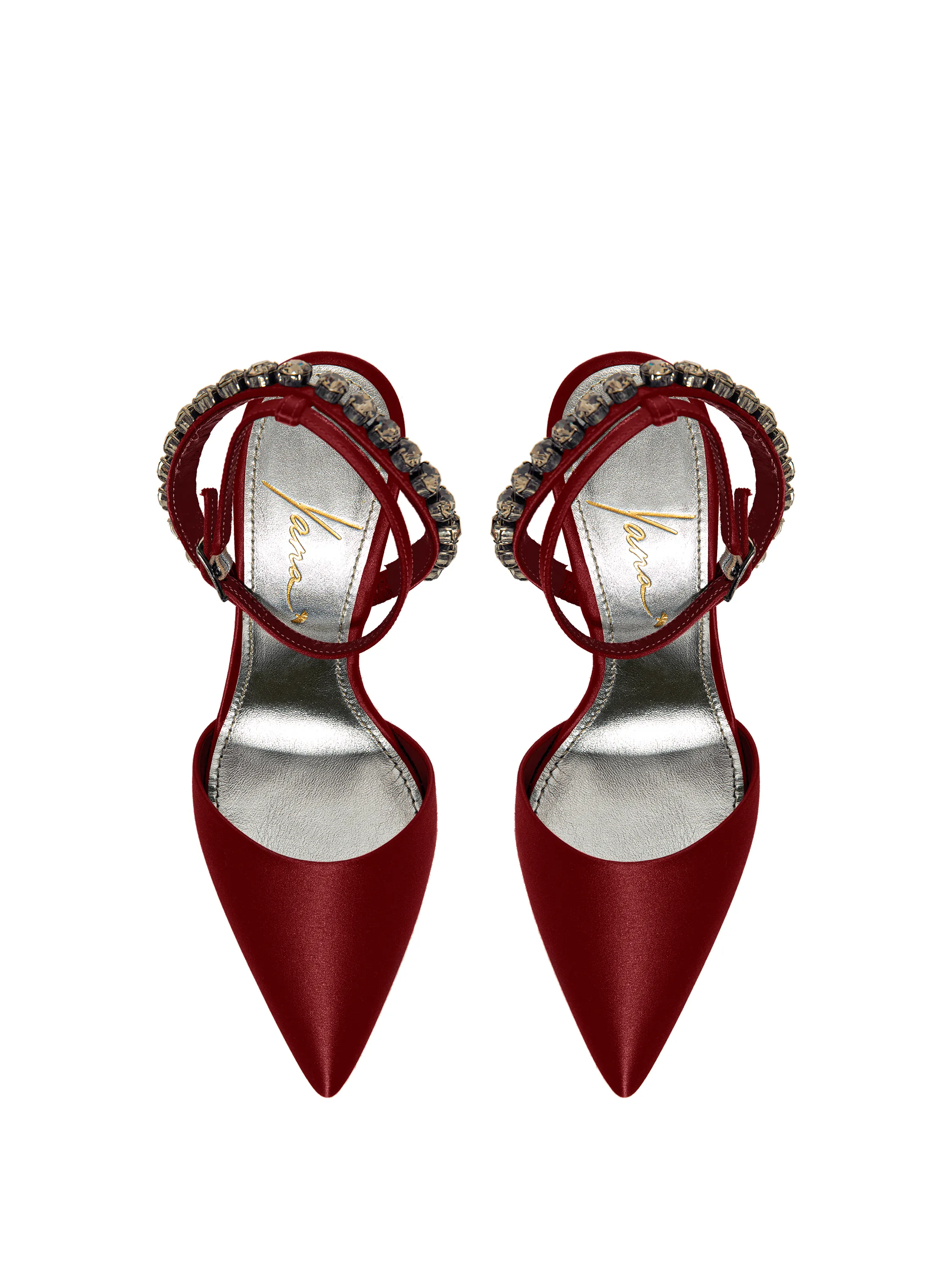 Burgundy satin pumps with pointed toe and rhinestones