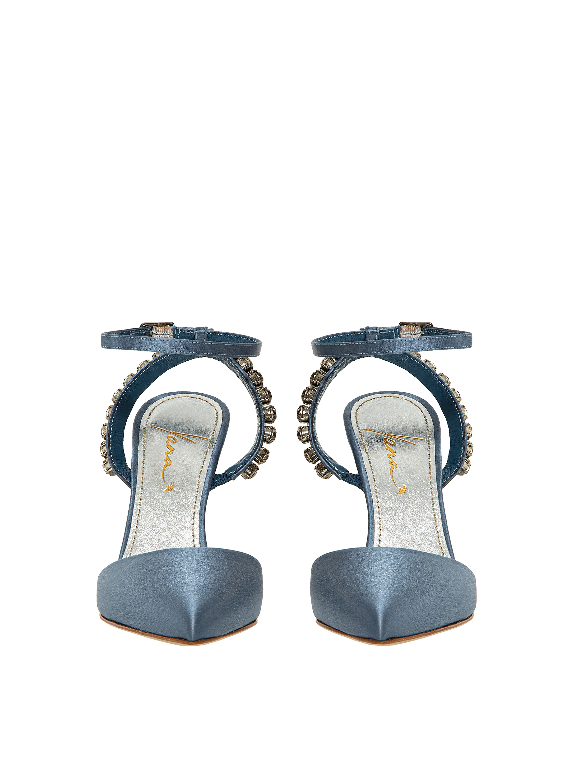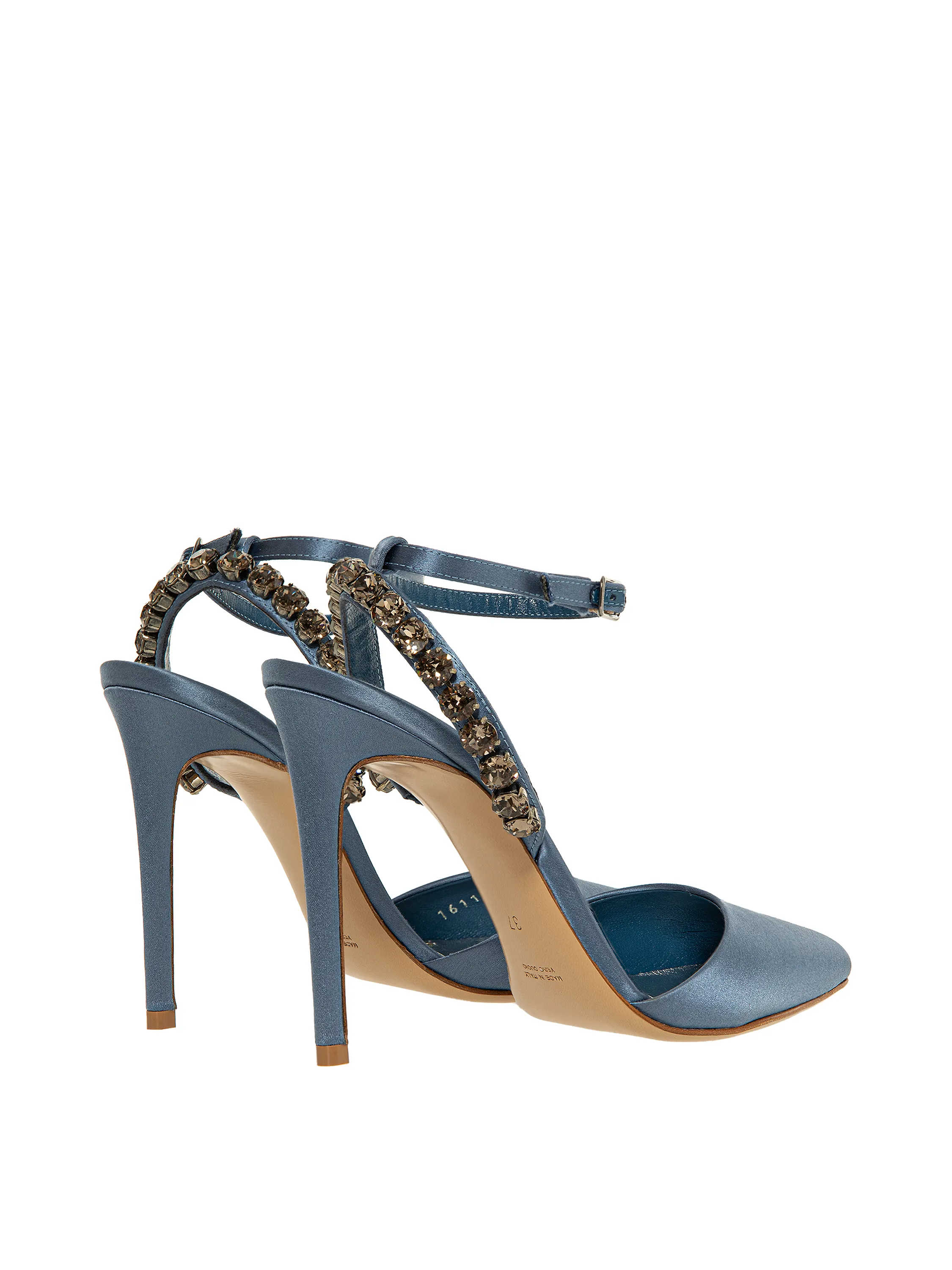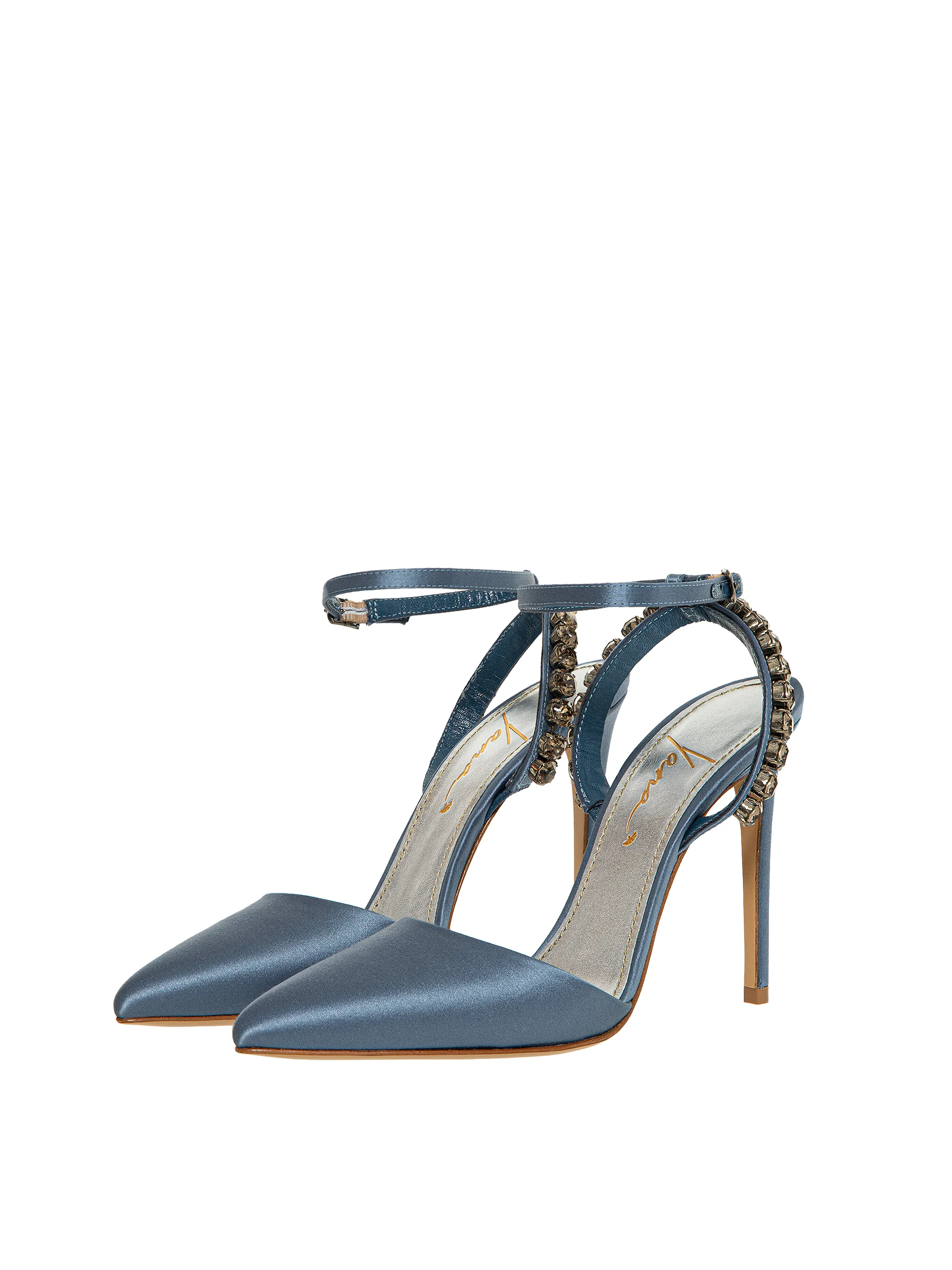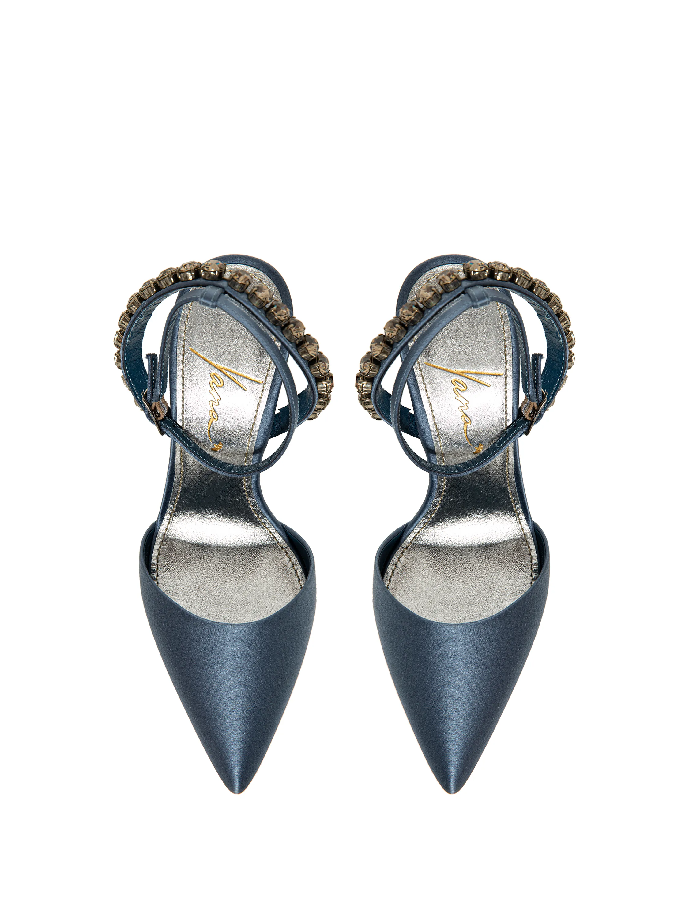 Graphite satin pumps with pointed toe and rhinestones