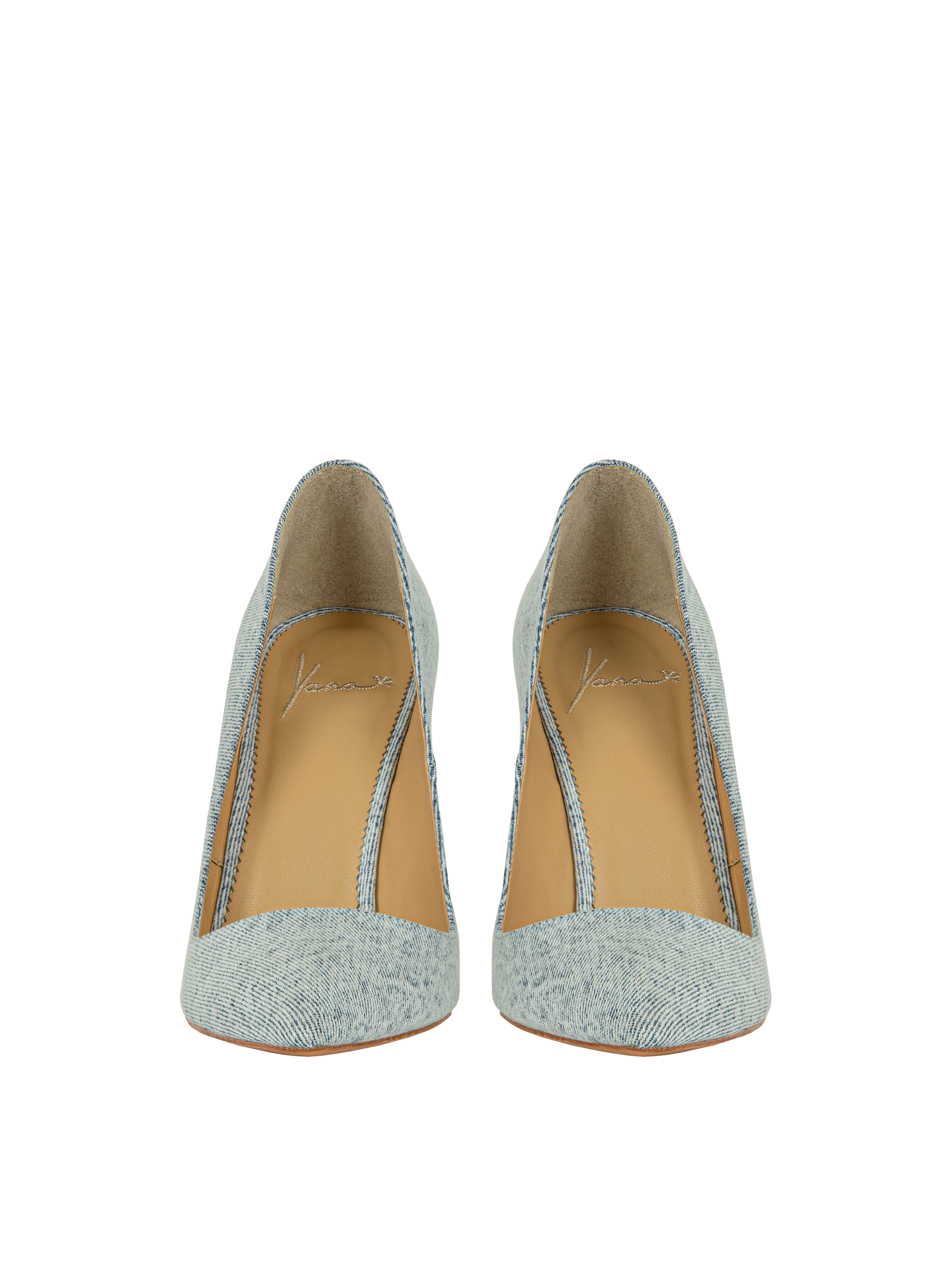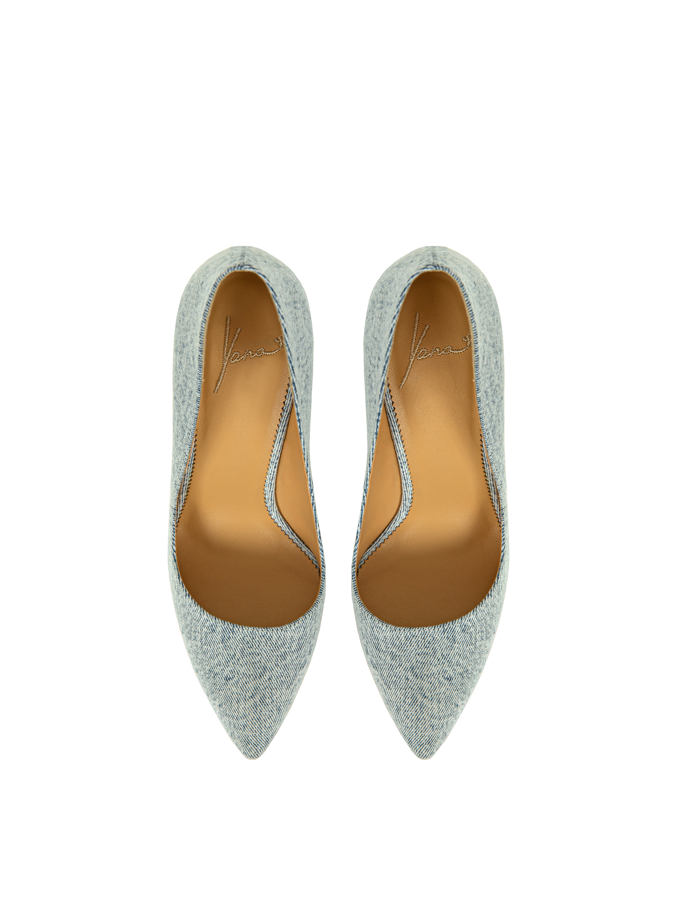 Neat pumps with a classic pointed toe and stiletto heel are made of soft beige leather on the inside, while the outside is covered with washed light blue denim.