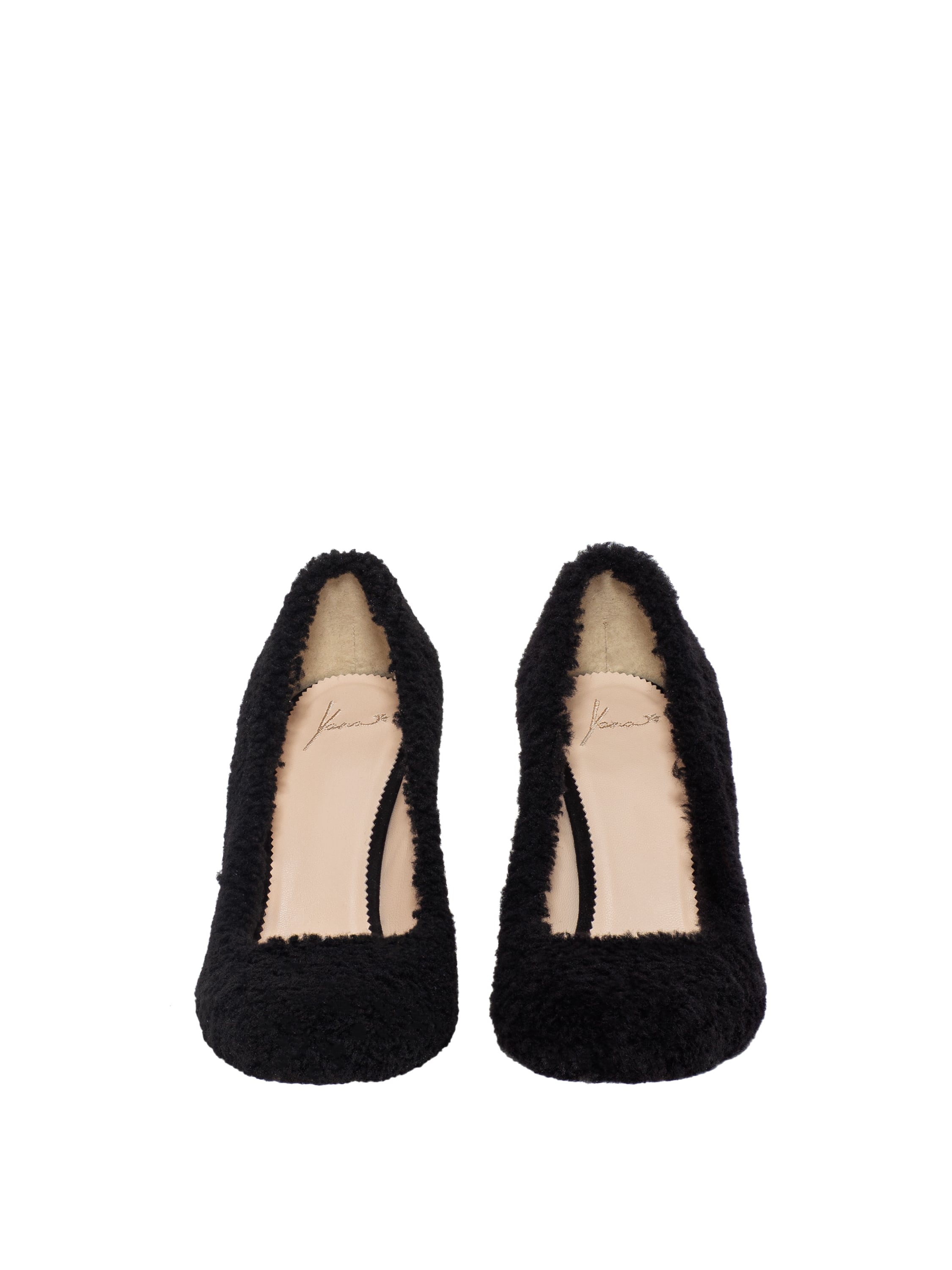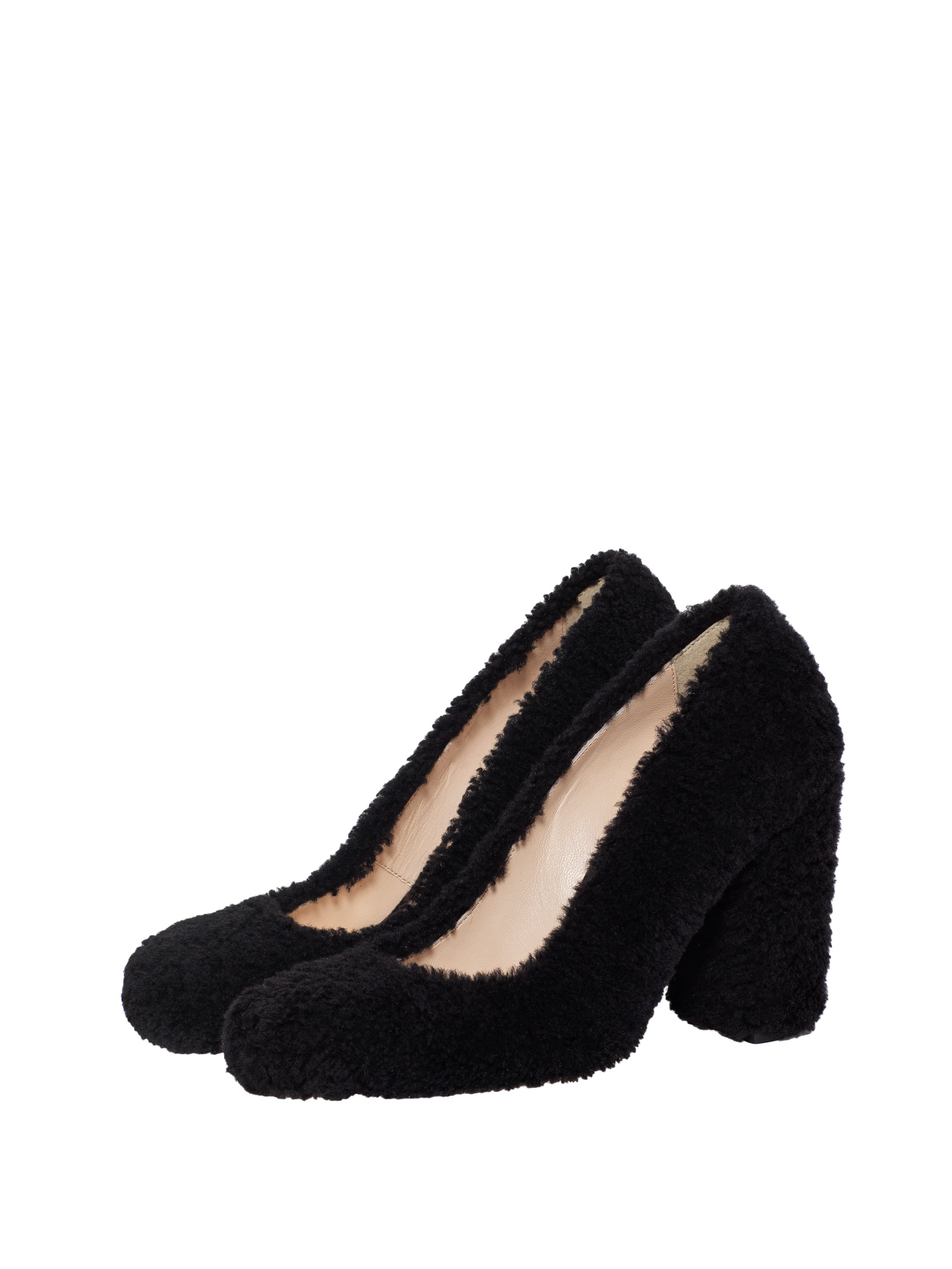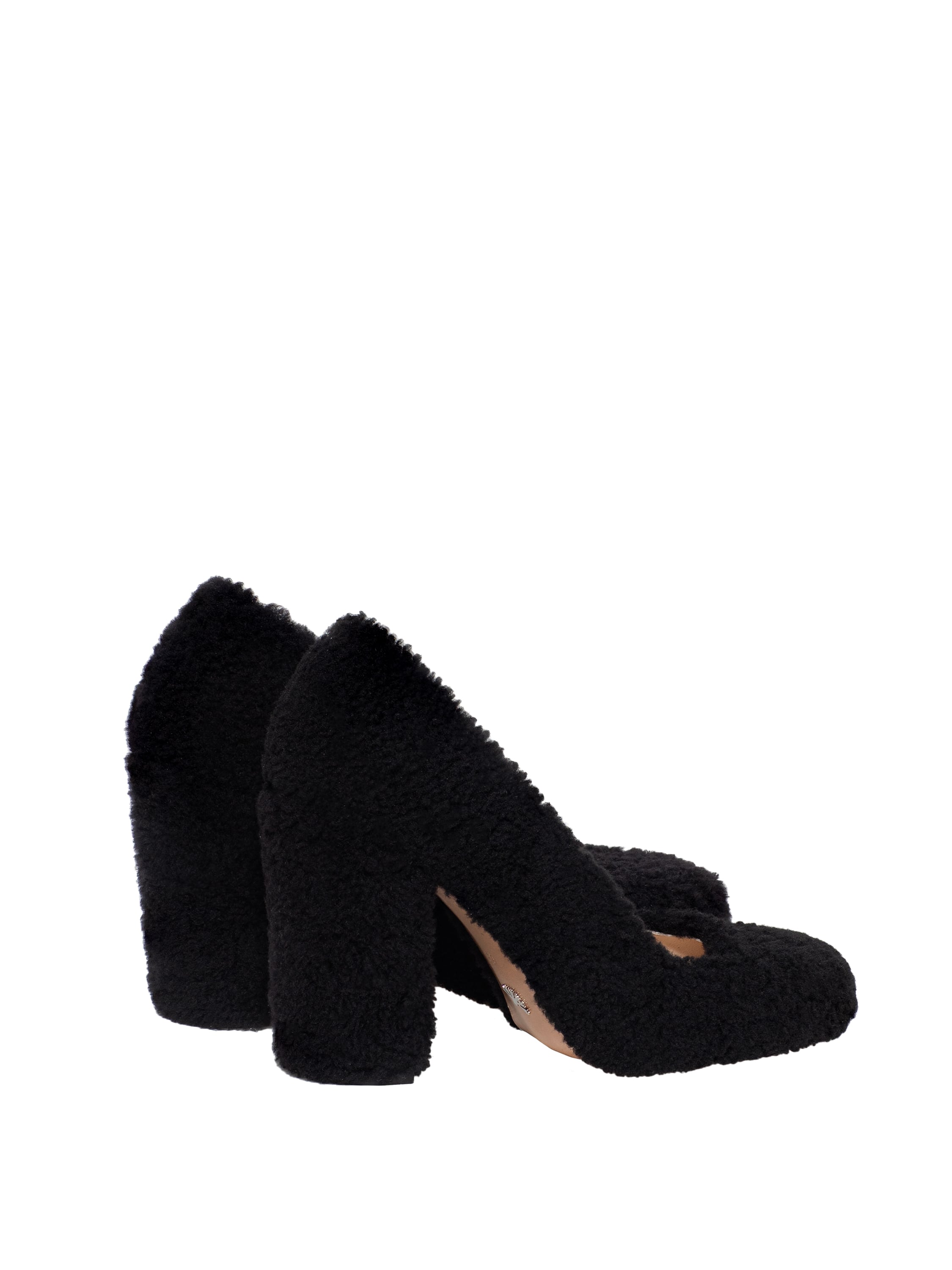 Black shoes made of soft and textured shearling will become a trendy accent in your look. The style with a round toe and a stable heel is a perfect option for every day.