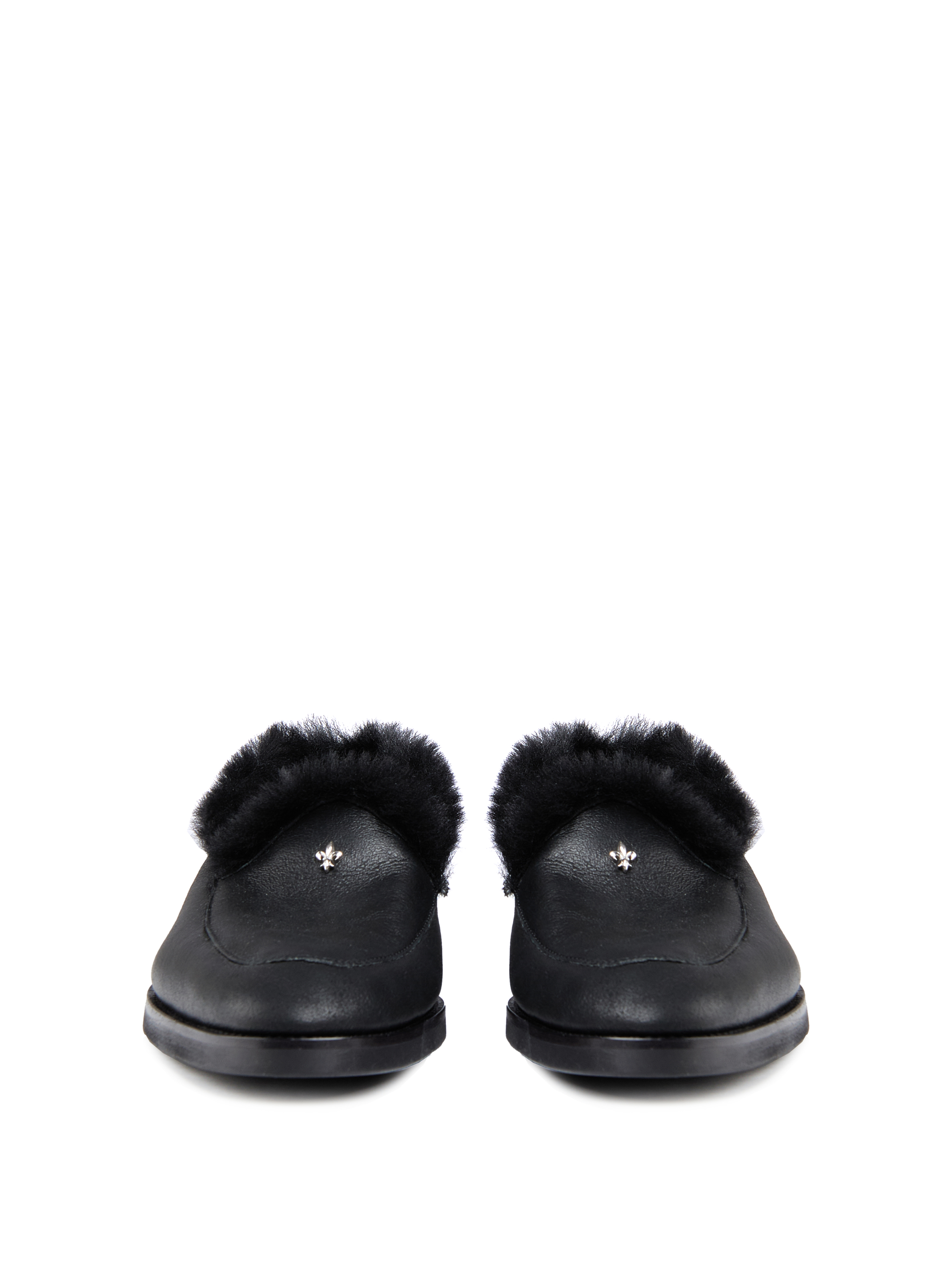 The loafers are made of black leather with matching natural sheepskin. The model is decorated with a metal heraldic lily.