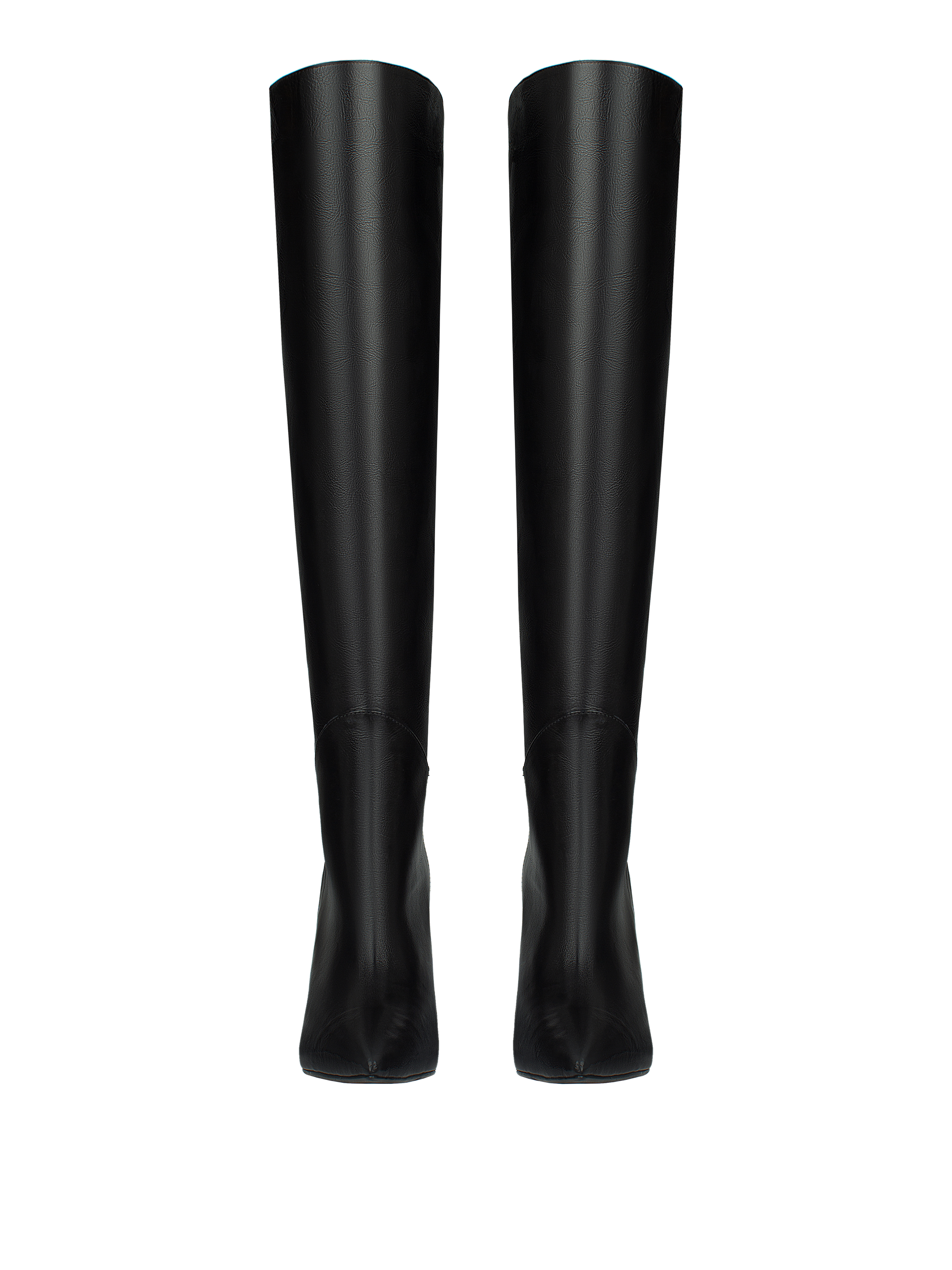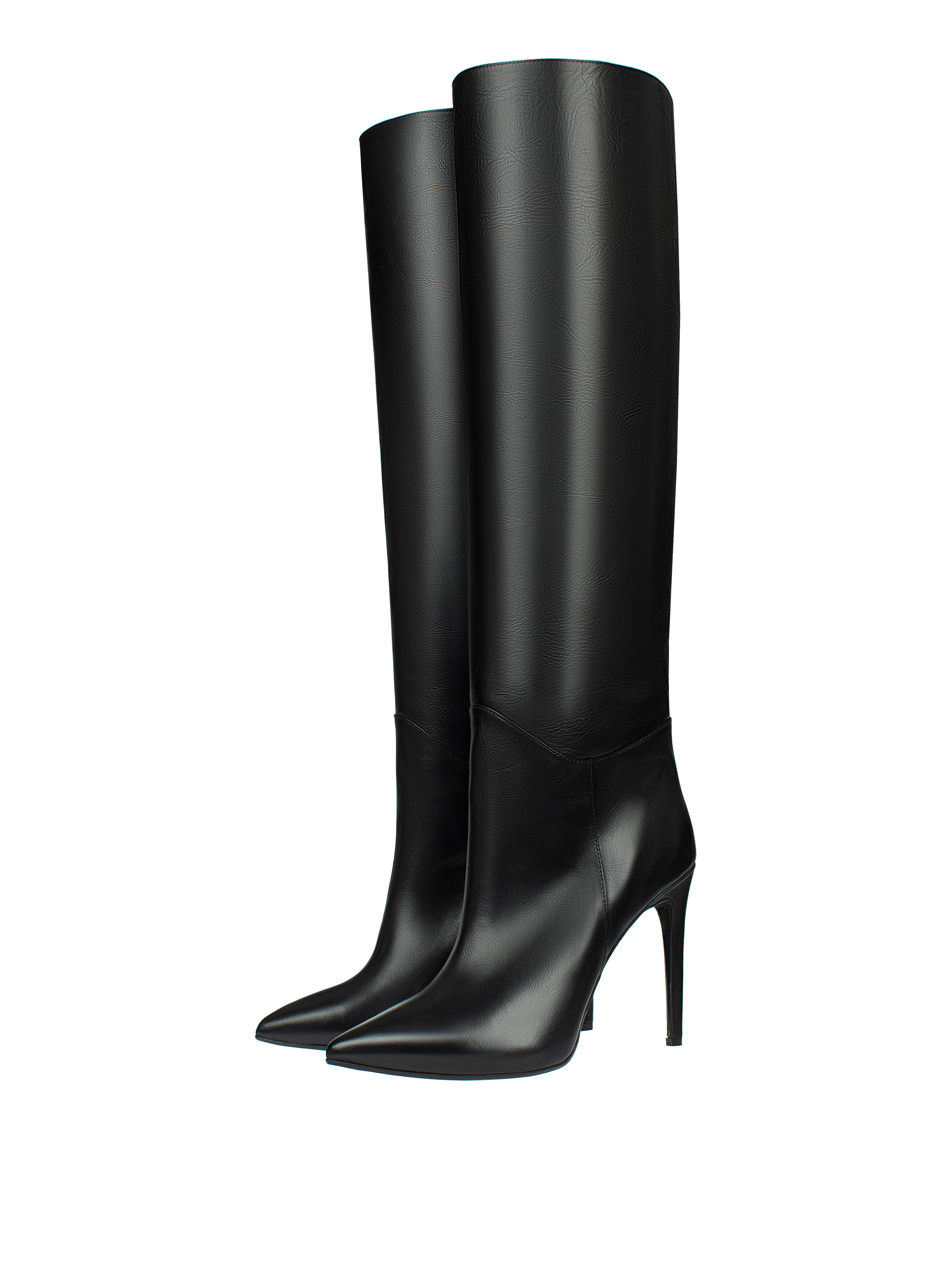Black high-stiletto boots with a pointed toe will help create a memorable look. Thanks to the wide shaft, the boots without zippers are easy to put on and take off. The model is made of soft grained leather with a matte sheen.