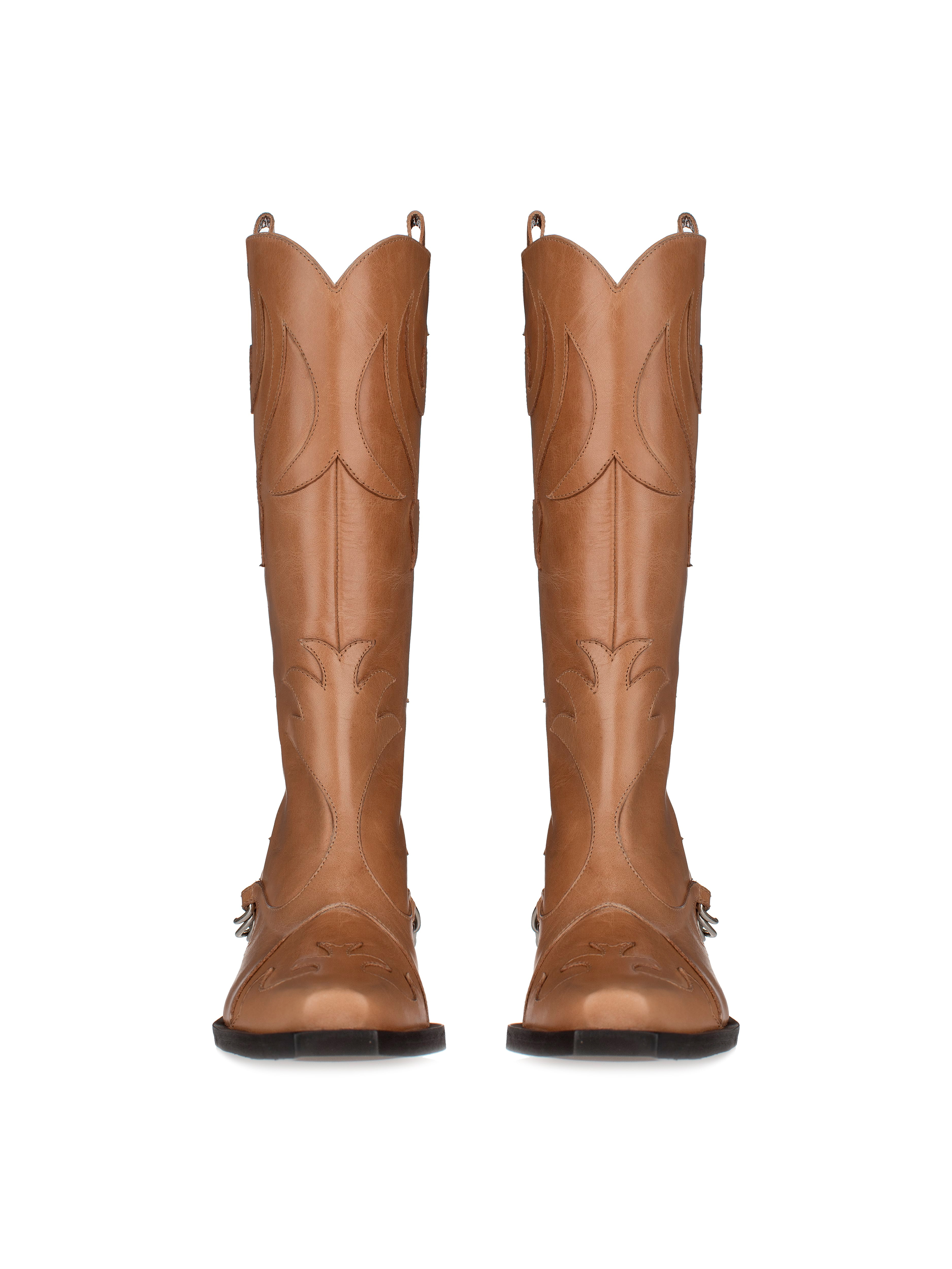 The dark beige cowboy boots are a striking example of versatile footwear that goes equally well with both jeans and dresses. The brand's craftsmen made the model from genuine leather on a slightly slanted heel. The boots are complemented by shaped details and a black shiny chain.