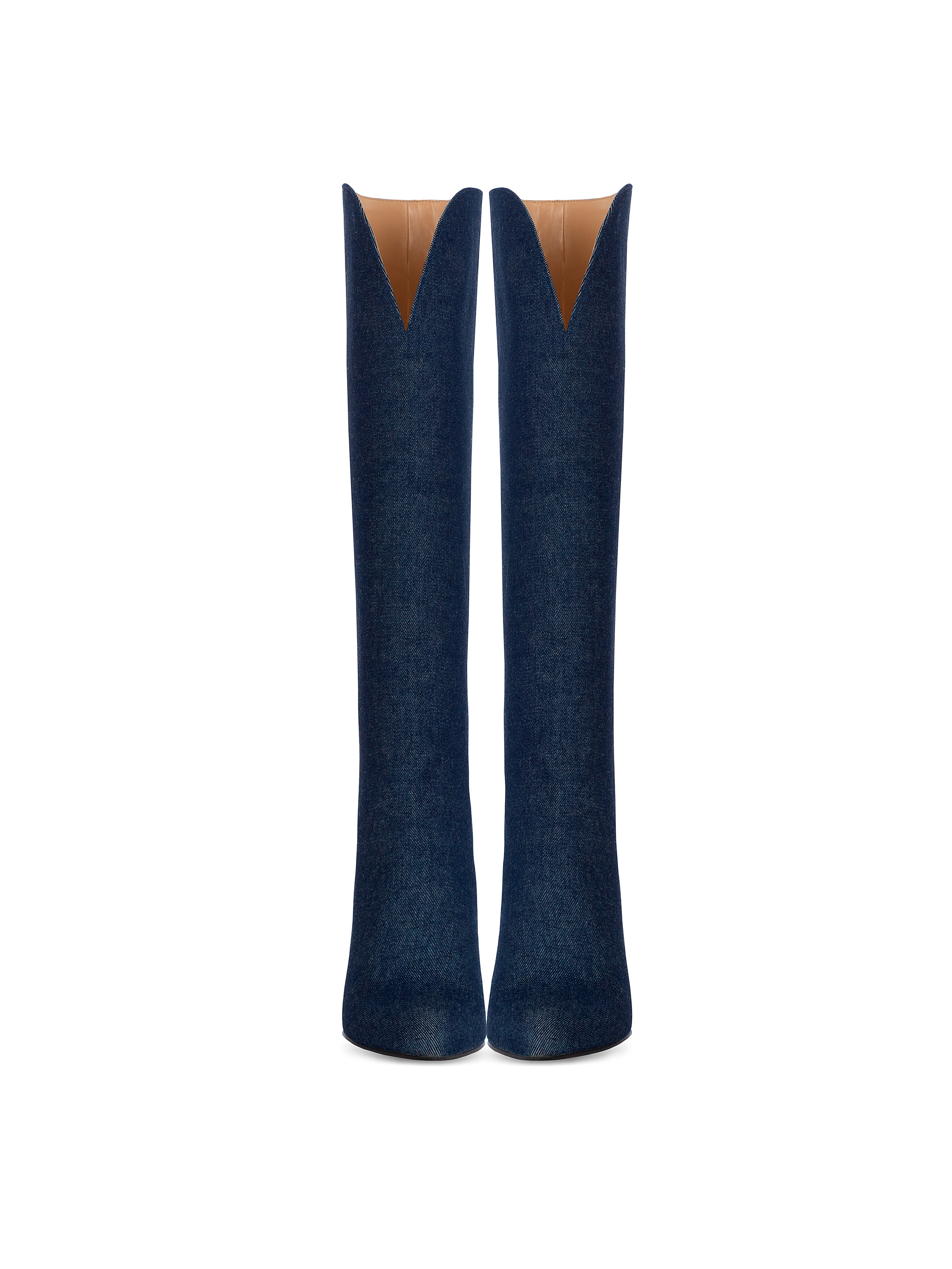 High-heeled boots with pointed toes will help create a memorable look. Thanks to the wide shaft with a shaped top edge, the zipperless boots are easy to put on and take off. For this model, natural brown leather is covered with dark blue denim fabric.