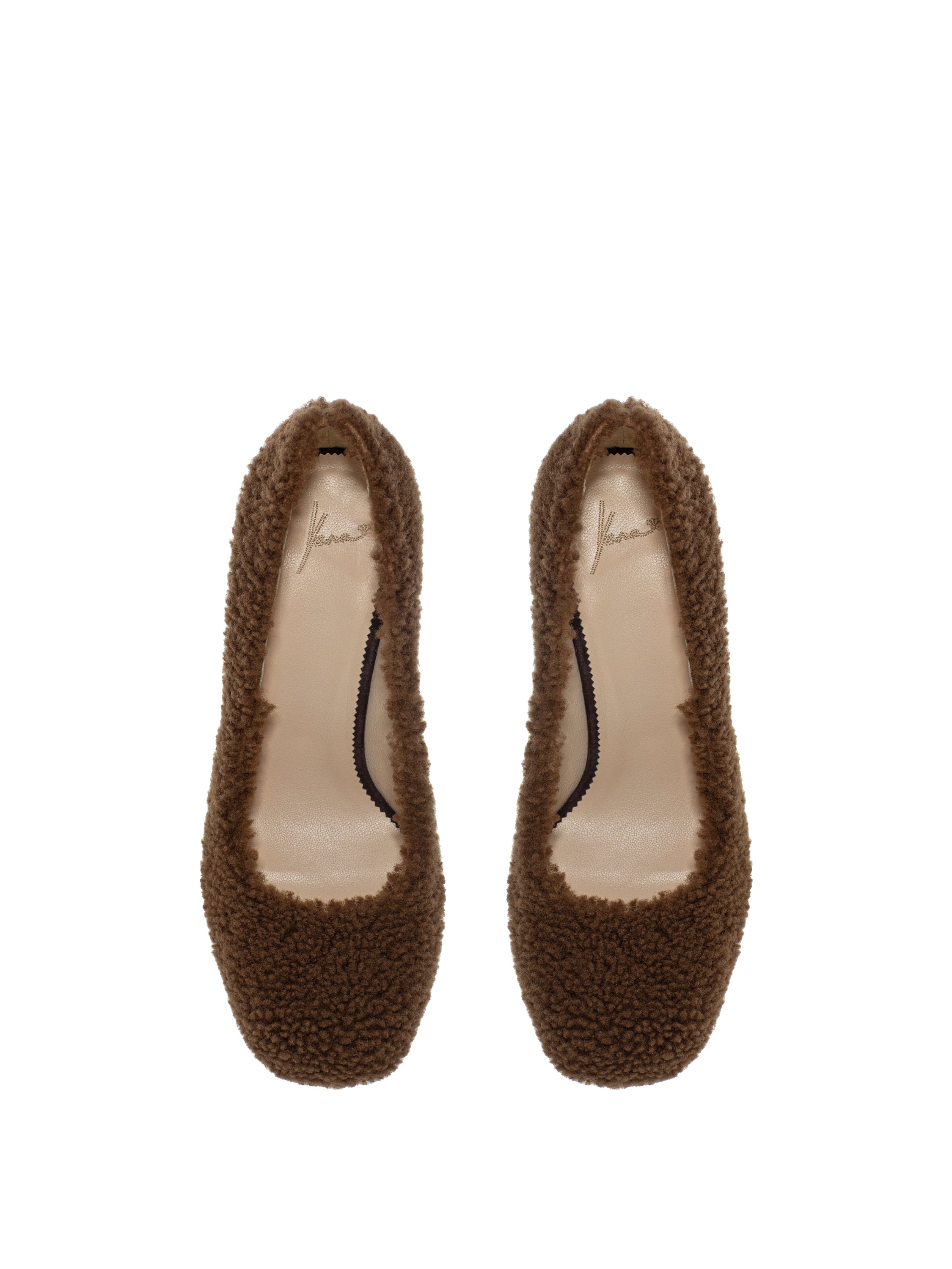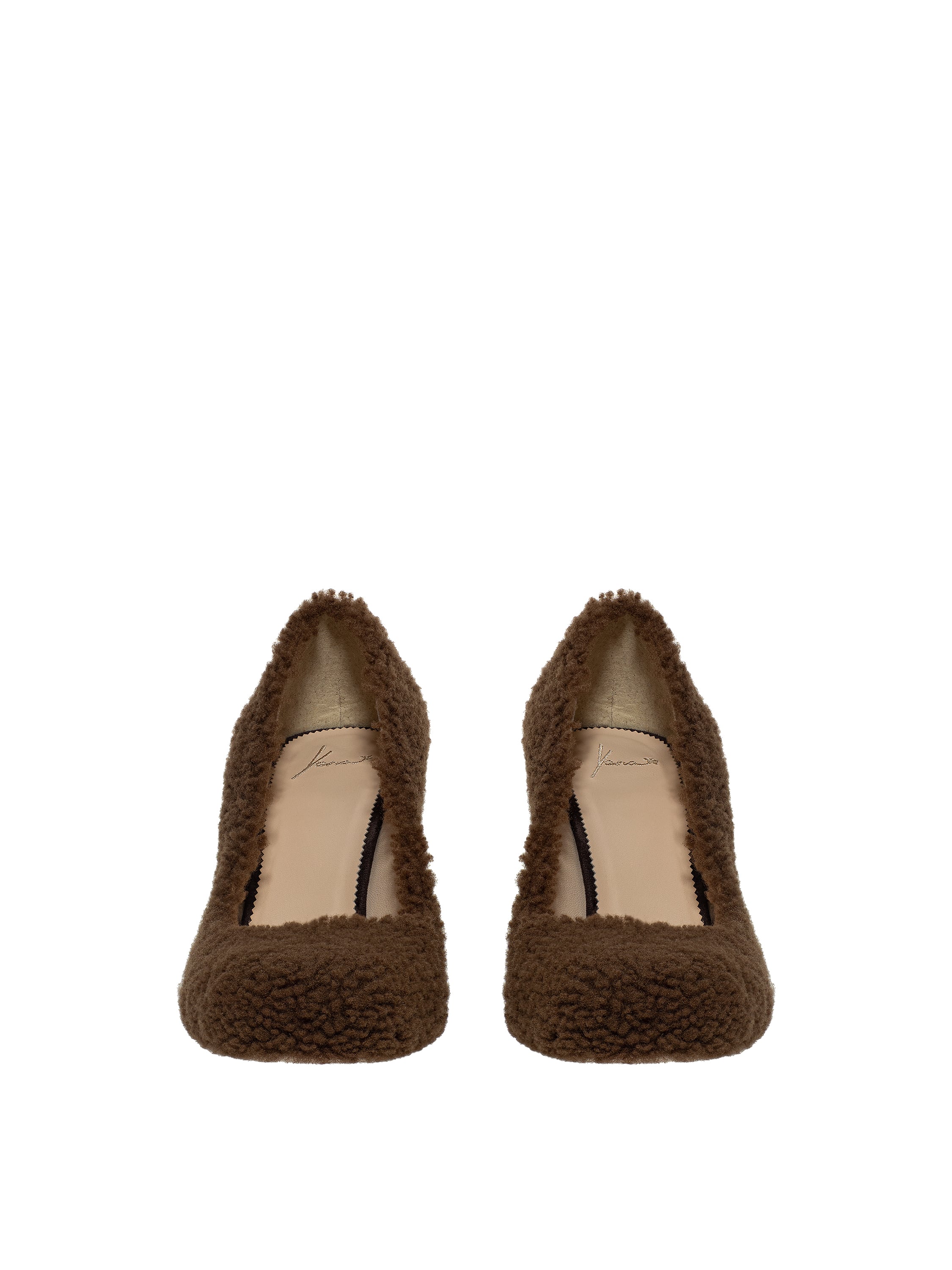 Brown shoes made of soft, textured shearling will become a trendy accent in your look. The model with a round toe and stable heel is an ideal option for every day.