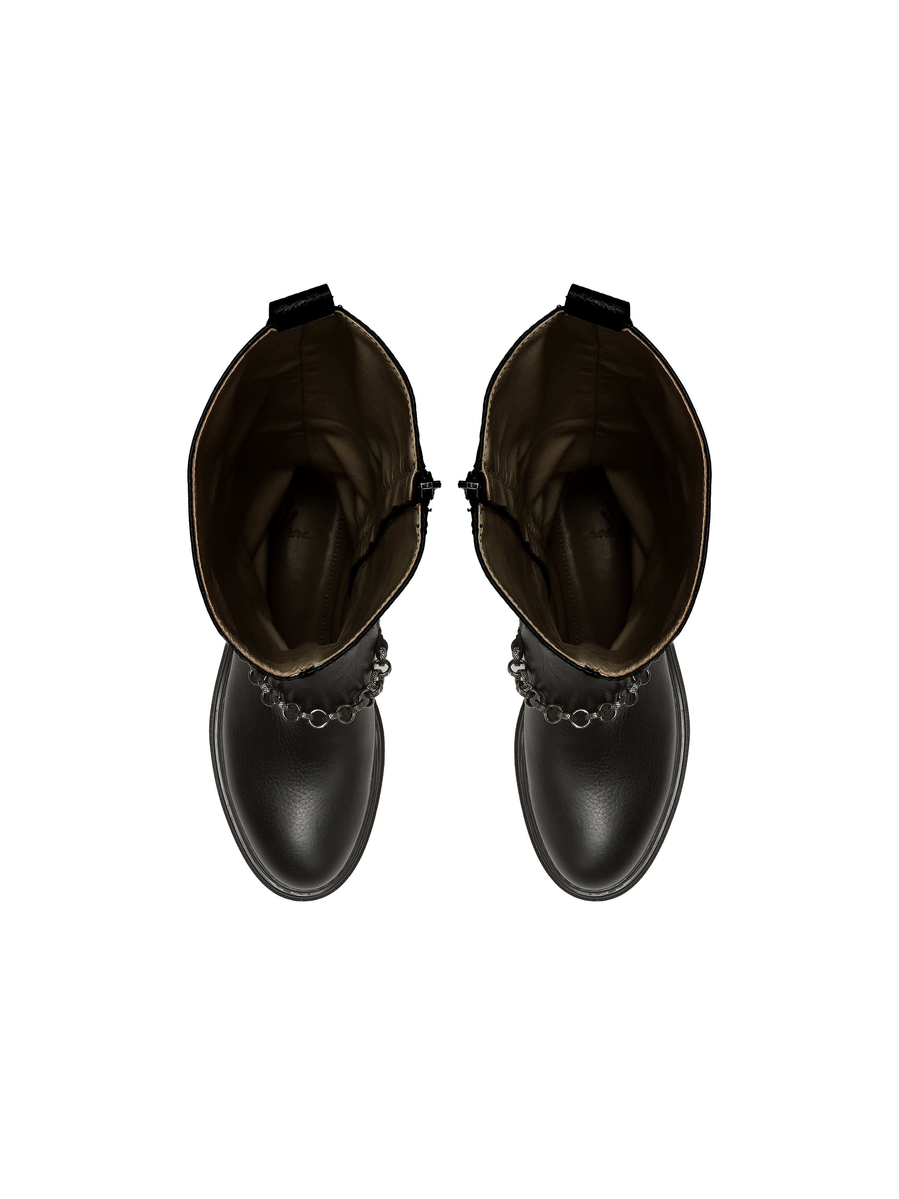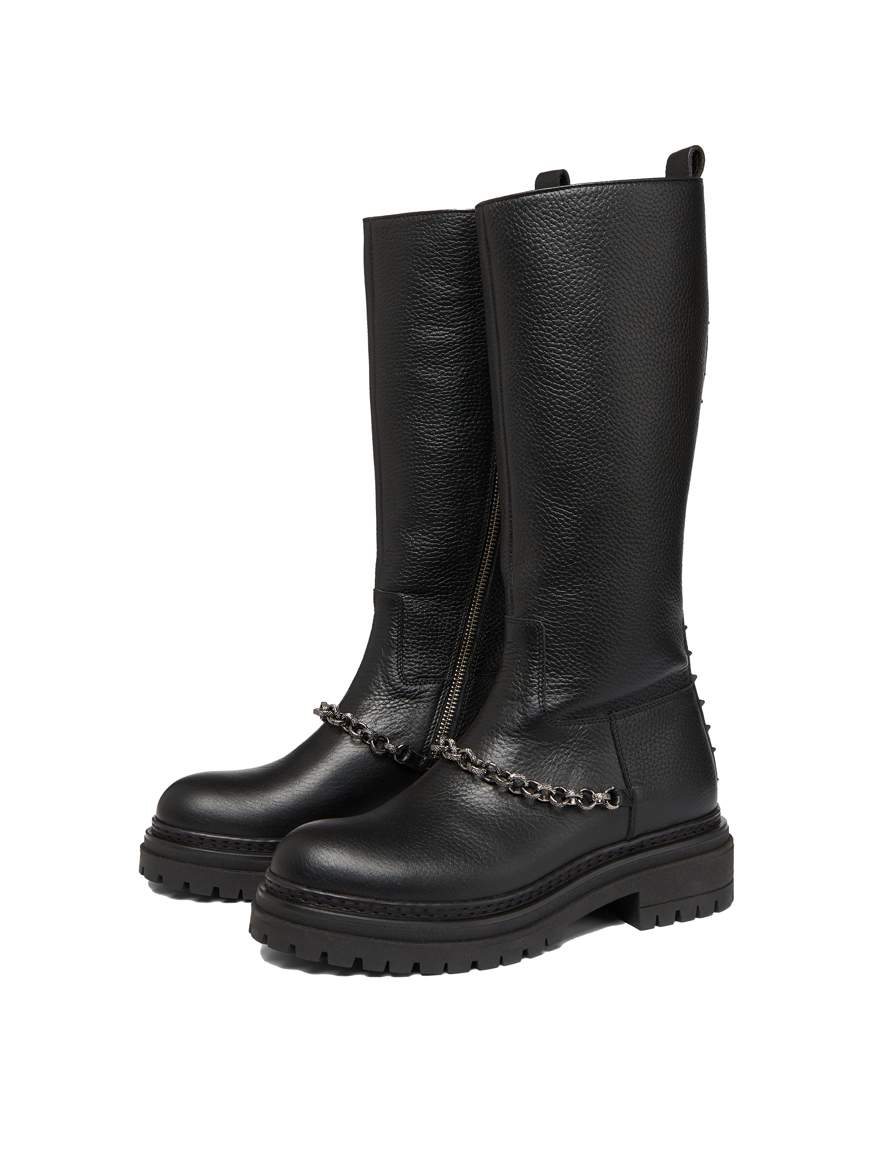 The high black boots are made of natural textured leather. The boots are decorated with a chain at the front and studs at the back. The model is complemented by a pull tab on the shaft and a zipper.