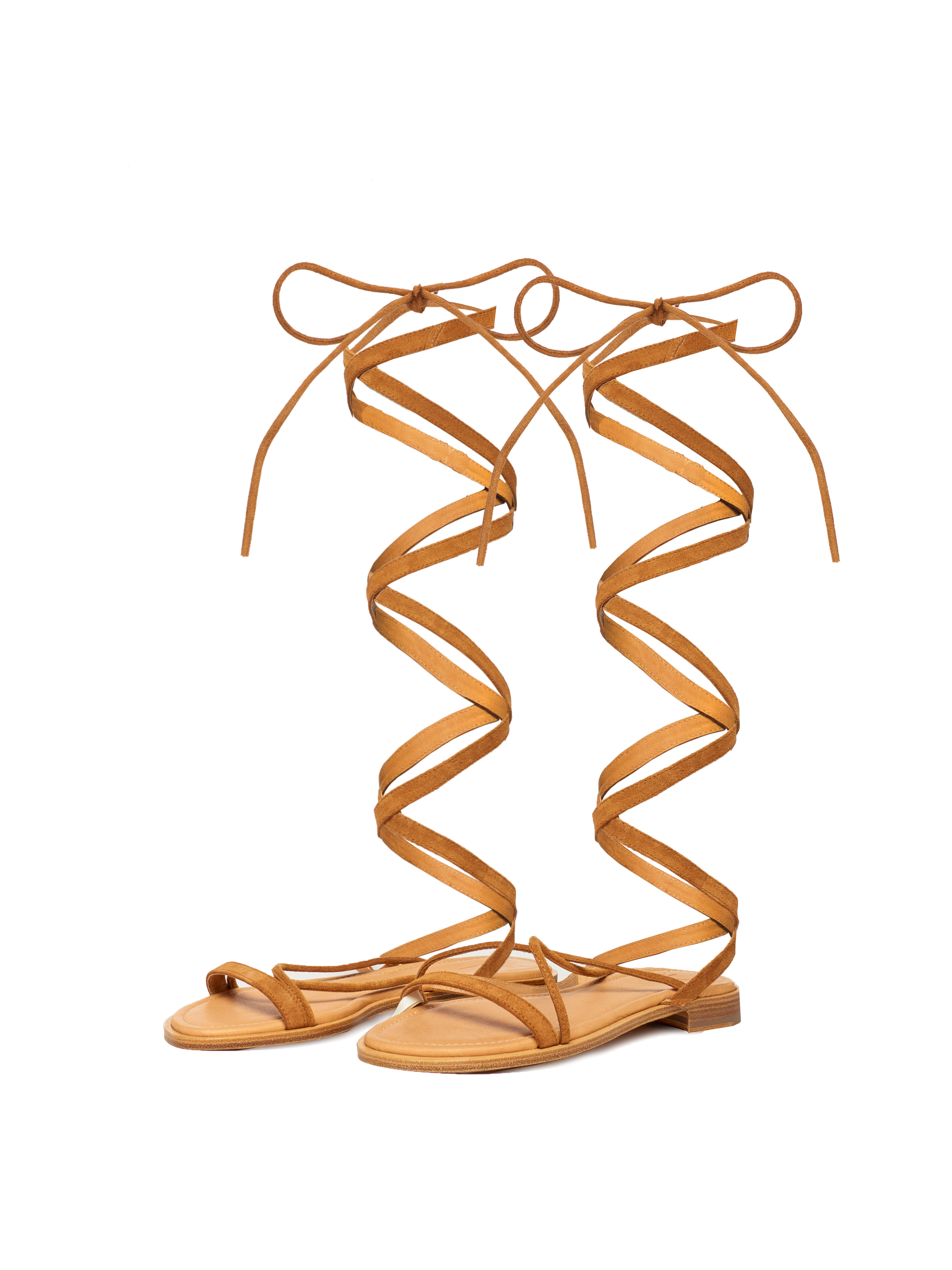 High gladiator sandals are made of brown suede. The crisscross wrap will emphasize the slenderness of your legs, and the small stacked heel will prevent fatigue after long walks.