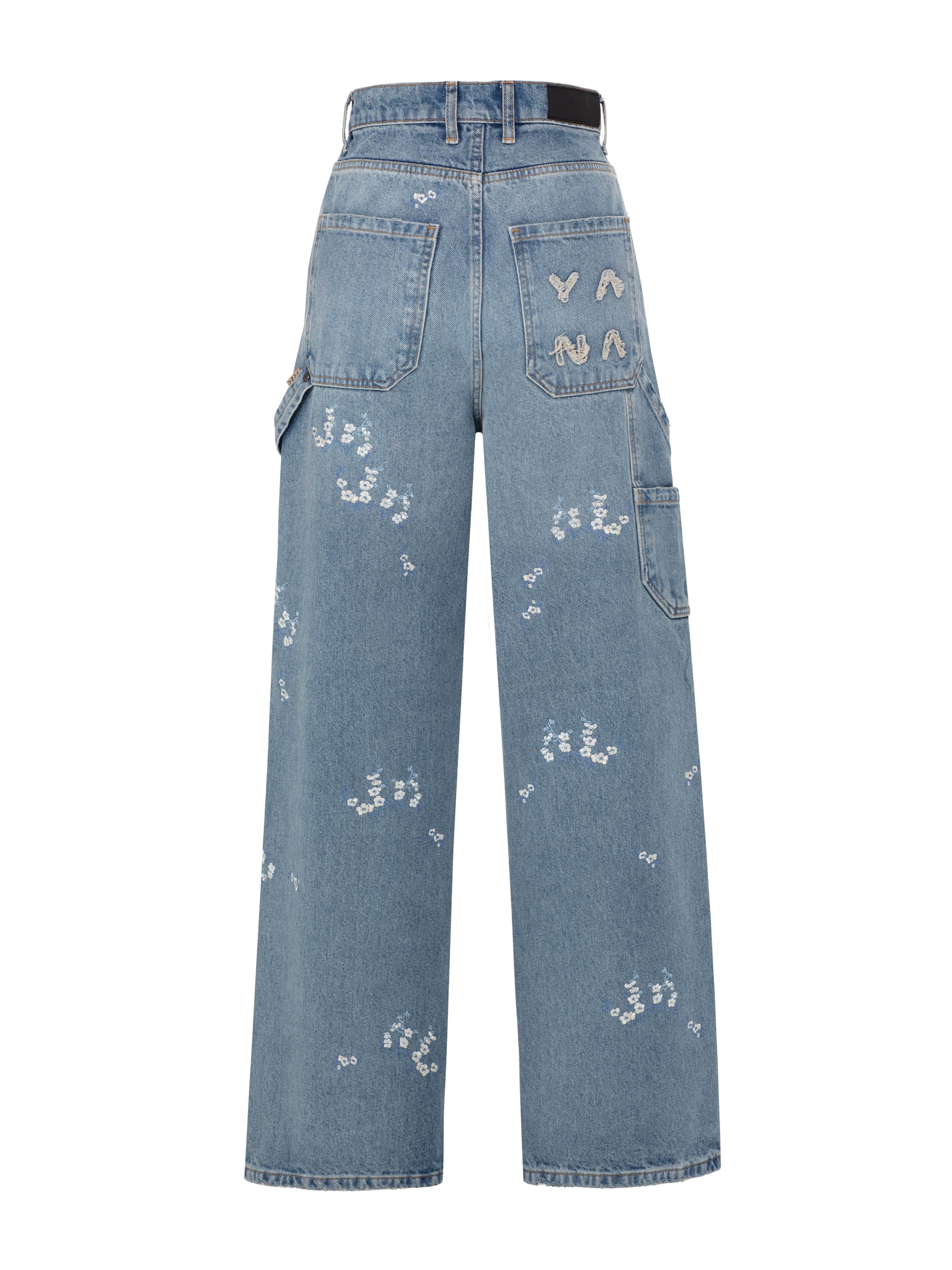 Wide blue jeans with a classic rise are the trendiest model that will make your basic look striking and expressive. The piece is decorated with delicate floral embroidery in the form of sakura.
