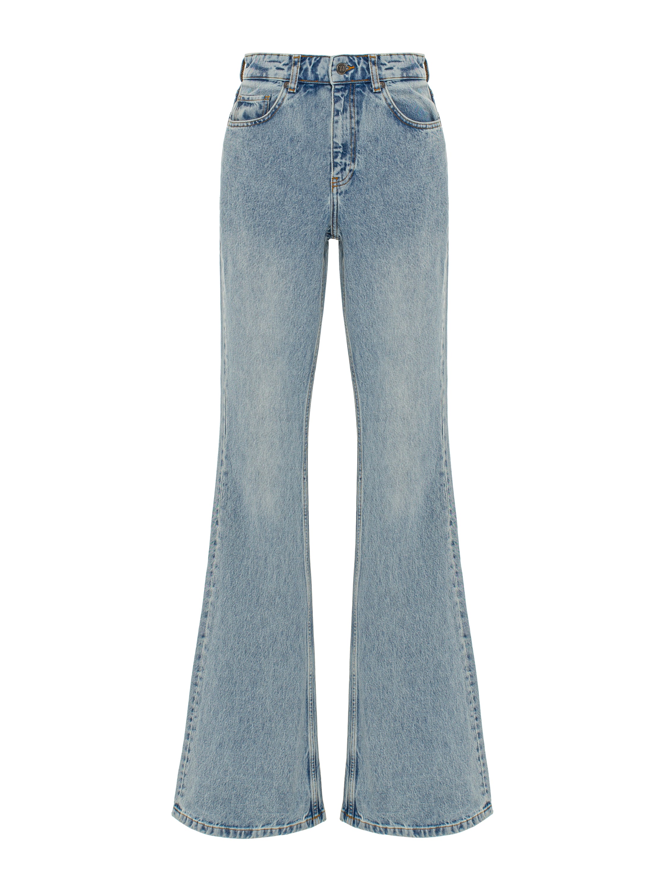 Flared Yana Jeans made of light blue denim are complemented by embroidery in the form of a teddy bear on the back pocket. The jeans fit comfortably and do not restrict movement. High-rise model.