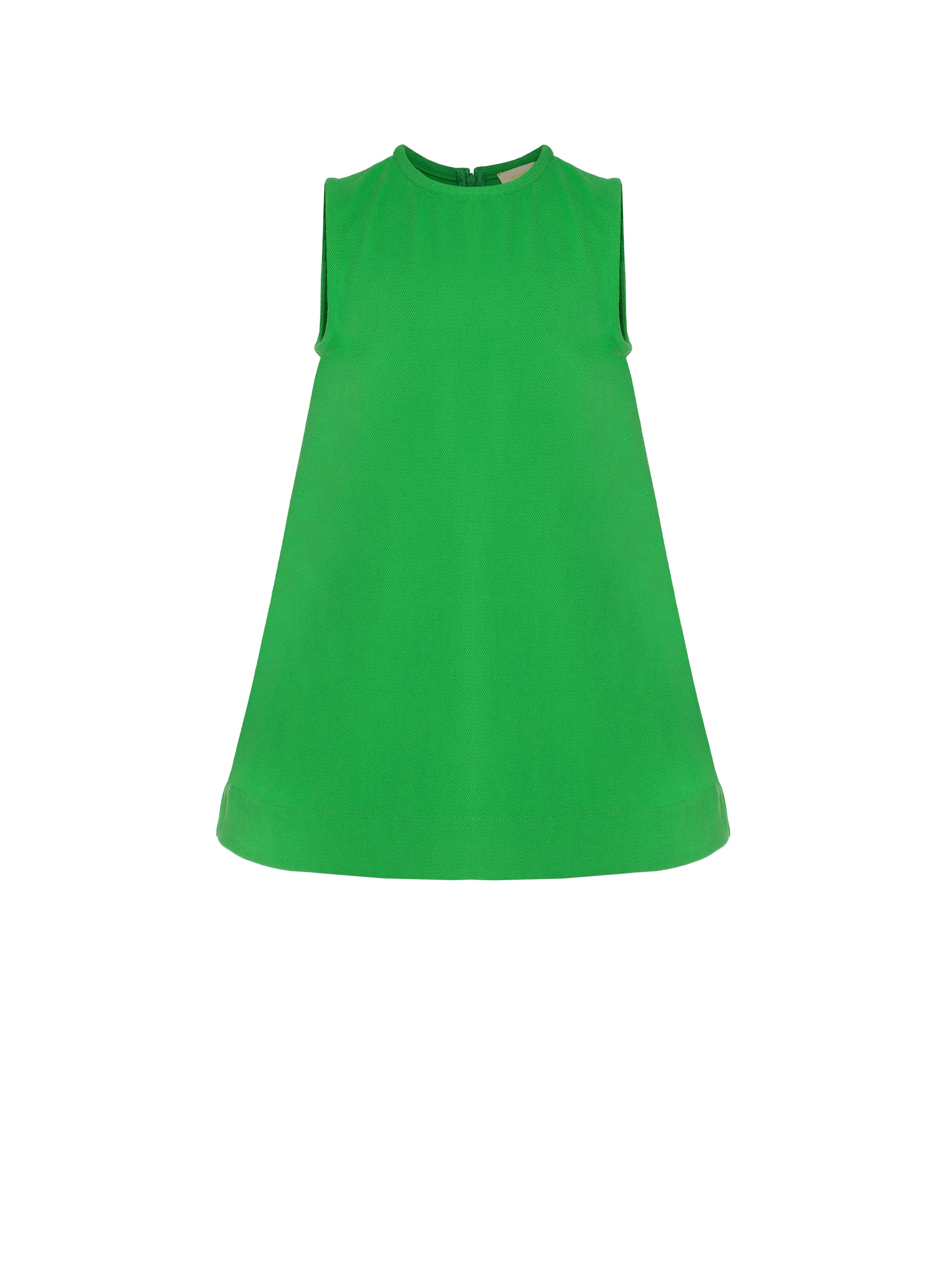 A green A-line children’s dress is made of practical denim. The solid-color loose-fit model is perfect for any occasion.