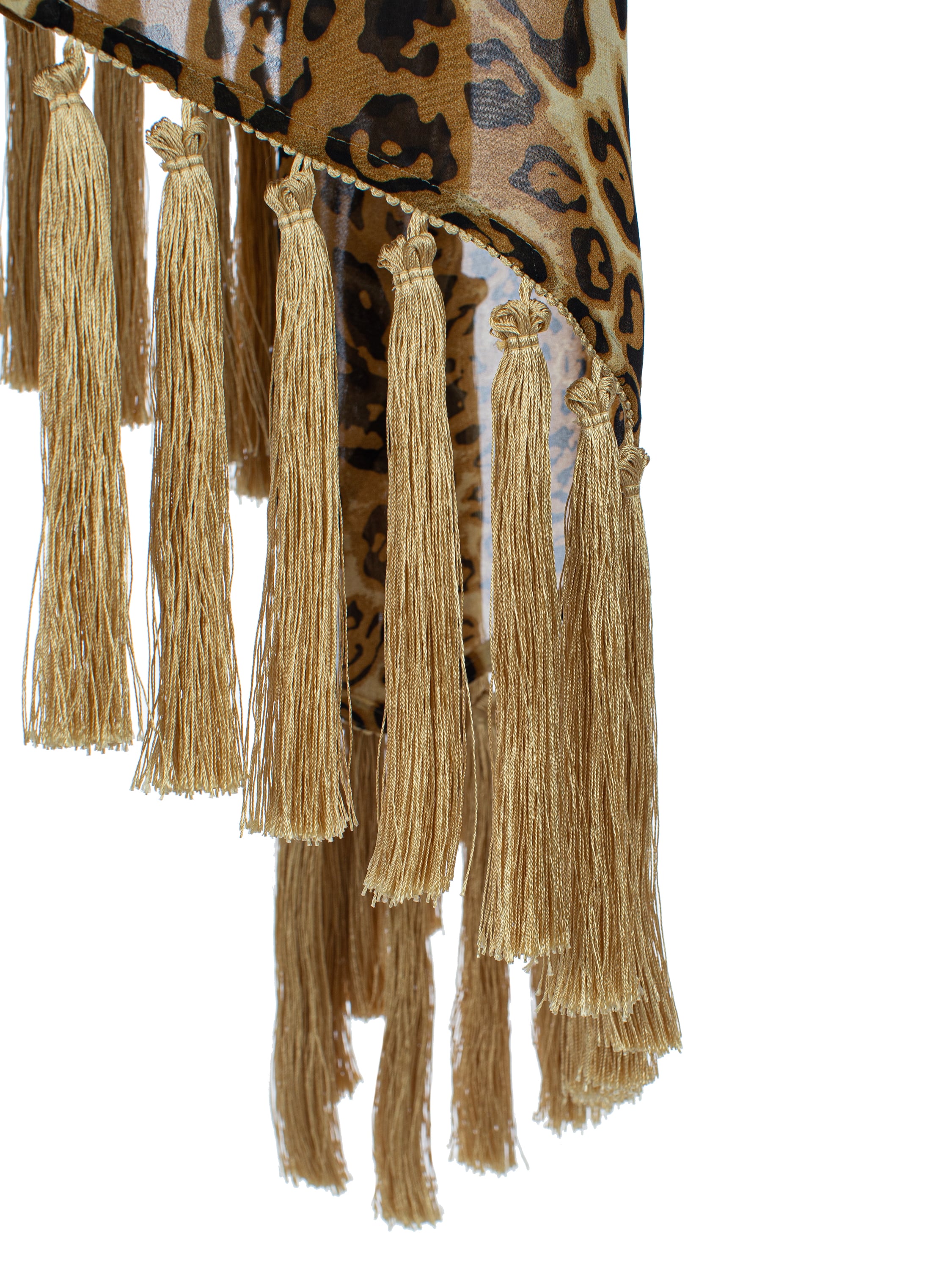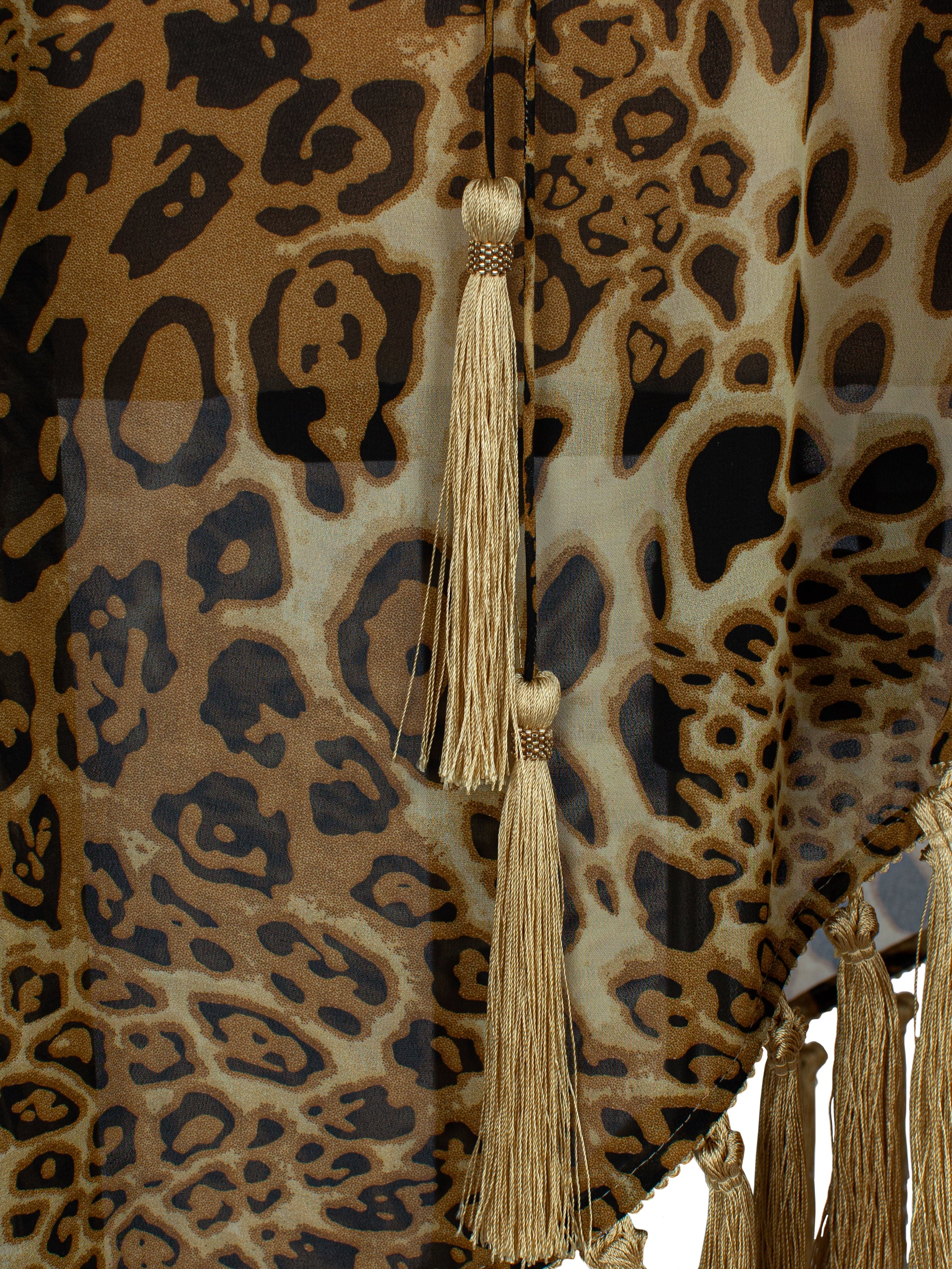 A beige mini dress with thin straps and a leopard print is made of airy chiffon. The asymmetric hem of the dress is decorated with matching fringe. The model is complemented by branded logo snap buttons at the front and tassel-tie straps at the back.