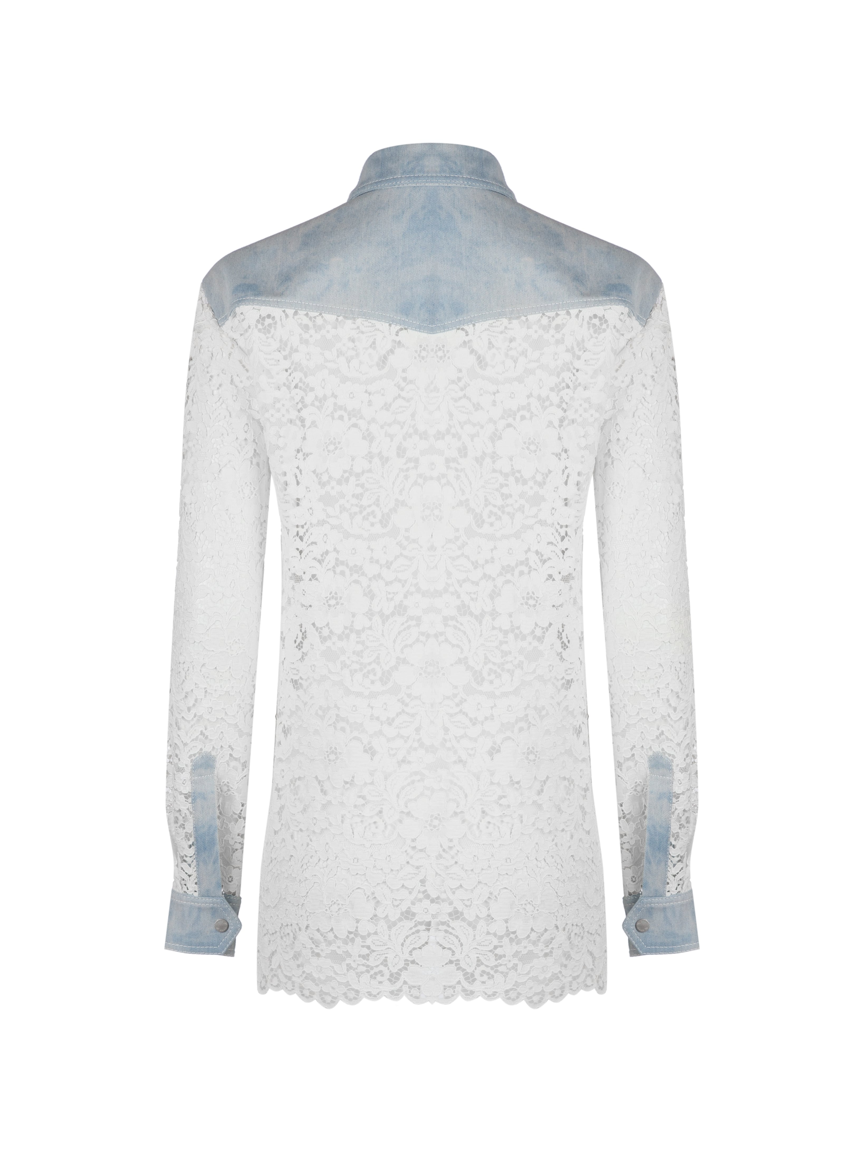 The white shirt is made of lace fabric and complemented by a yoke and shaped denim flaps on the pockets. The piece fastens with snaps at the front.