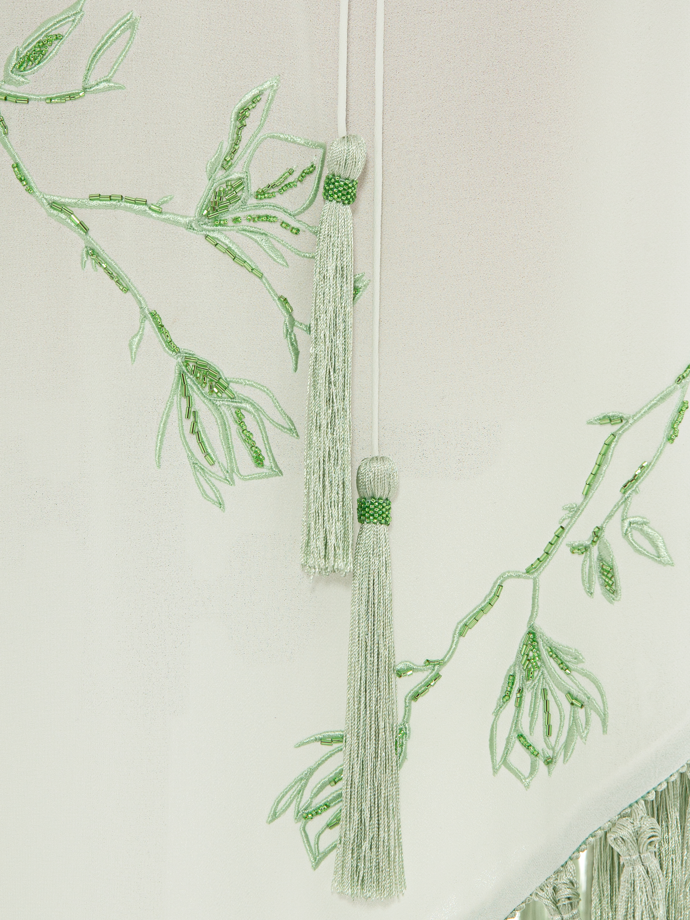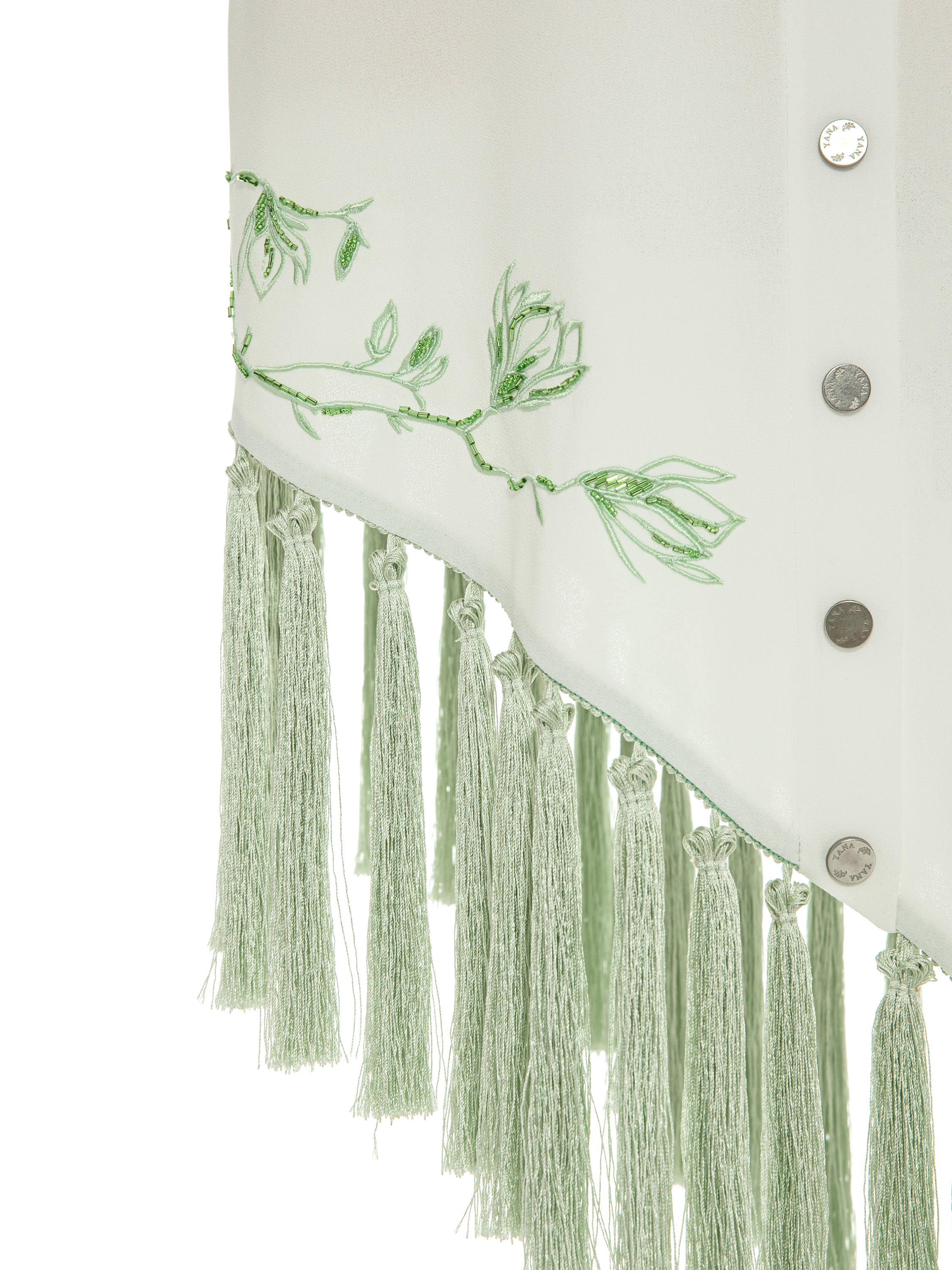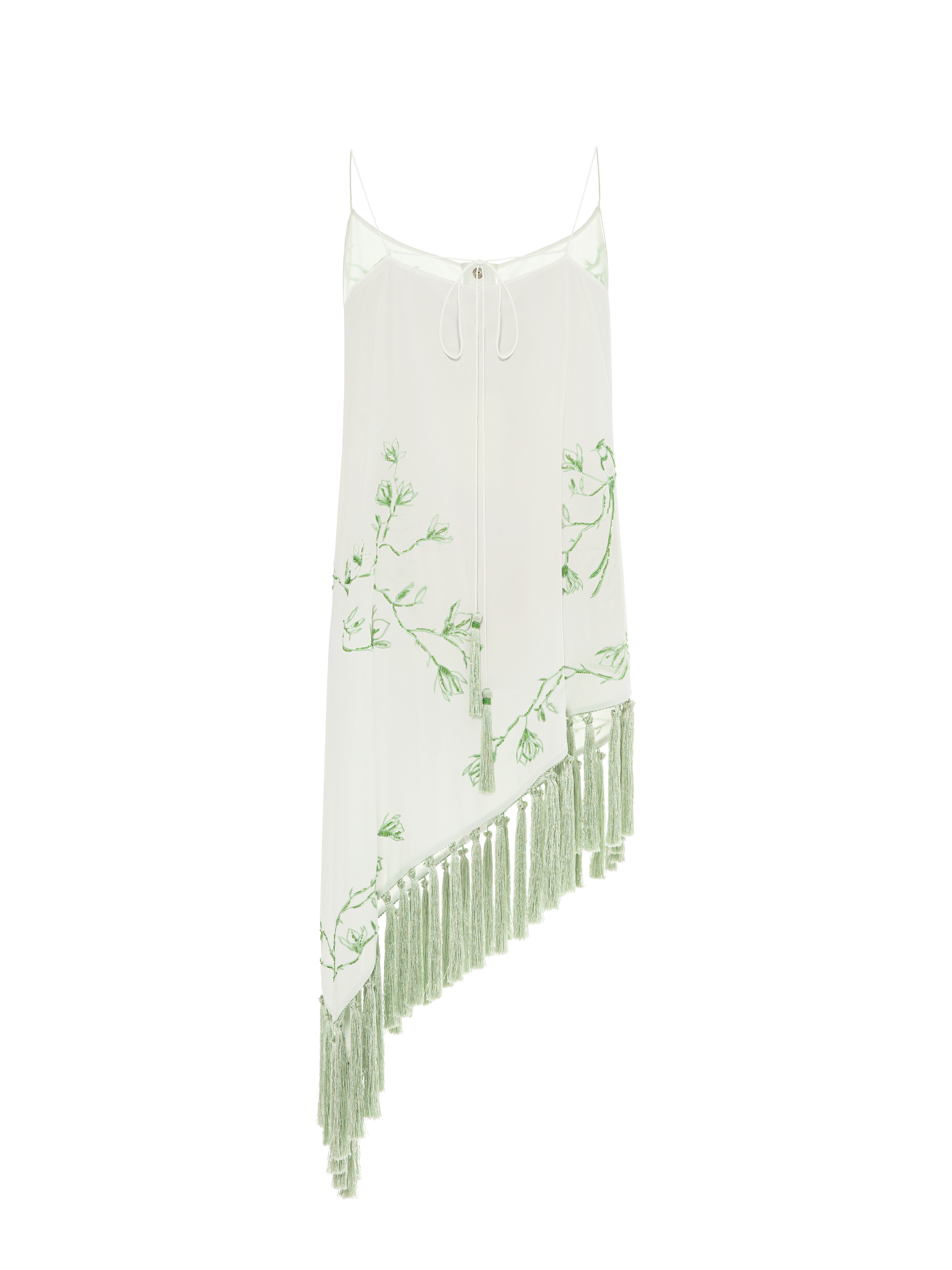 White mini dress with thin straps made of airy chiffon. The asymmetric hem of the dress is decorated with light green fringe. The model is complemented by bead embroidery in the shape of flowers and birds, branded logo snaps in the front and tassel ties on the back.
