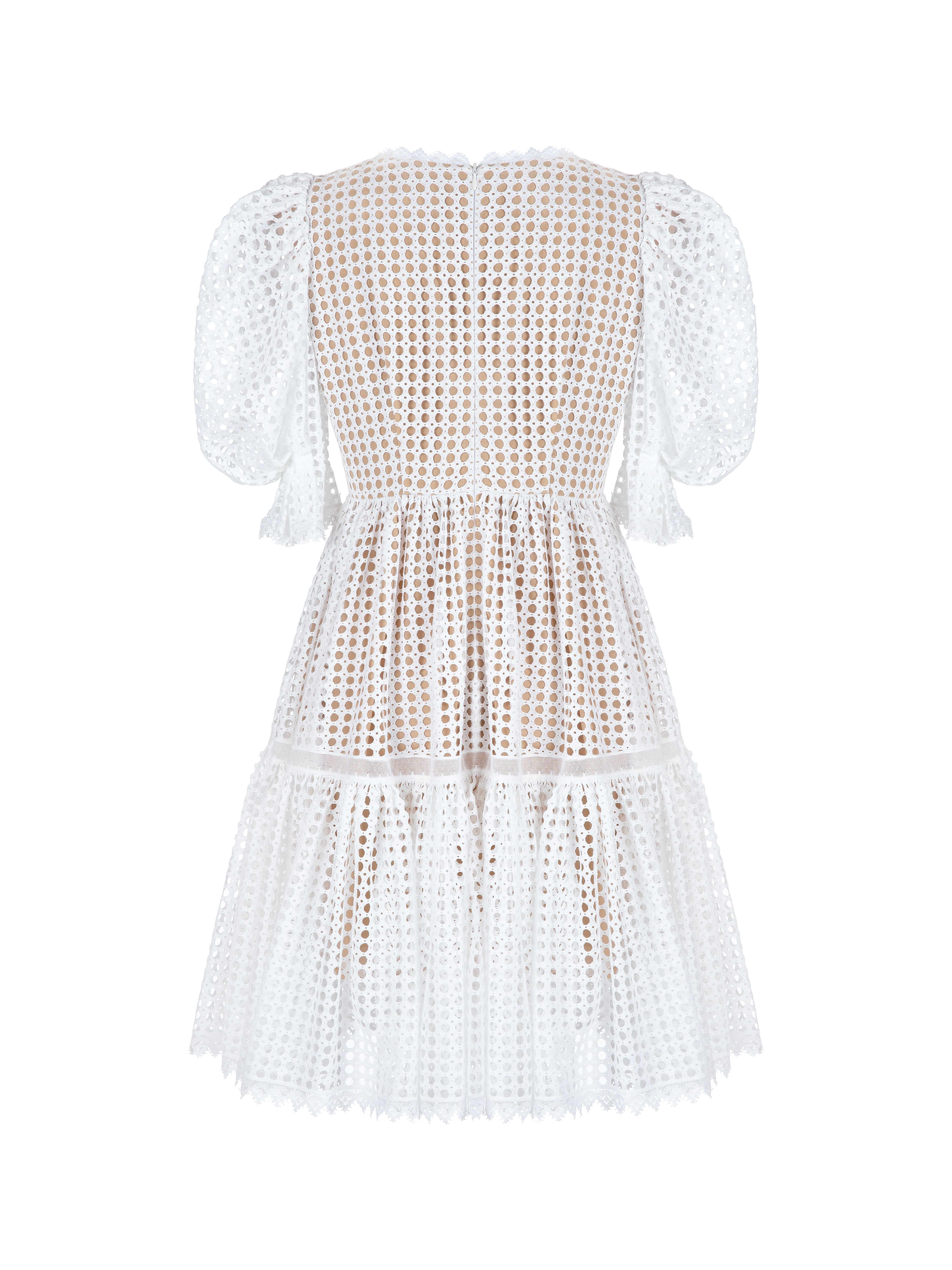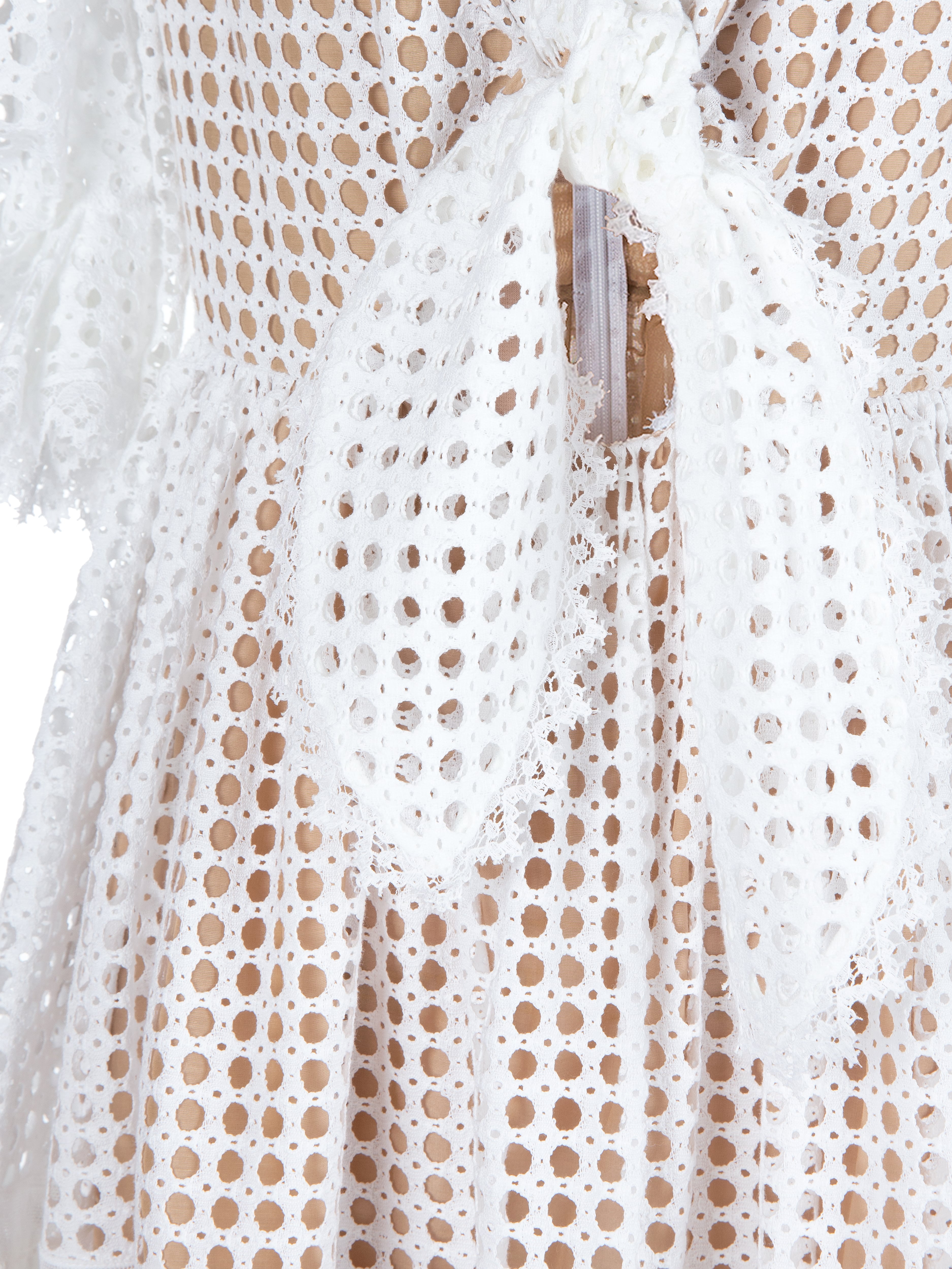 The white midi dress is made of perforated cotton fabric and complemented with a beige lining. Short puff sleeves, a ruffled hem, and a bow tie at the bust.