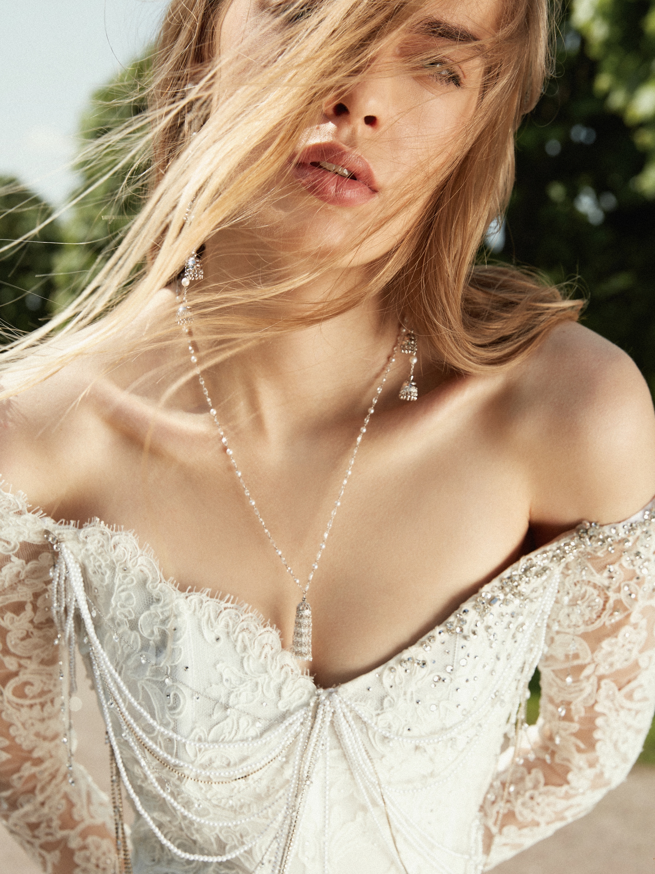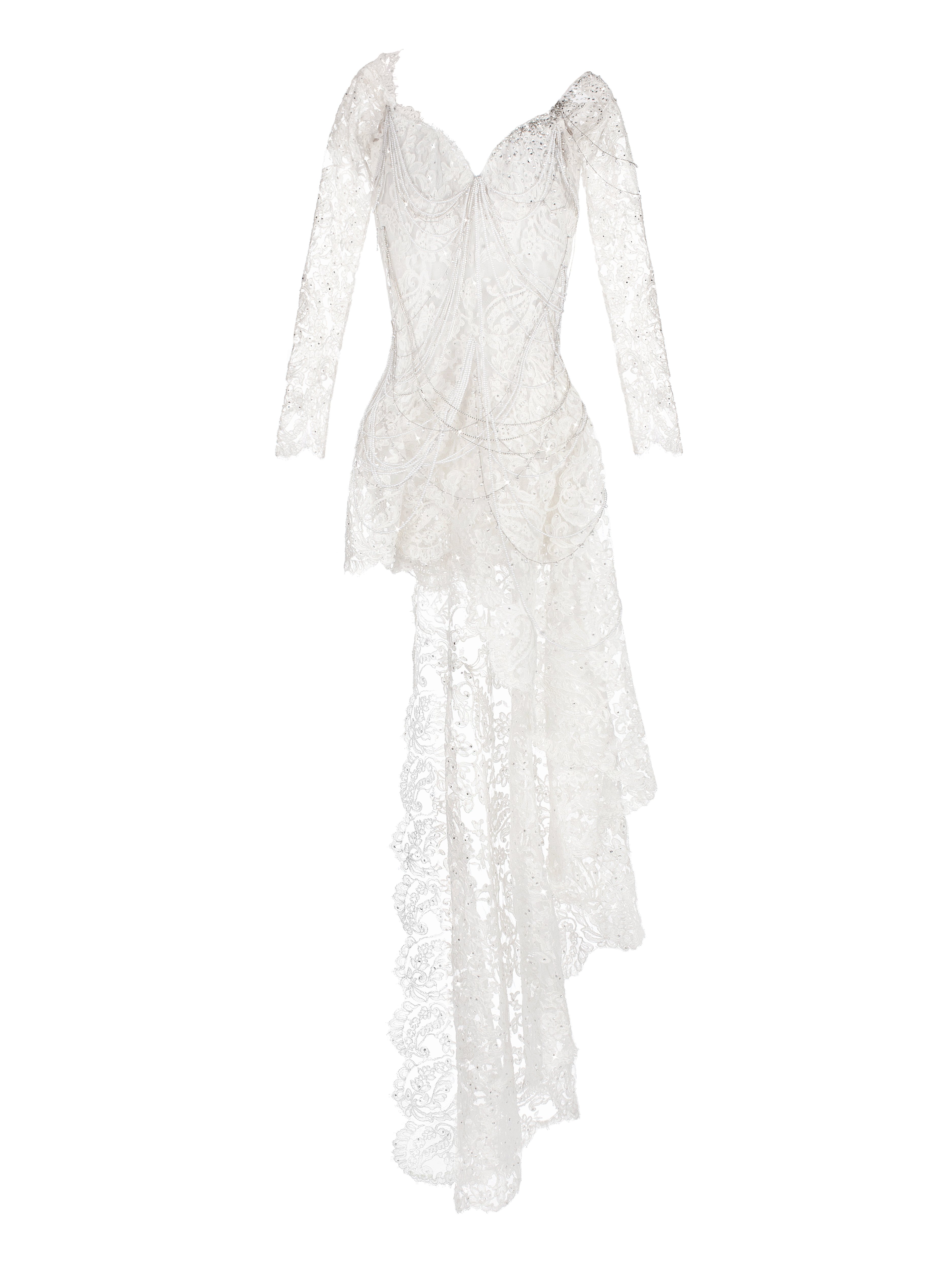 A white dress with an elongated hem, long sleeves and bare shoulders, made of lace, will be an ideal choice for a flawless evening look. The brand’s craftsmen manually decorated the model with rhinestones and pearl and silver chains with crystal stones.