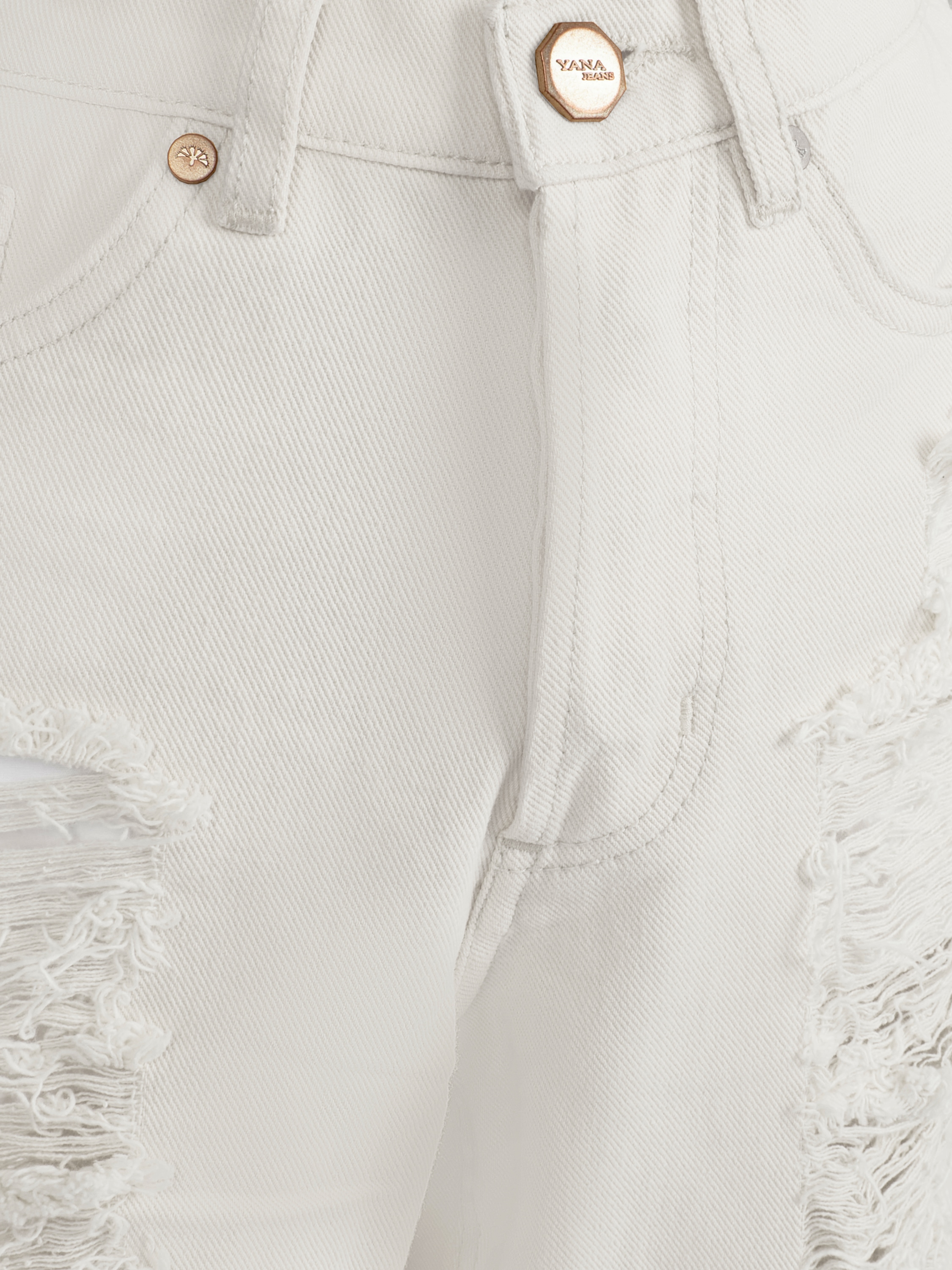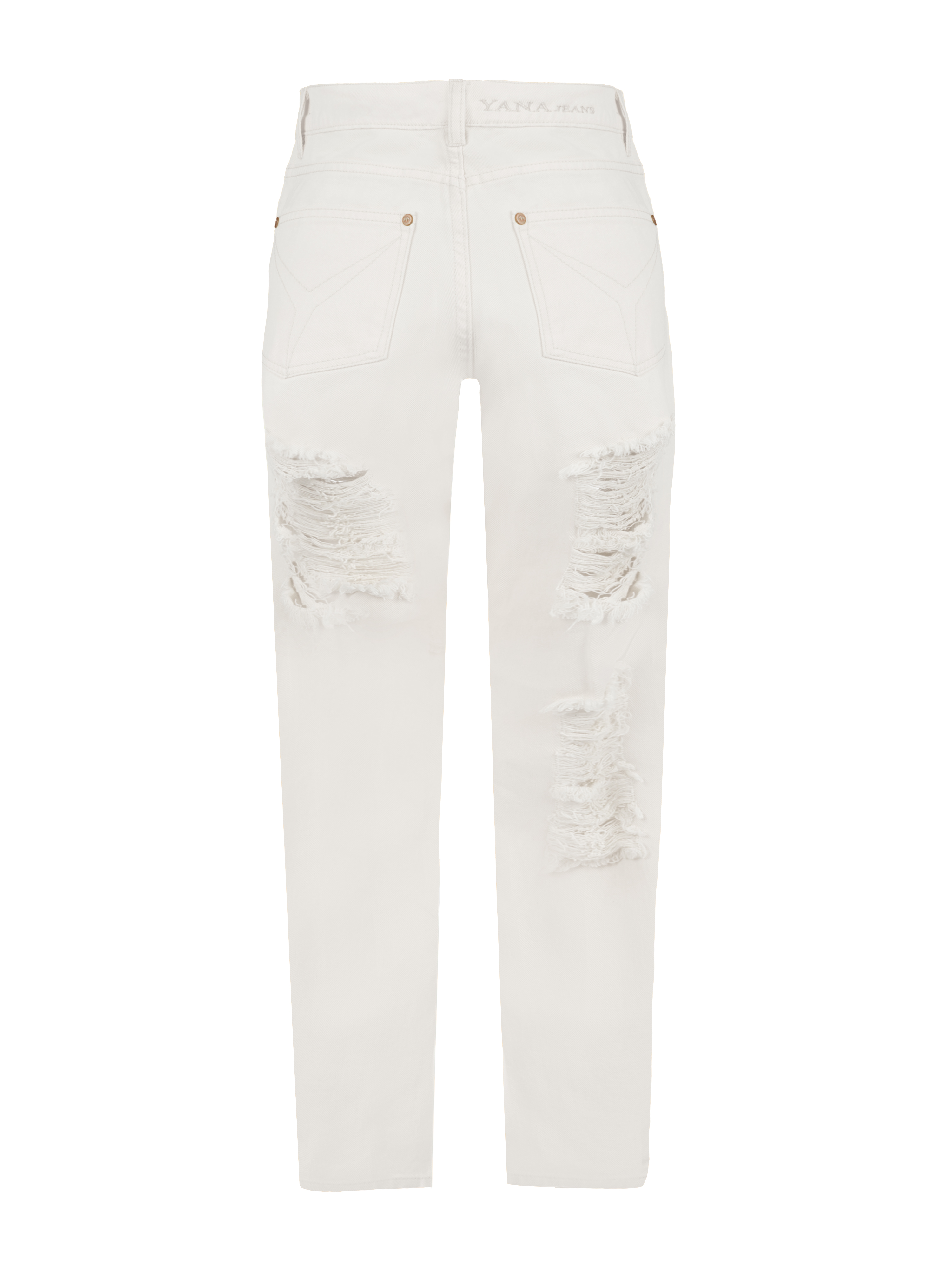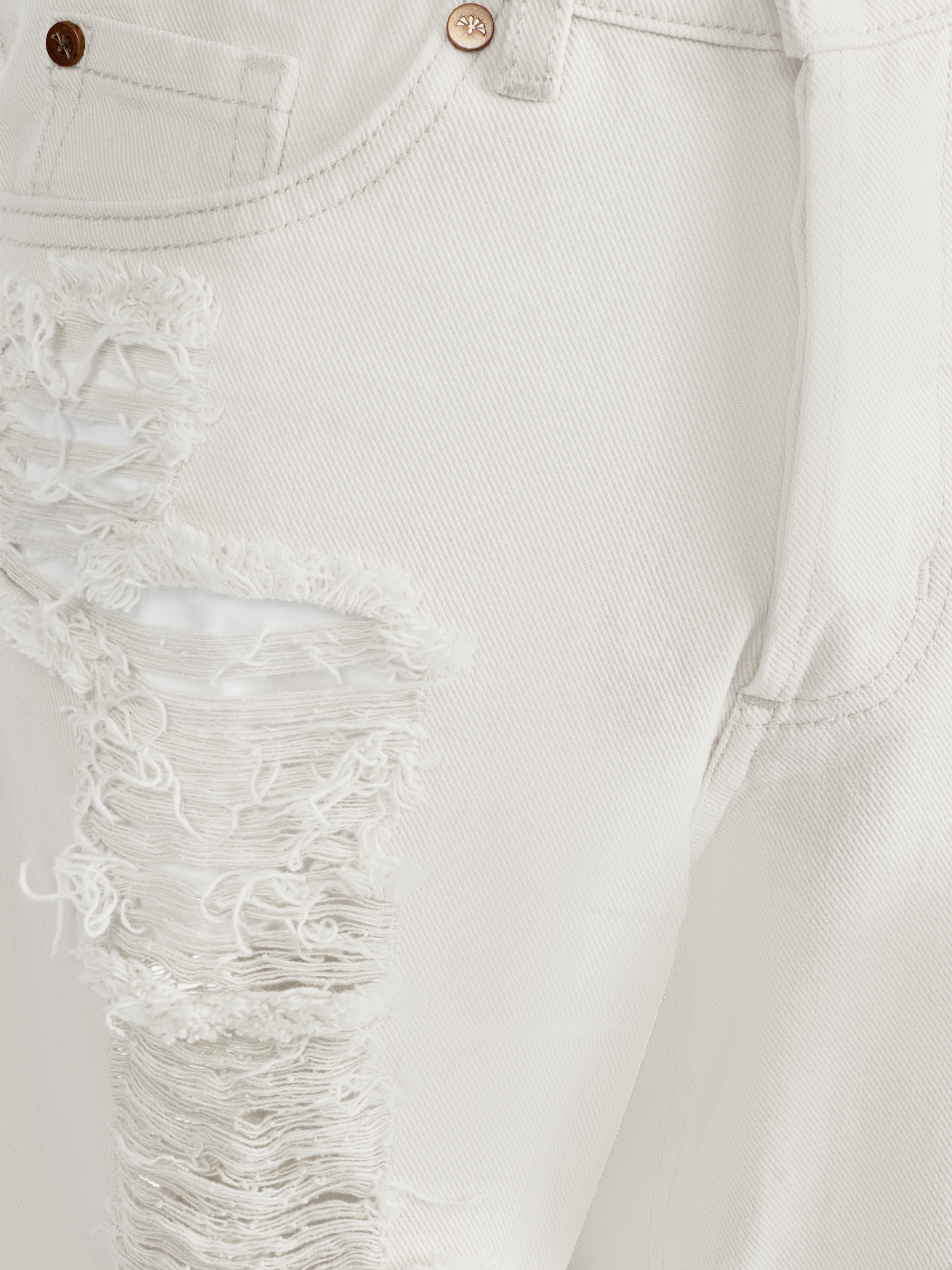 Snow-white straight-cut jeans with a classic rise are made of pure cotton. Pronounced decorative scuffs on the legs set a relaxed mood. The jeans fit comfortably and do not restrict movement.