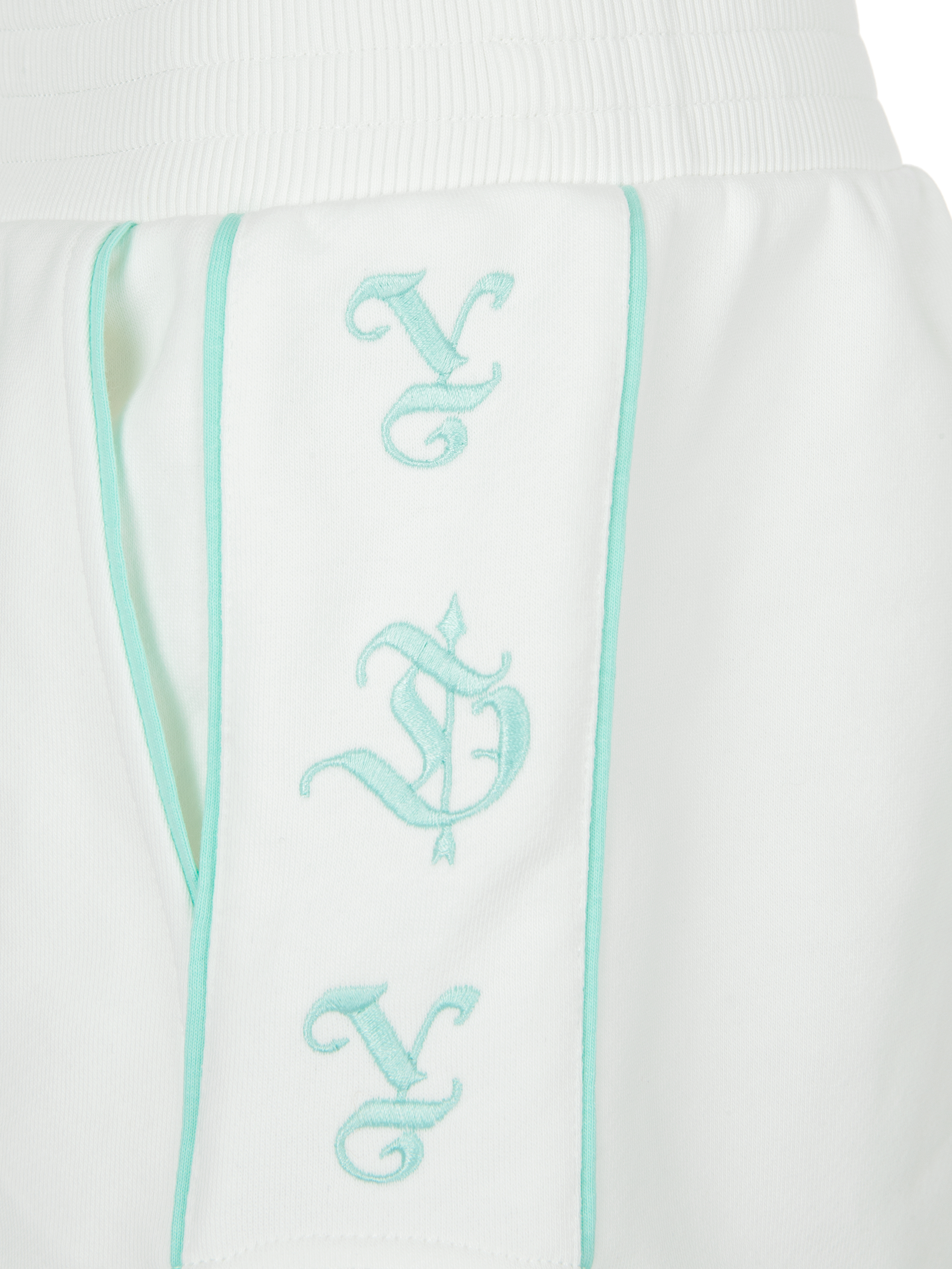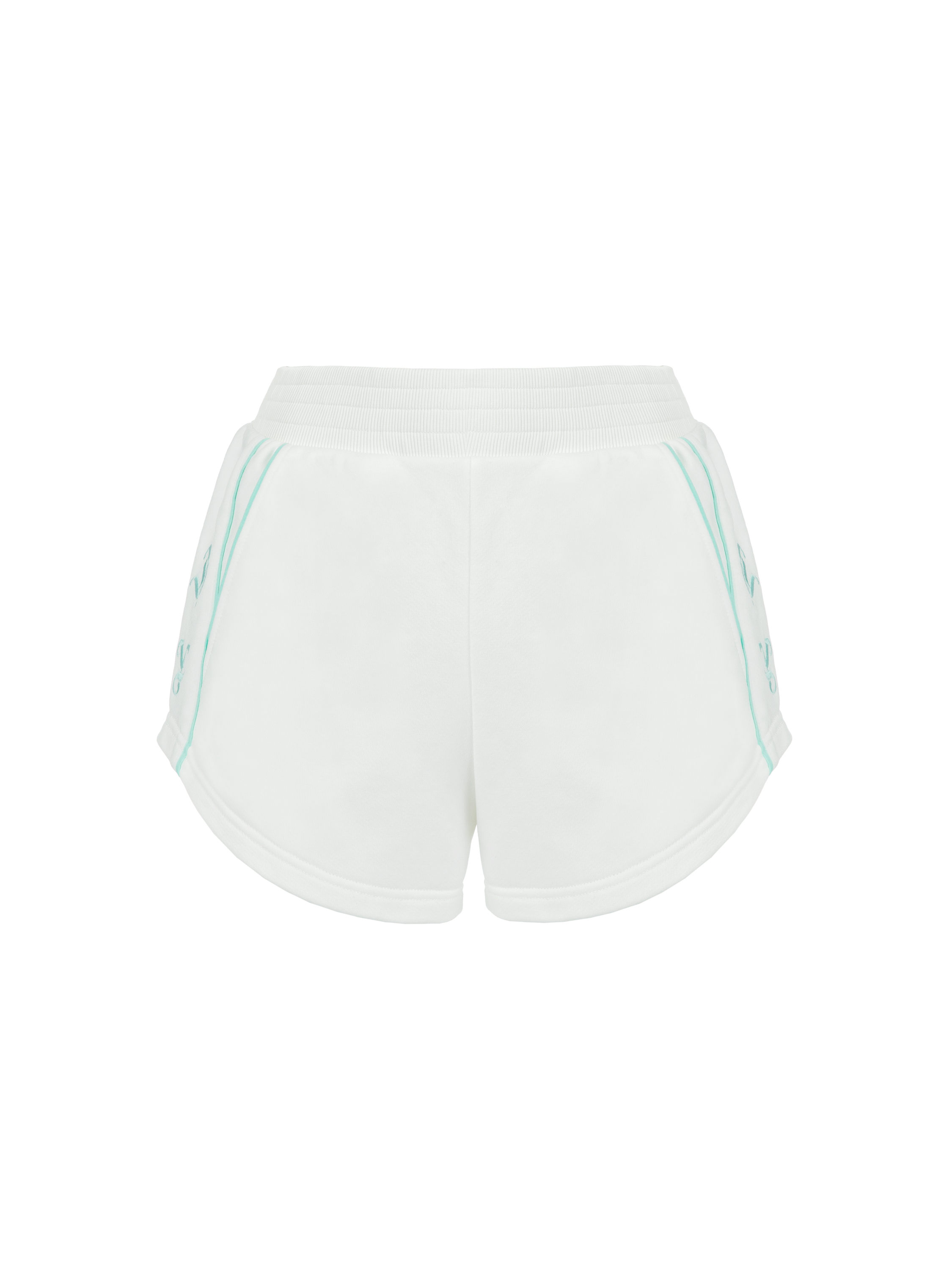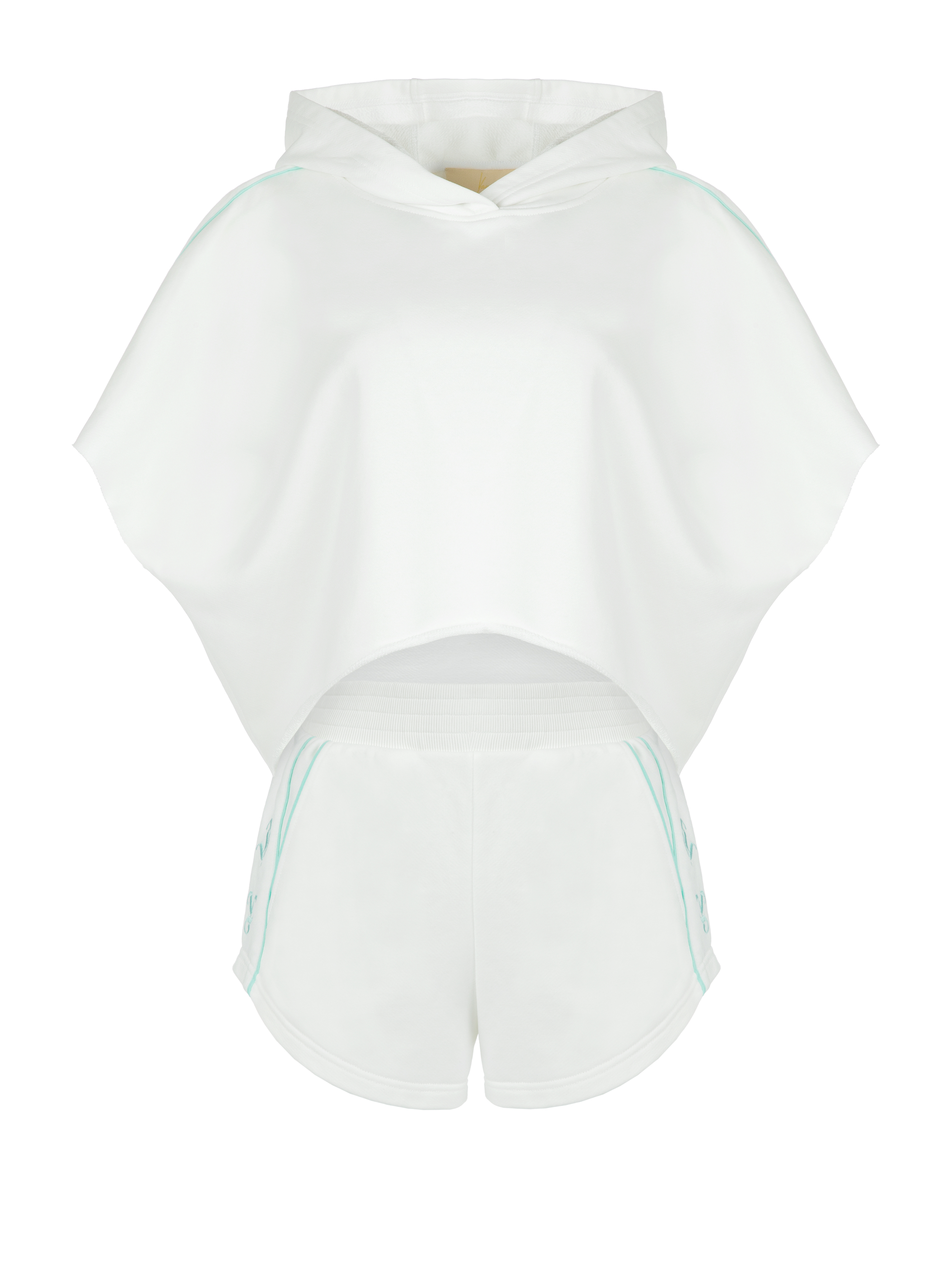 A white summer knit set consists of an oversized square-cut sleeveless hoodie and short elastic-waist shorts. The design is complemented by side stripes with mint logo embroidery.