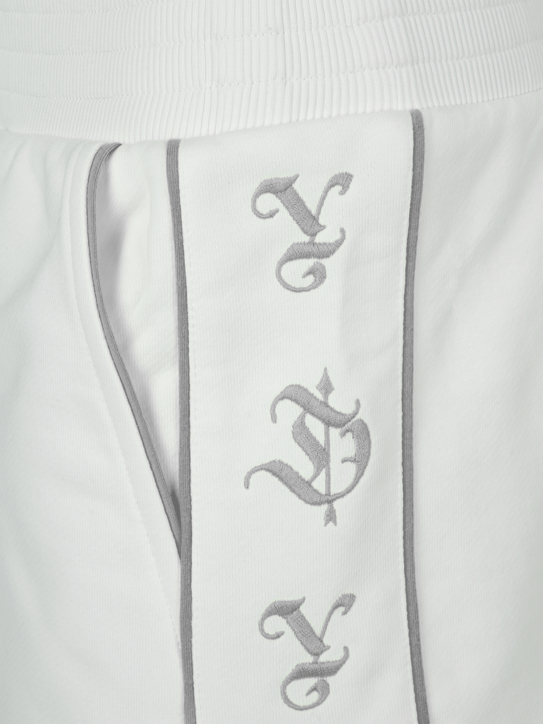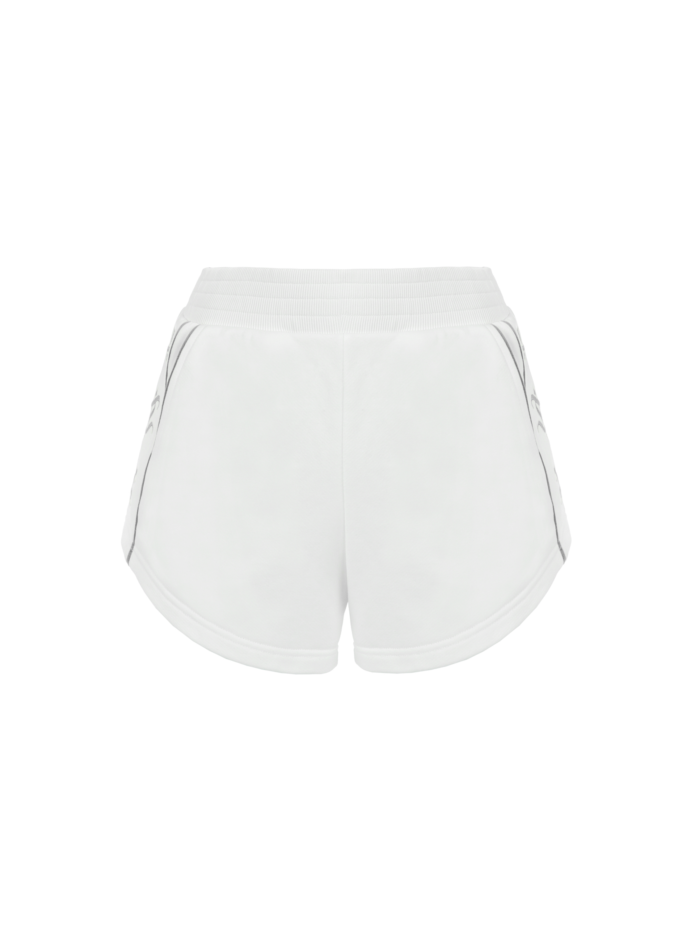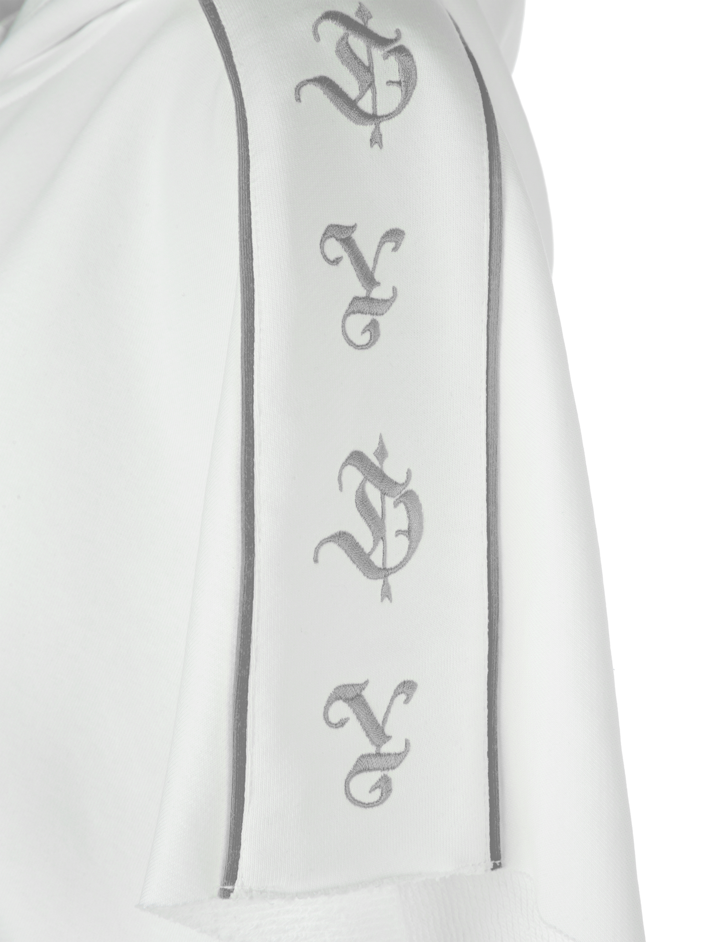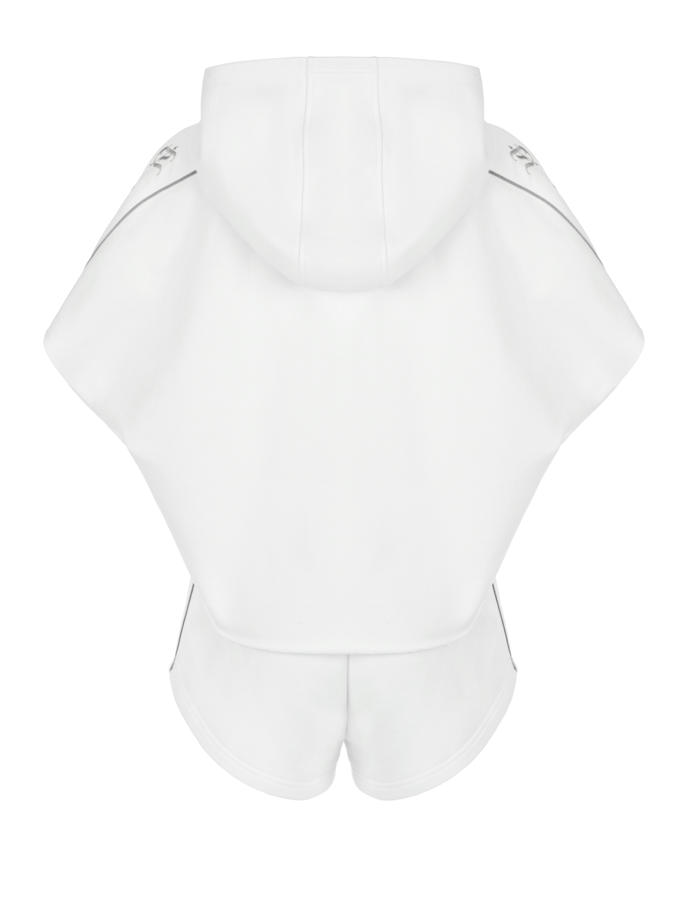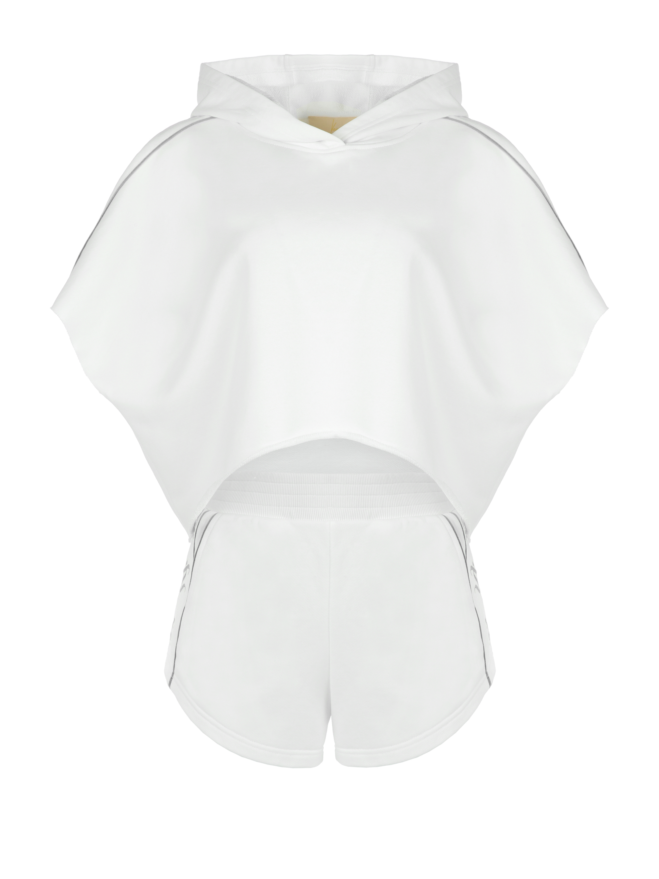 A white summer knit suit consists of a loose square-cut sleeveless hoodie and short elastic-waist shorts. The model is complemented by side stripes with gray embroidery in the form of the brand logo.