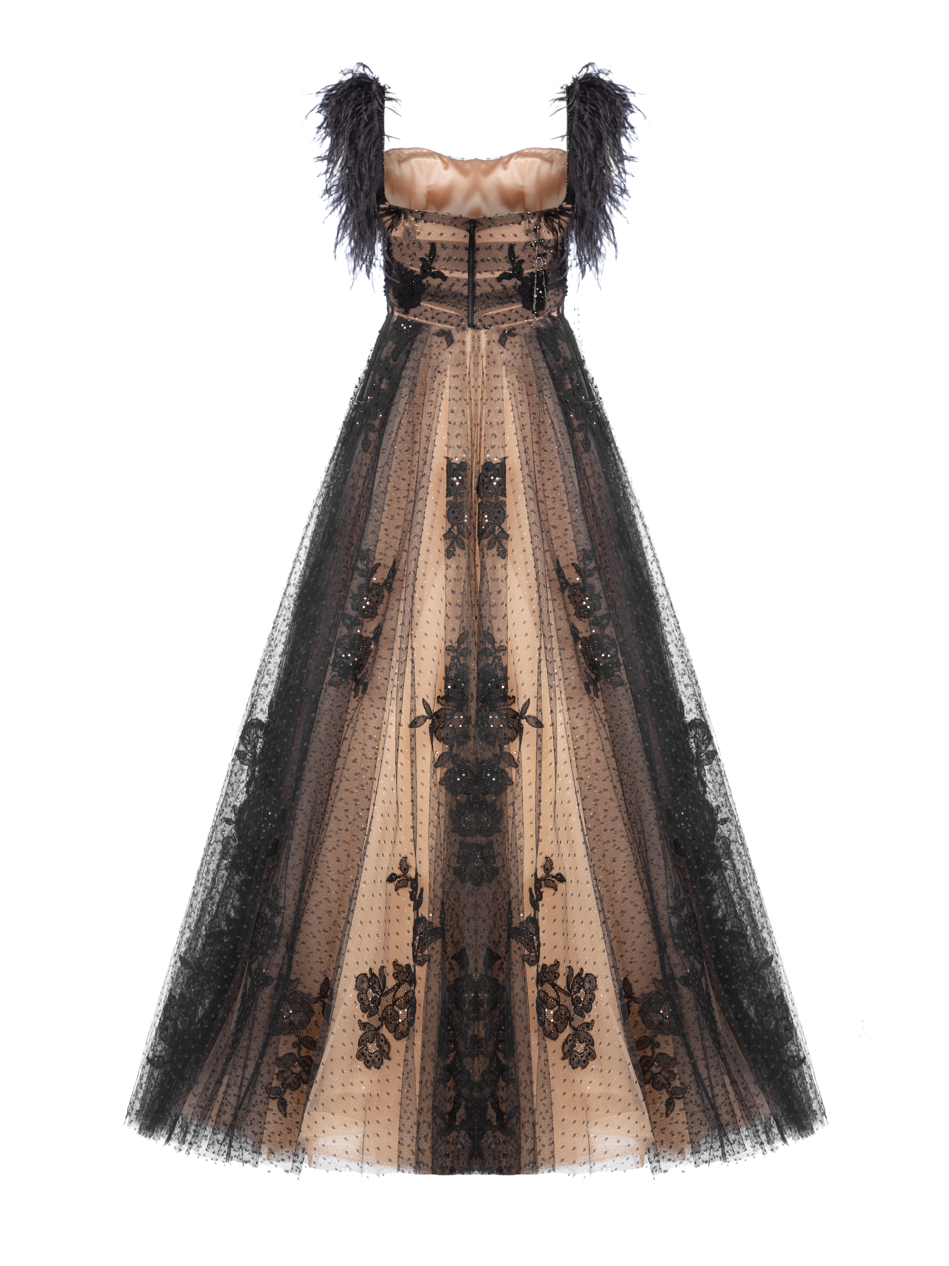 A maxi dress made of beige and black mesh and cord lace with a floral pattern. The dress is decorated with sparkling Swarovski rhinestones, silver chains with black heart-shaped stones and black feathers.