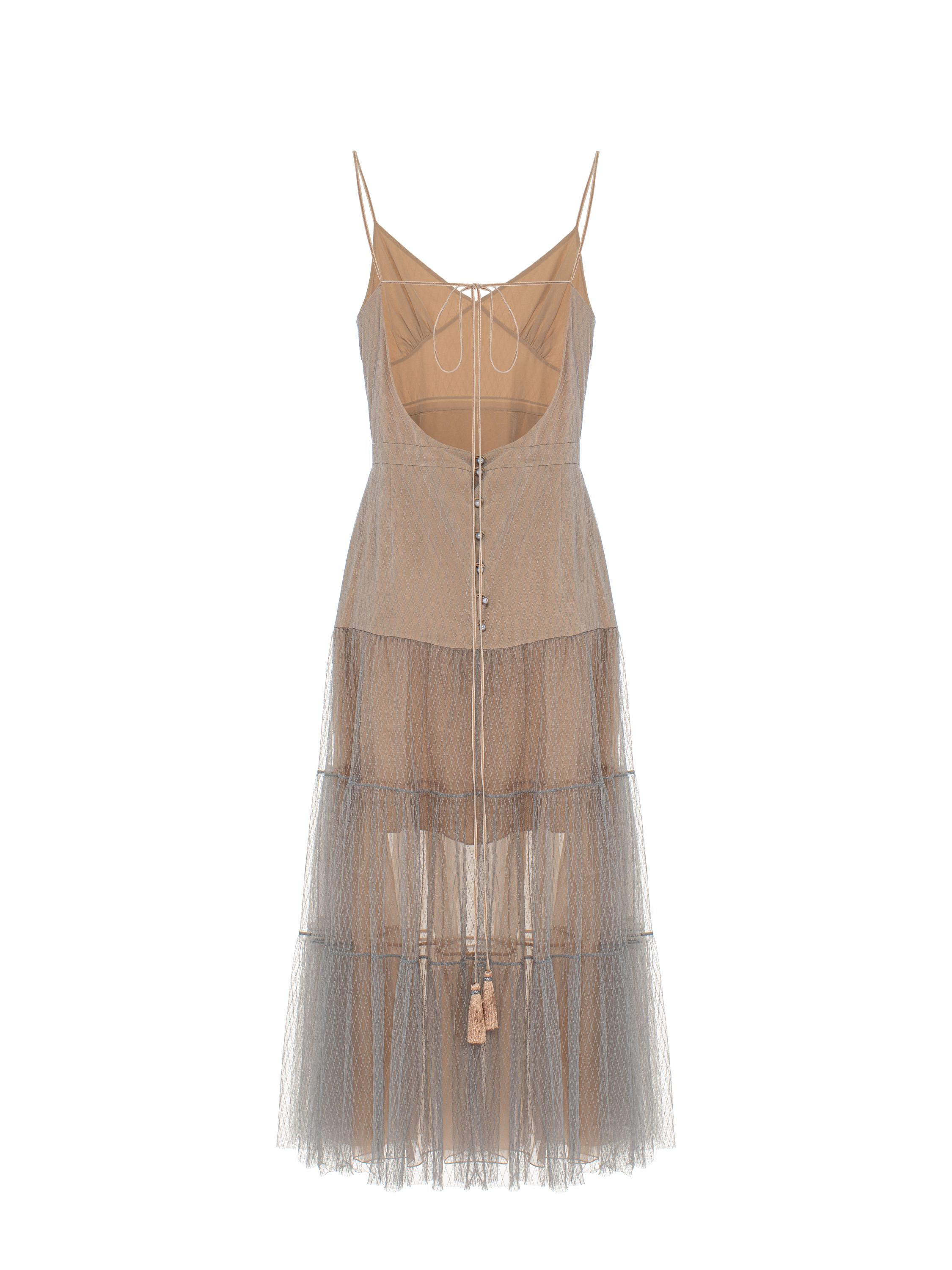 A beige midi dress on thin straps with an open back is made of semi-sheer mesh with diamond-shaped embroidery. The hem is cut in three tiers and complemented by an underskirt made of organza. Fastening with pearl buttons and tassel ties at the back.