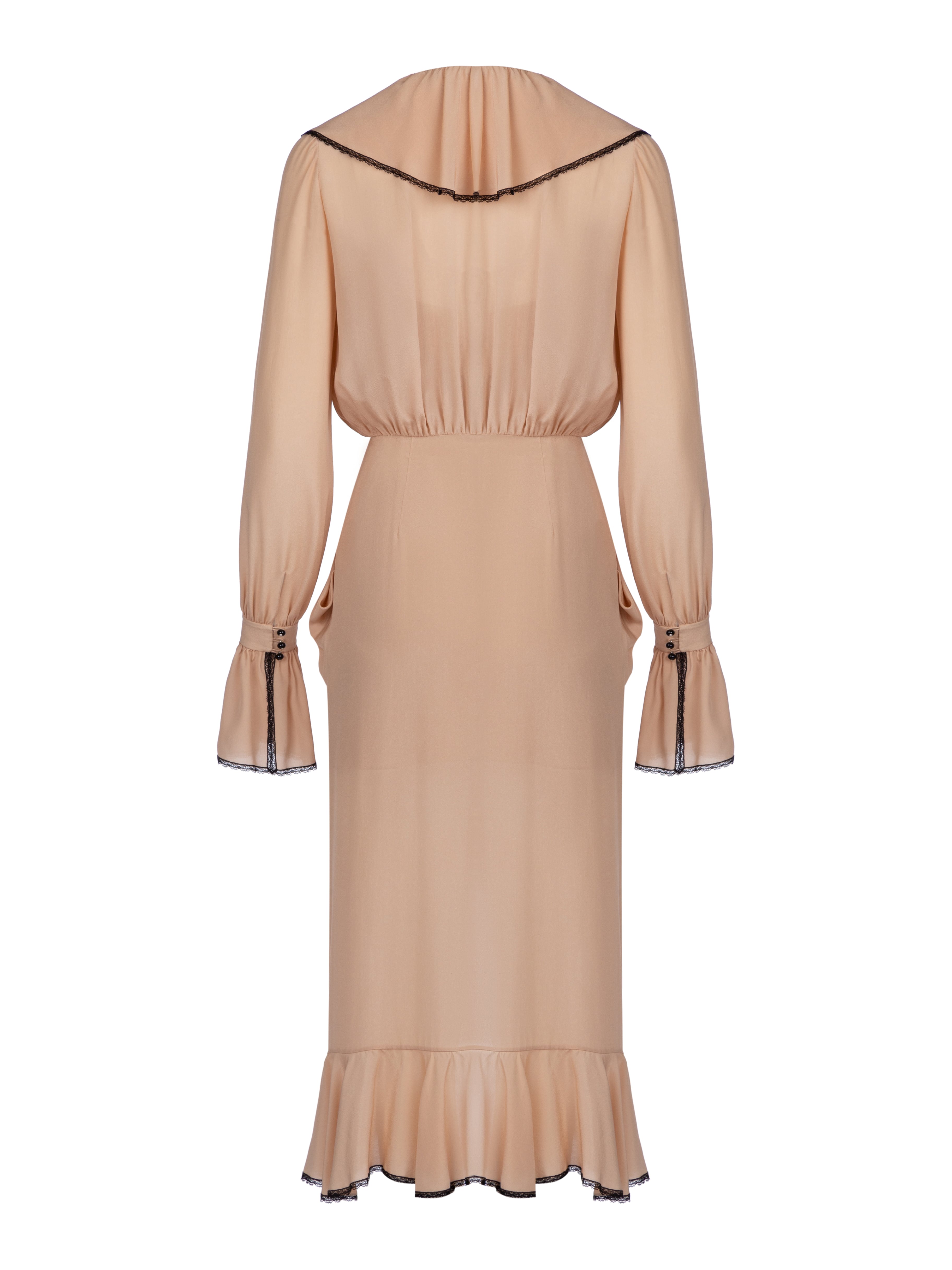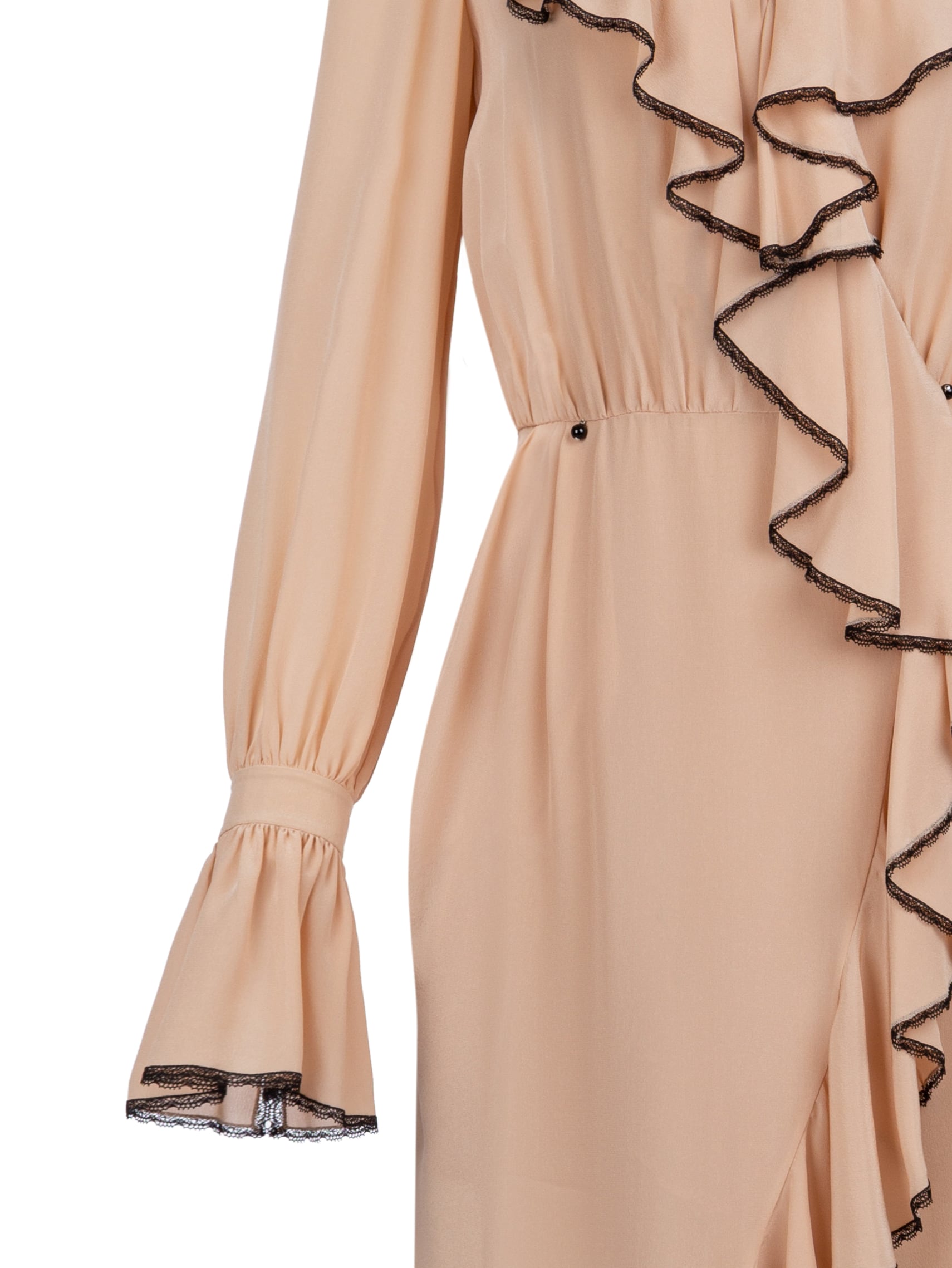 The beige midi dress with long sleeves is made of silk. The dress has a wrap cut and is complemented by ruffles with black lace.
