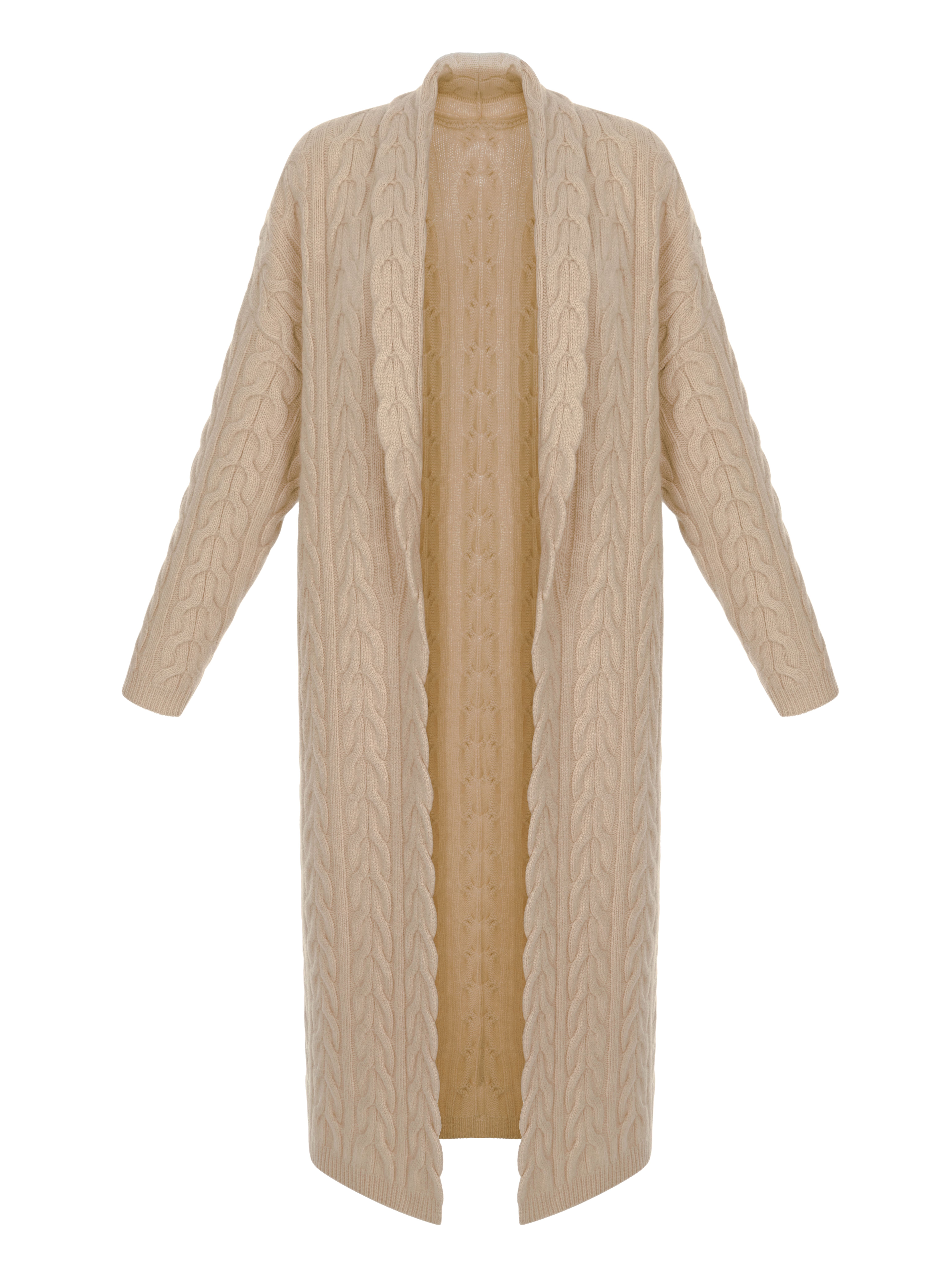 The knitted coat-cardigan is made of 100% cashmere in a light beige shade. Cable knit, open front, shawl collar.