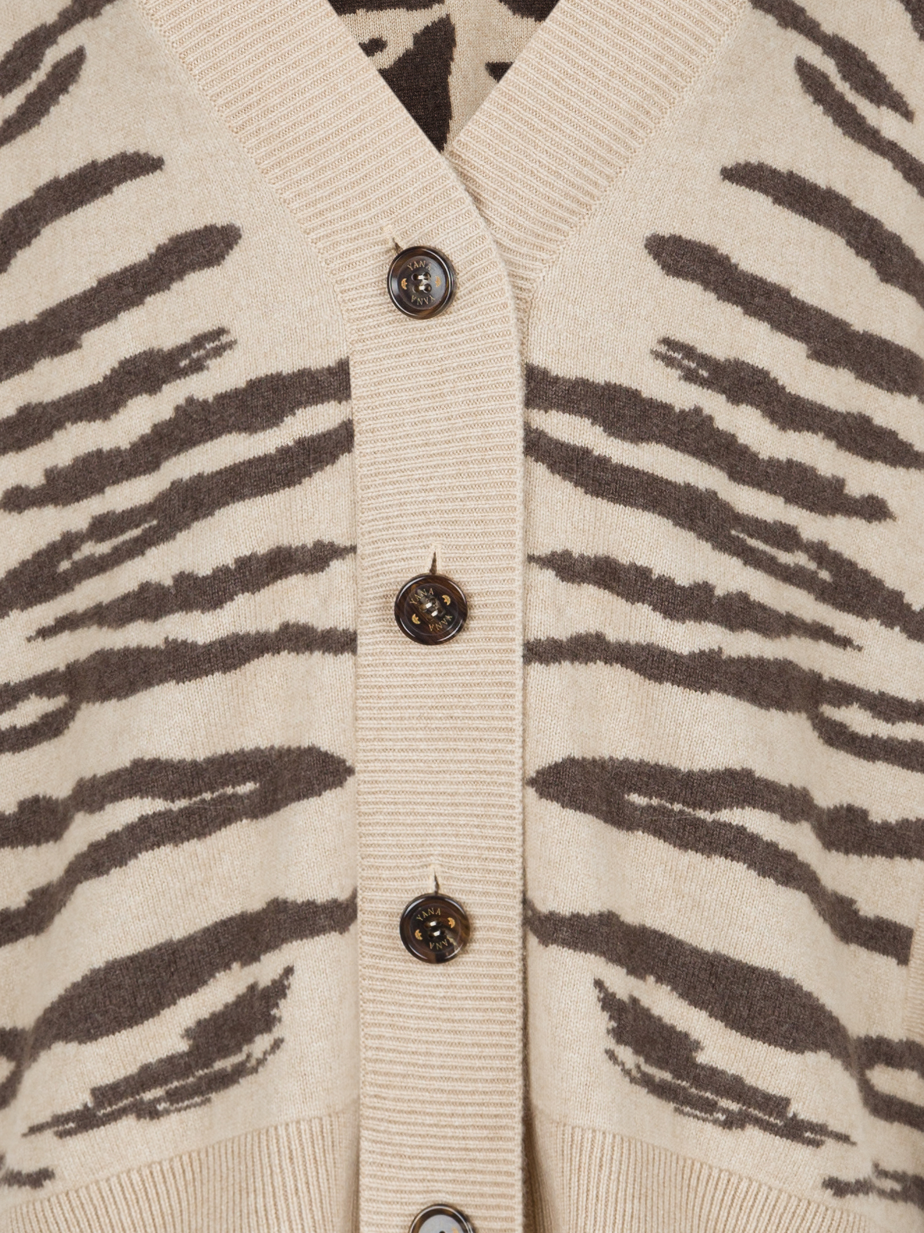 A beige cardigan with a brown animal print is made of natural cashmere and complemented with a closure of brown buttons.